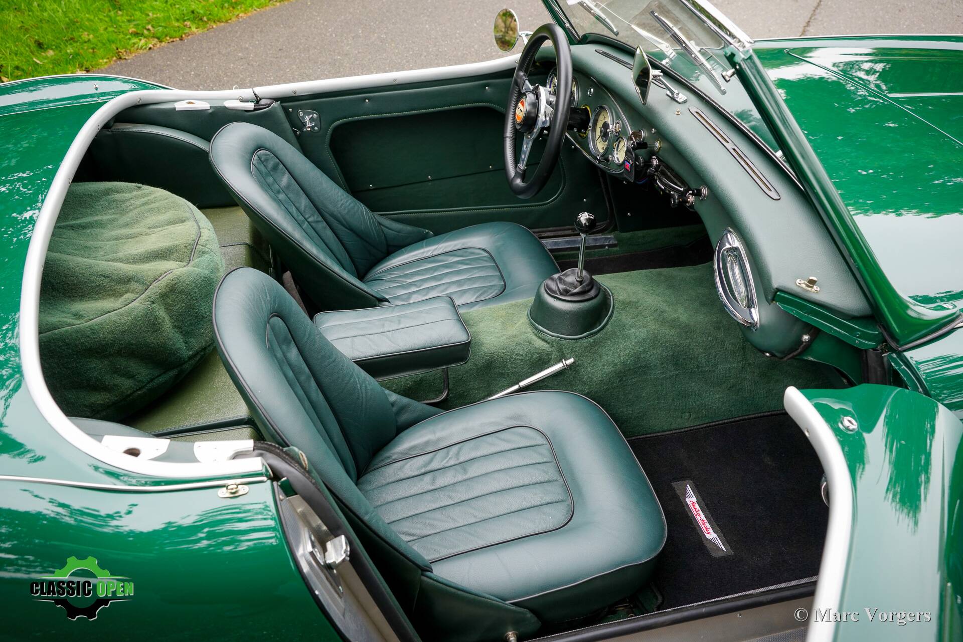 It is a two-seater fitted with the engine of a 3000 Mk III, fitted with the big SU carburettors and a ‘centre-shift’ gearbox with overdrive.