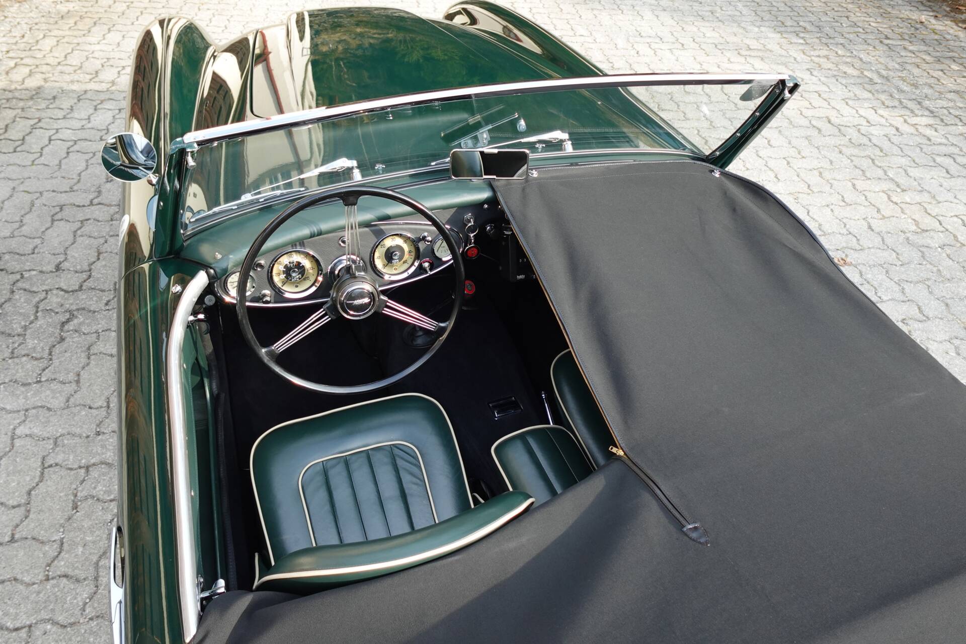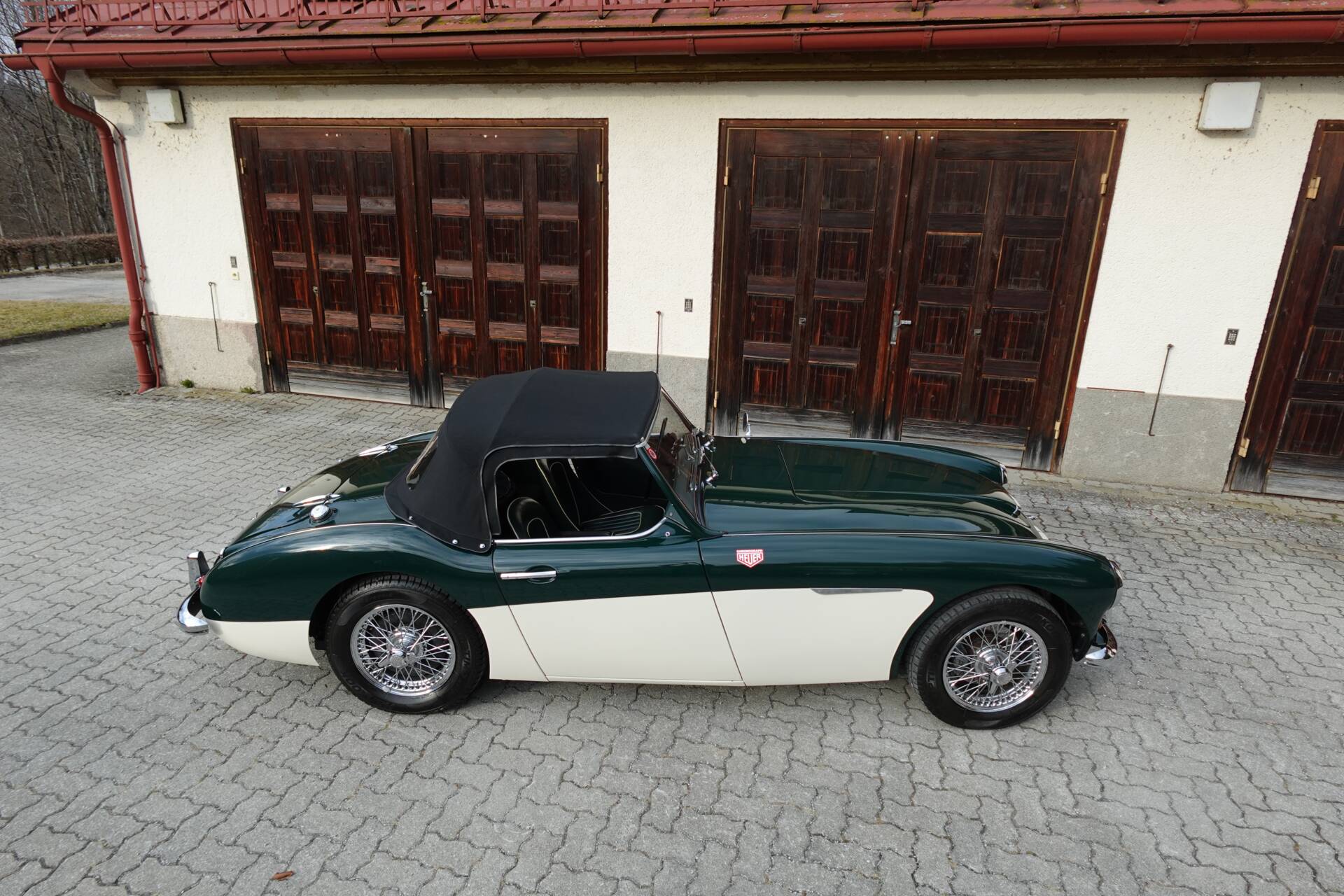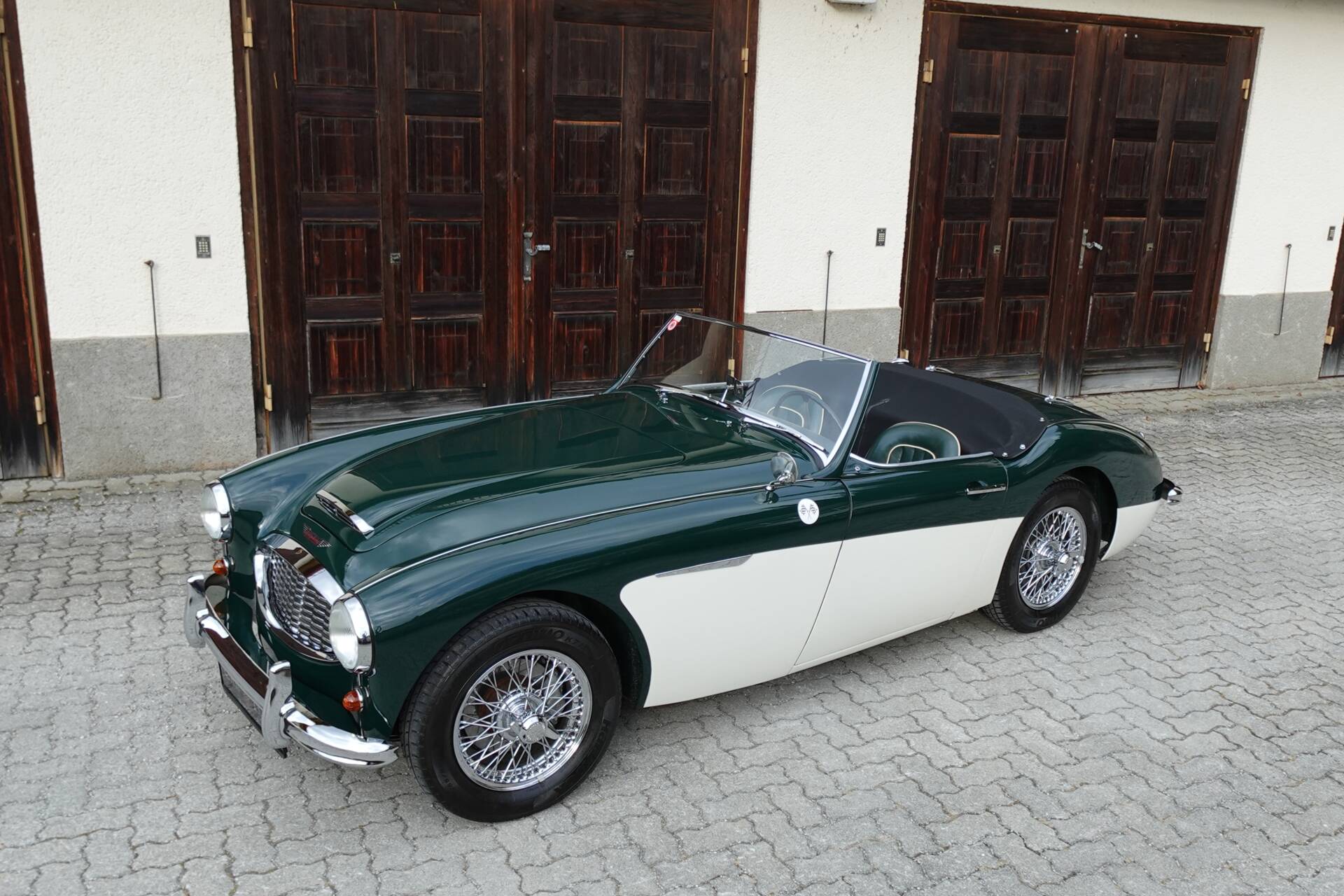 In originaler Zweifarbenlackierung " British Racing Green over Ivory White" lackiert, die Teppiche und Leder in Dark Green mit weissem Piping, wirkt der 100/6 sehr elegant. Im Zuge der Restaurierung wurden die vorderen Trommelbremsen gegen Scheiben getauscht - eine häufig durchgeführte Massnahme, die der Bremsleistung und Fahrsicherheit dient. Der Healey hat aktuell eine österr. historische Zulassung.