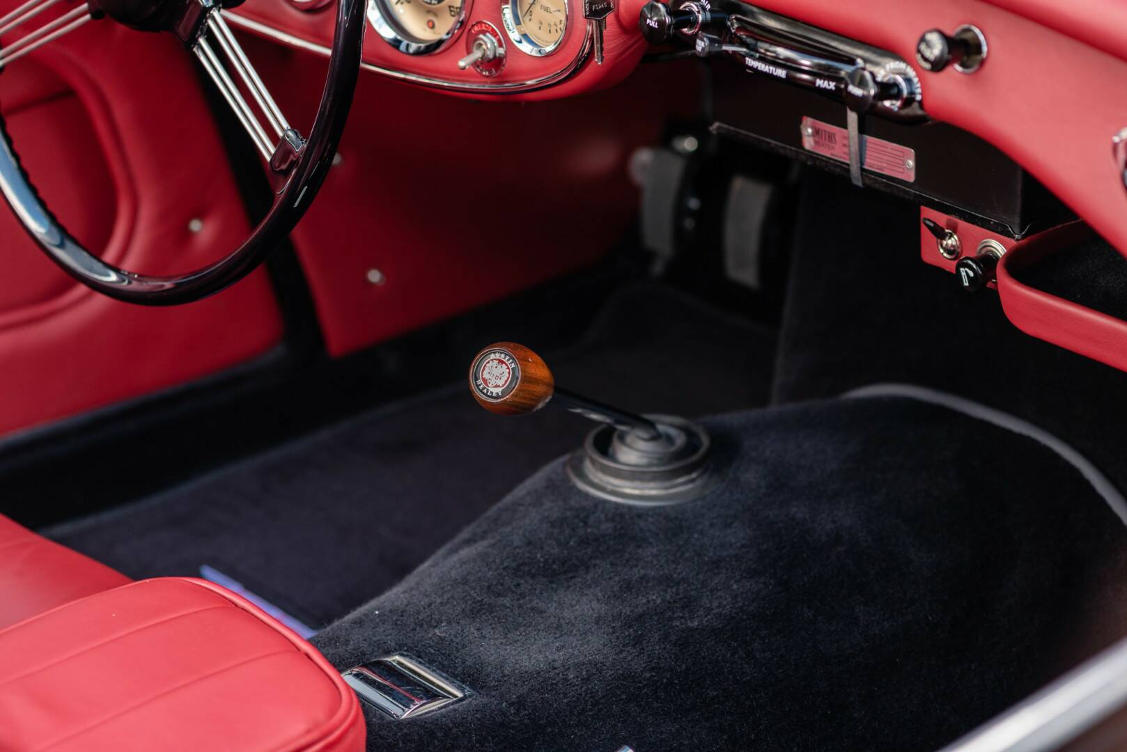 Habitacle typiquement britannique mêlant cuir et instrumentation chromée.