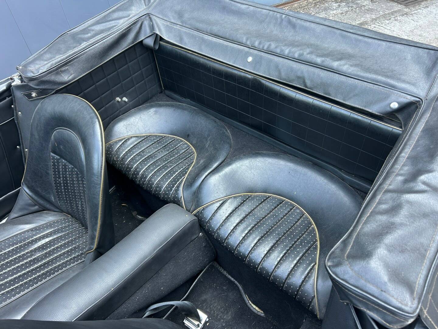 La sellerie en simili noir à été refaite dans sa configuration d'origine en simili noire. L'ensemble est propre, elle est équipée aujourd'hui de sa vieille capote, mais une en toile en alpa bleu marine est prête à être installée.