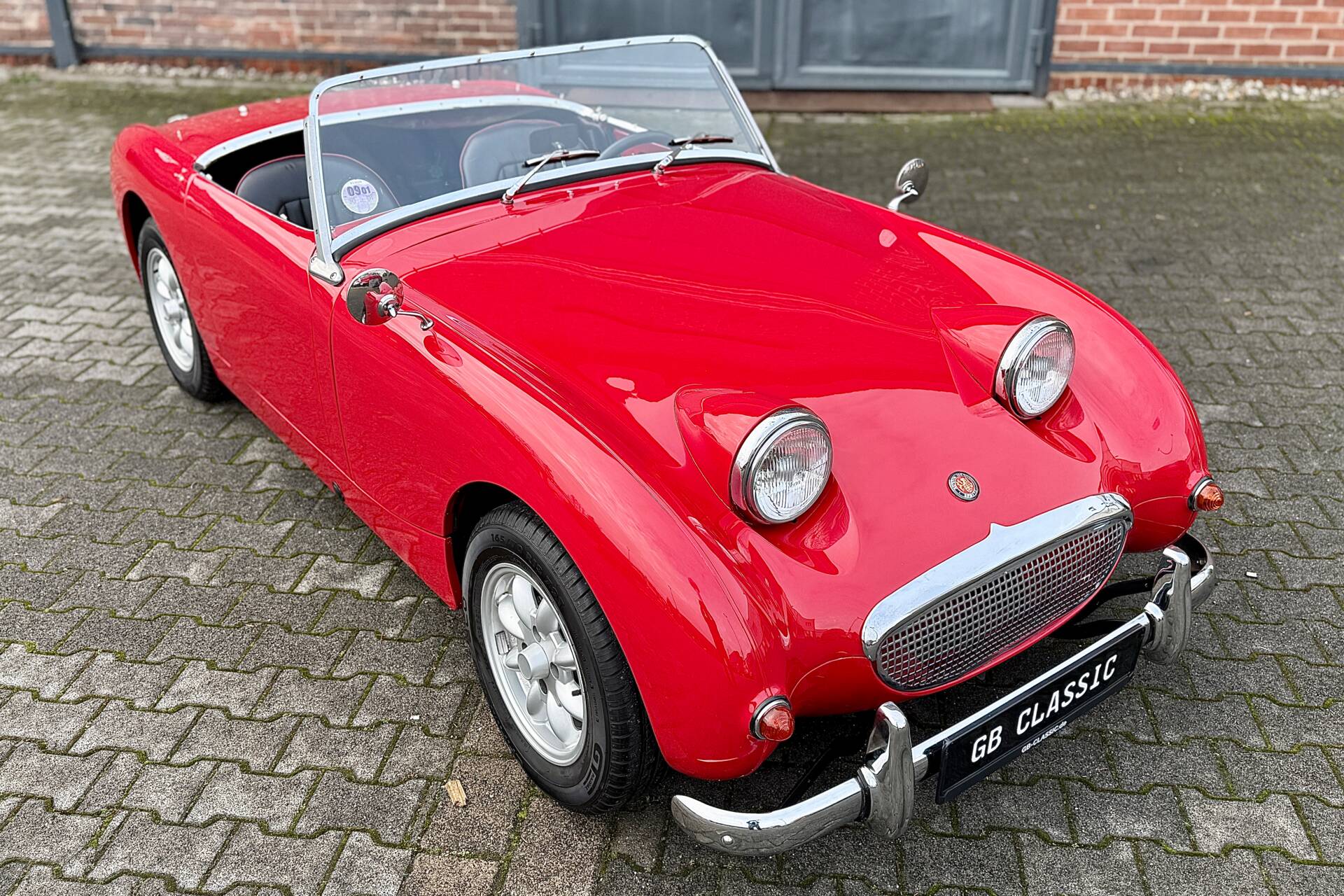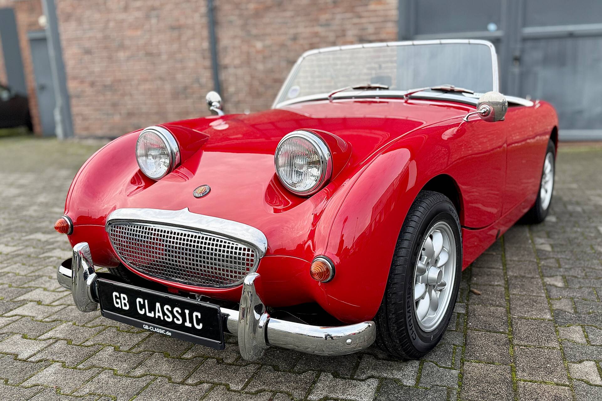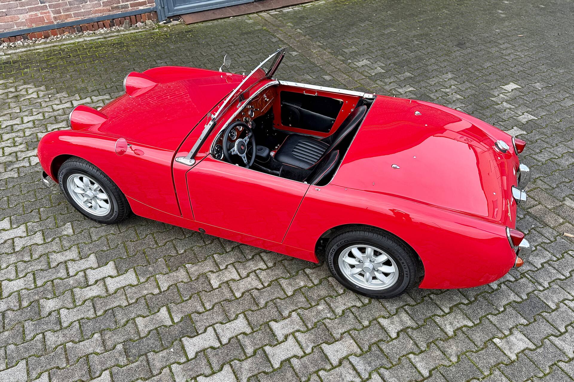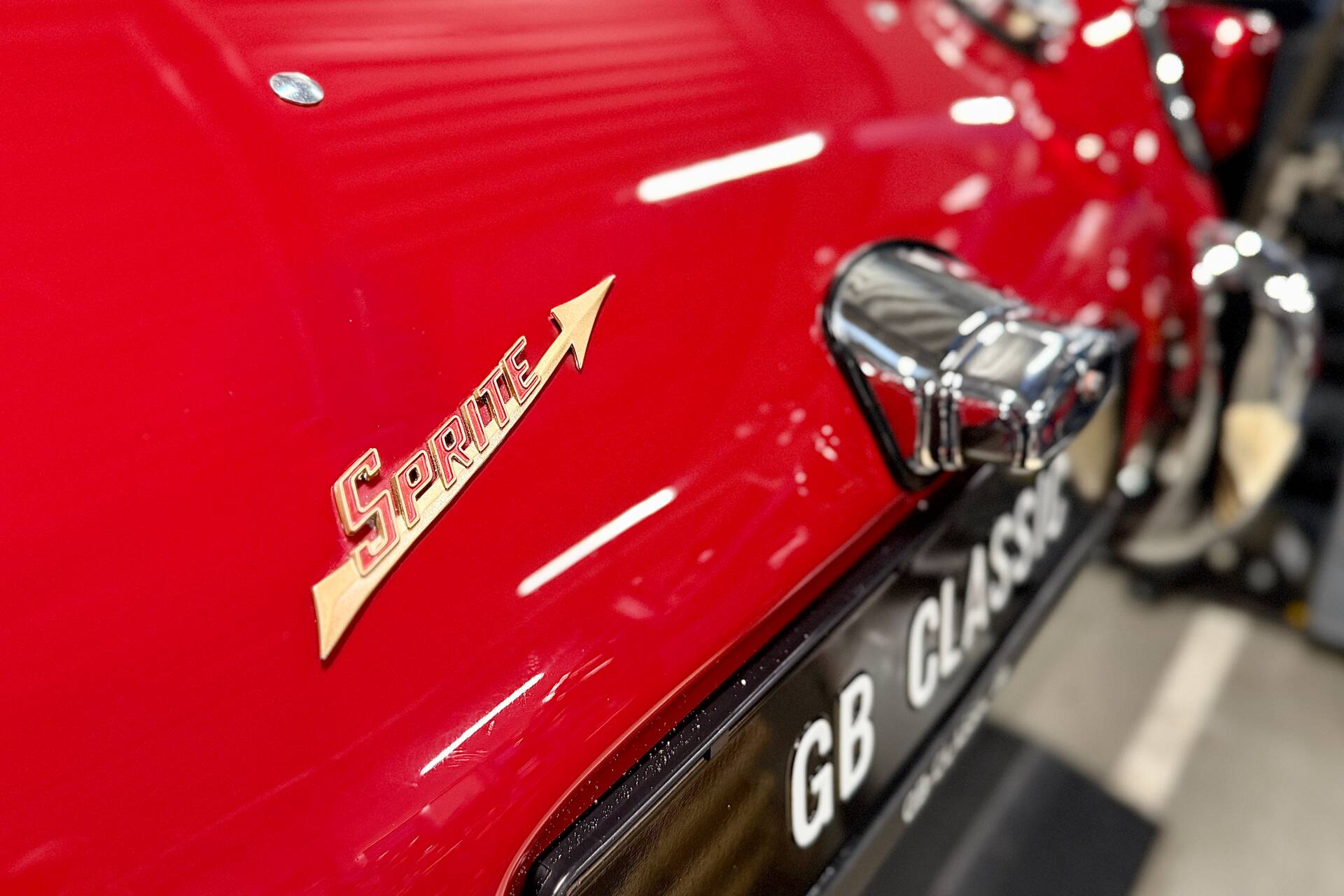 Dieser Austin Healey Sprite ist seit gut 13 Jahren bei einem Eigentümer. Der Wagen ist mit dem agilen 1256cc Motor ausgestattet worden. Der Motor ist leistungsgesteigert und verfügt über eine Sportnockenwelle sowie über einen Weber Doppelvergaser. Der Motor ist mit 65 PS im Fahrzeugschein eingetragen, die tatsächliche Leistung ist nicht bekannt. Der 680 Kilo leichte Frosch marschiert mächtig nach vorne und treibt einem das Lachen ins Gesicht. Geschaltet wird über das beliebte 4-Gang Ribcase-Getriebe. Das Wetter-Equipment ist komplett bei dem Fahrzeug (Verdeck, Tonneau, Seitenscheiben). Zusätzlich zu den Stahlrädern mit Radkappen wird das Auto mit einem Satz Minilite-Felgen und Reifen mit den Maßen 165 70 r13 übergeben. In unserer Werkstatt hat der der Frosch soeben eine aufmerksame Inspektion erhalten. Die durchgeführte Probefahrt und die Durchsicht auf der Hebebühne haben uns begeistert: der Wagen sieht unten genausogut aus wie oben.