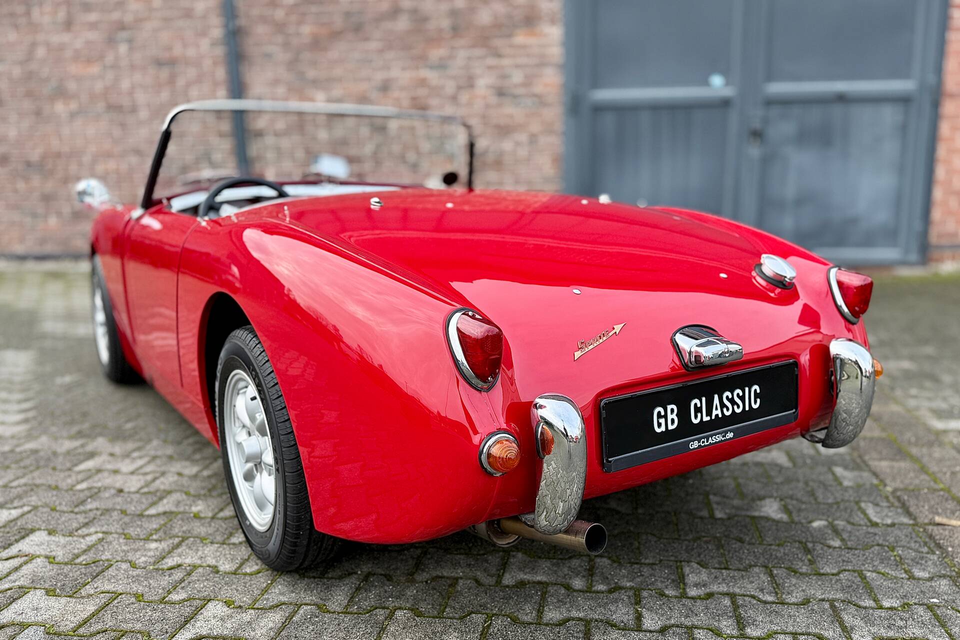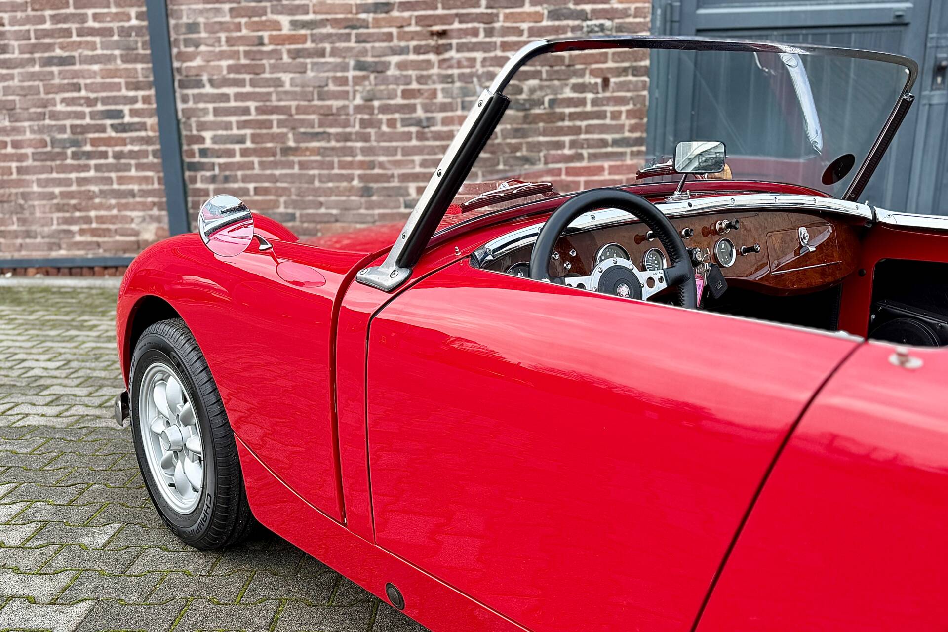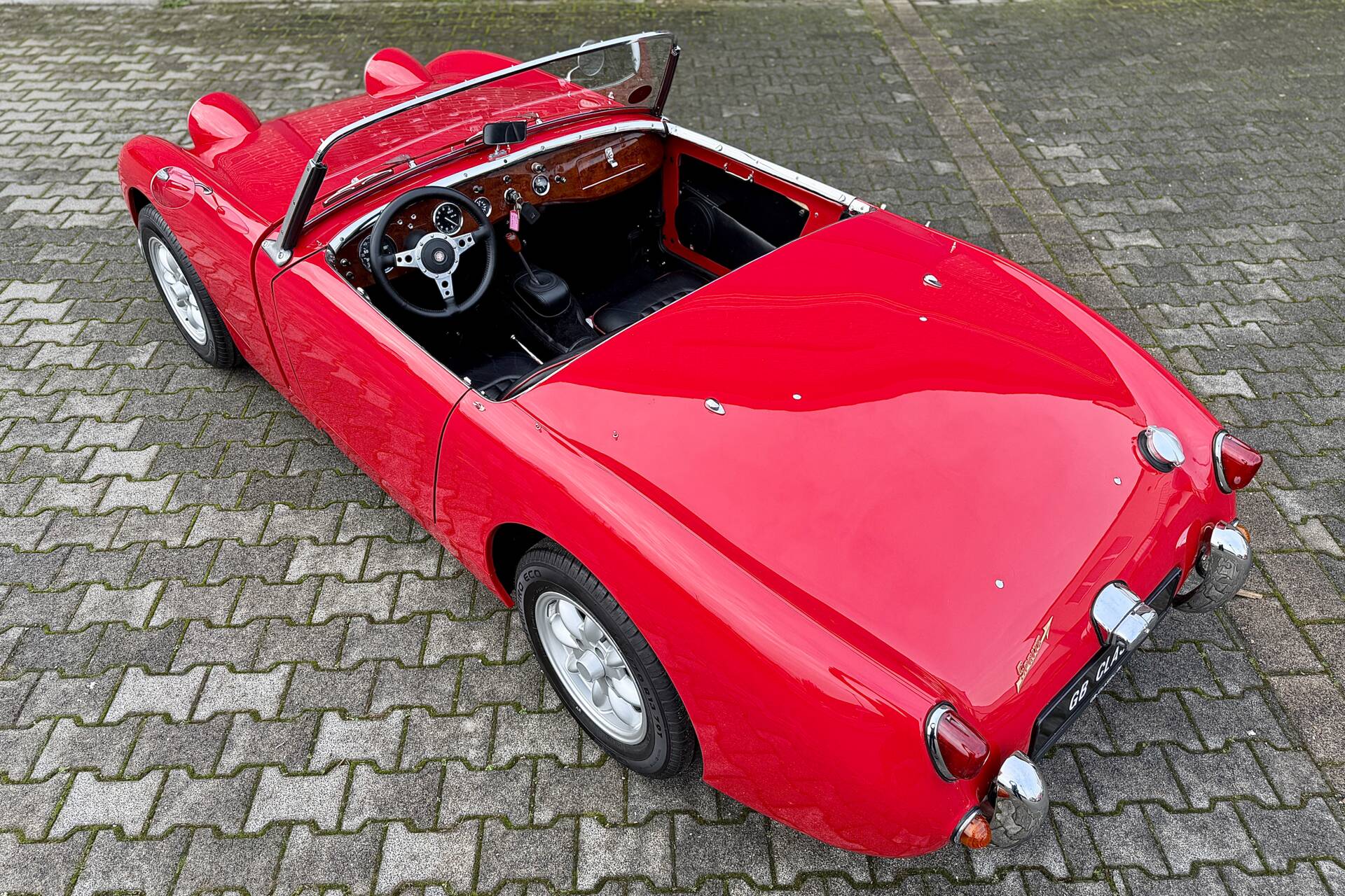 Dieser Austin Healey Sprite ist seit gut 13 Jahren bei einem Eigentümer. Der Wagen ist mit dem agilen 1256cc Motor ausgestattet worden. Der Motor ist leistungsgesteigert und verfügt über eine Sportnockenwelle sowie über einen Weber Doppelvergaser. Der Motor ist mit 65 PS im Fahrzeugschein eingetragen, die tatsächliche Leistung ist nicht bekannt. Der 680 Kilo leichte Frosch marschiert mächtig nach vorne und treibt einem das Lachen ins Gesicht. Geschaltet wird über das beliebte 4-Gang Ribcase-Getriebe. Das Wetter-Equipment ist komplett bei dem Fahrzeug (Verdeck, Tonneau, Seitenscheiben). Zusätzlich zu den Stahlrädern mit Radkappen wird das Auto mit einem Satz Minilite-Felgen und Reifen mit den Maßen 165 70 r13 übergeben. In unserer Werkstatt hat der der Frosch soeben eine aufmerksame Inspektion erhalten. Die durchgeführte Probefahrt und die Durchsicht auf der Hebebühne haben uns begeistert: der Wagen sieht unten genausogut aus wie oben.