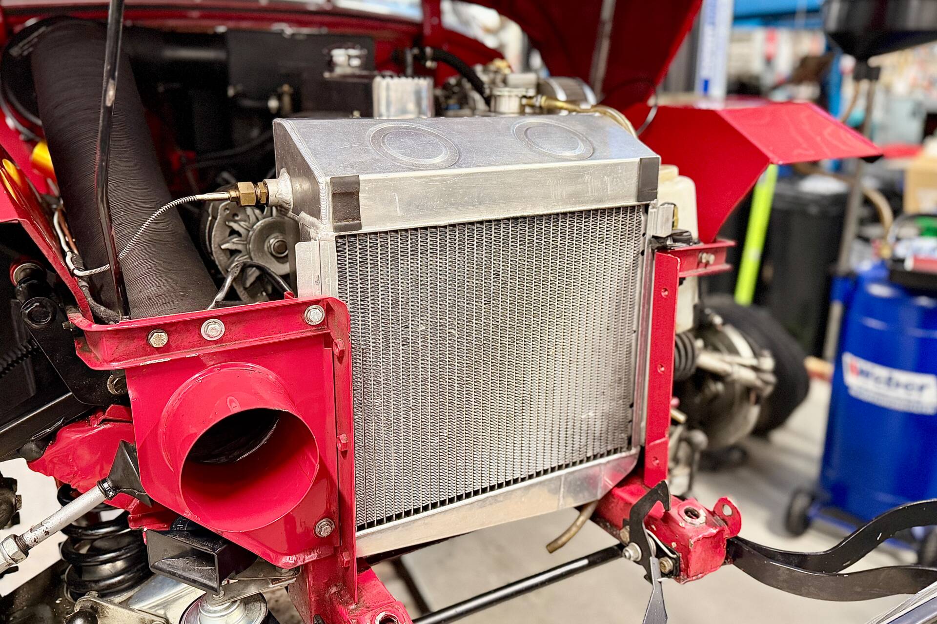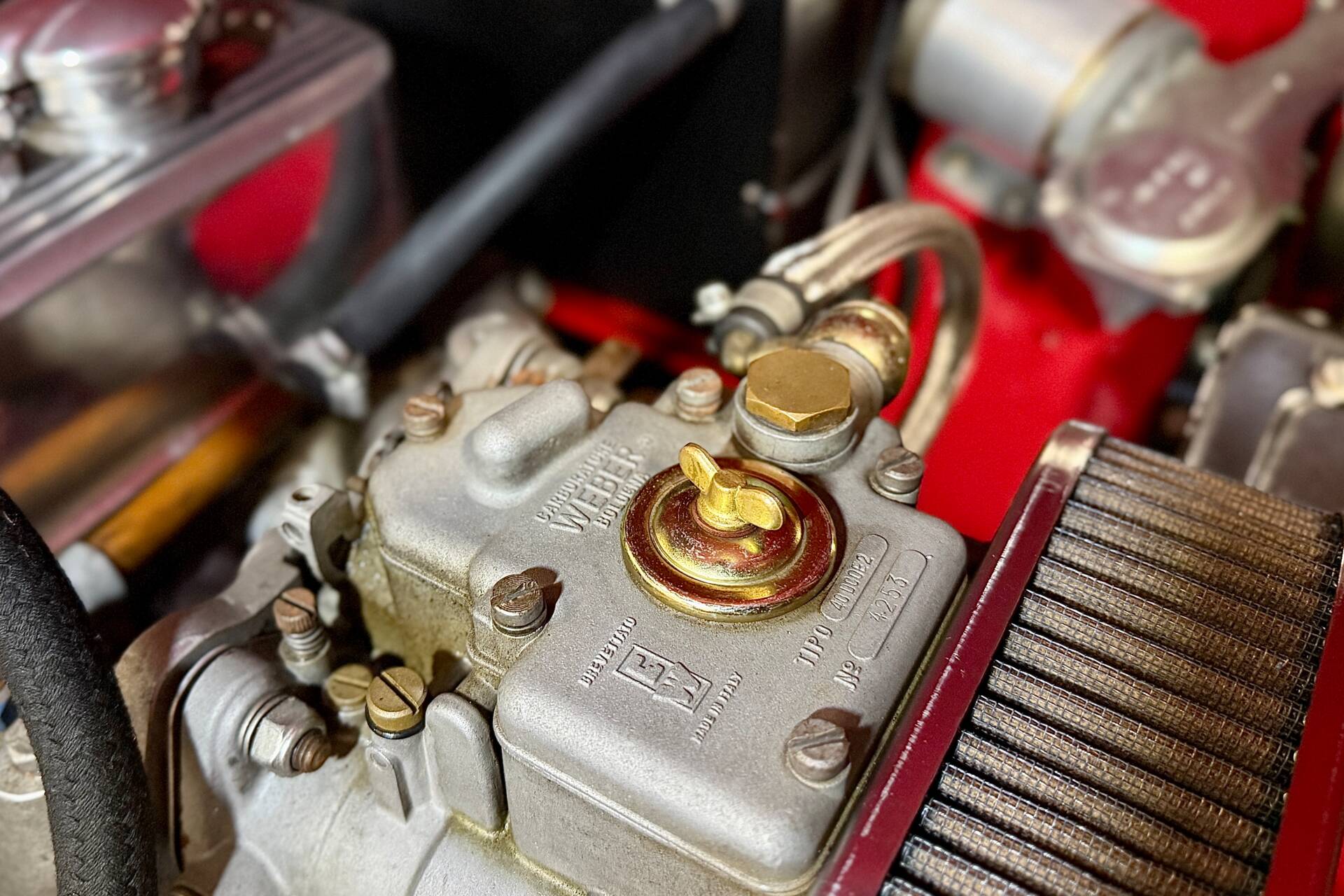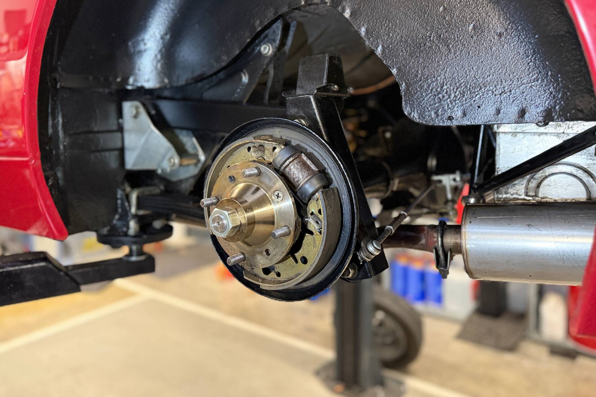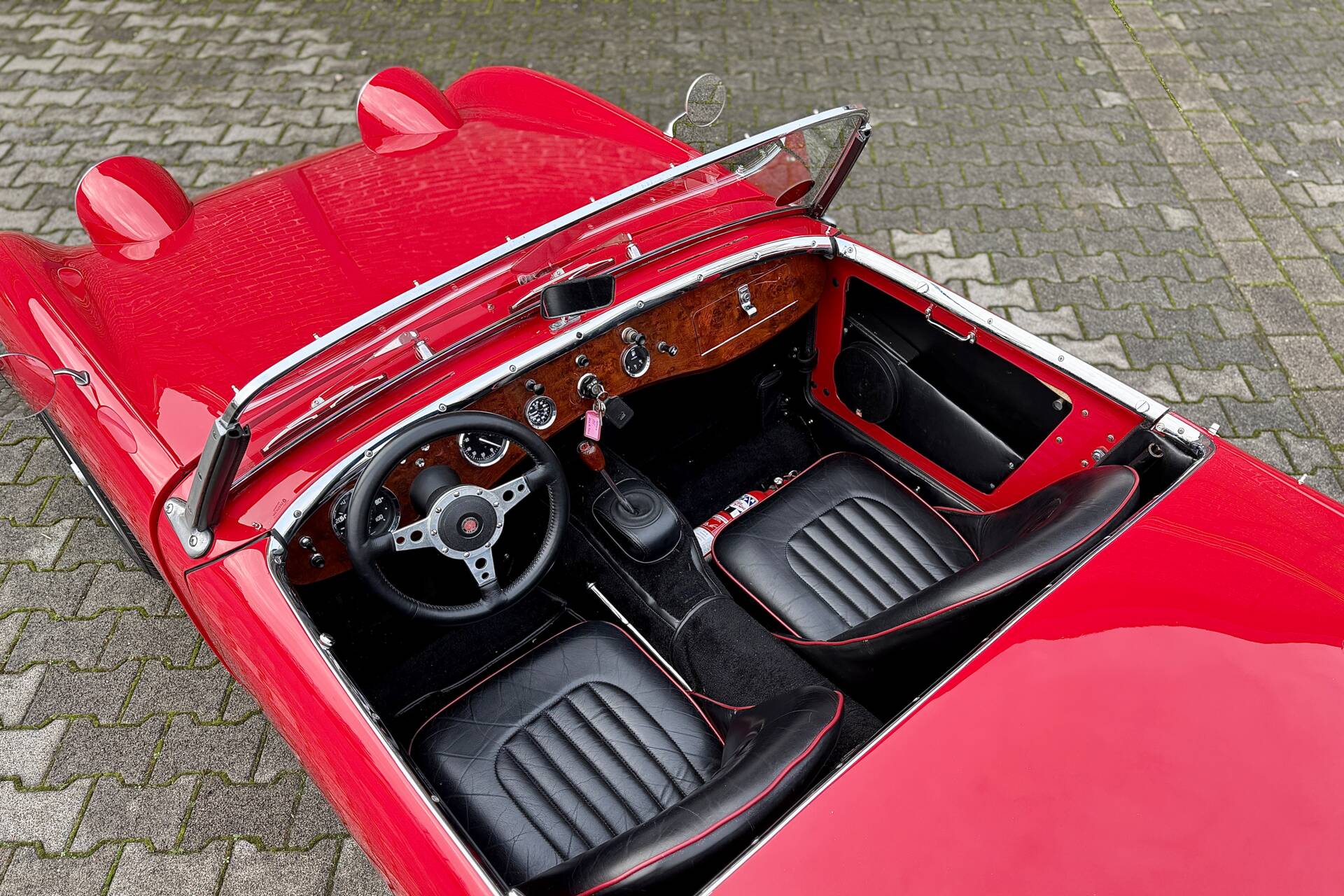 Dieser Austin Healey Sprite ist seit gut 13 Jahren bei einem Eigentümer. Der Wagen ist mit dem agilen 1256cc Motor ausgestattet worden. Der Motor ist leistungsgesteigert und verfügt über eine Sportnockenwelle sowie über einen Weber Doppelvergaser. Der Motor ist mit 65 PS im Fahrzeugschein eingetragen, die tatsächliche Leistung ist nicht bekannt. Der 680 Kilo leichte Frosch marschiert mächtig nach vorne und treibt einem das Lachen ins Gesicht. Geschaltet wird über das beliebte 4-Gang Ribcase-Getriebe. Das Wetter-Equipment ist komplett bei dem Fahrzeug (Verdeck, Tonneau, Seitenscheiben). Zusätzlich zu den Stahlrädern mit Radkappen wird das Auto mit einem Satz Minilite-Felgen und Reifen mit den Maßen 165 70 r13 übergeben. In unserer Werkstatt hat der der Frosch soeben eine aufmerksame Inspektion erhalten. Die durchgeführte Probefahrt und die Durchsicht auf der Hebebühne haben uns begeistert: der Wagen sieht unten genausogut aus wie oben.