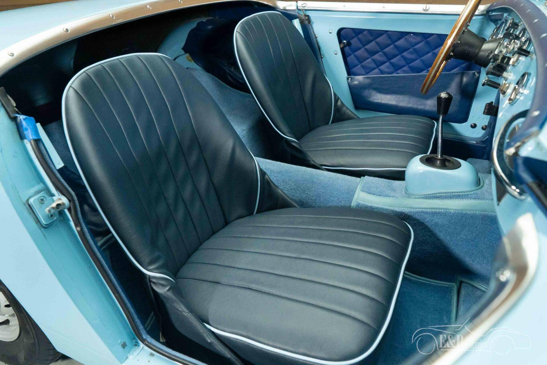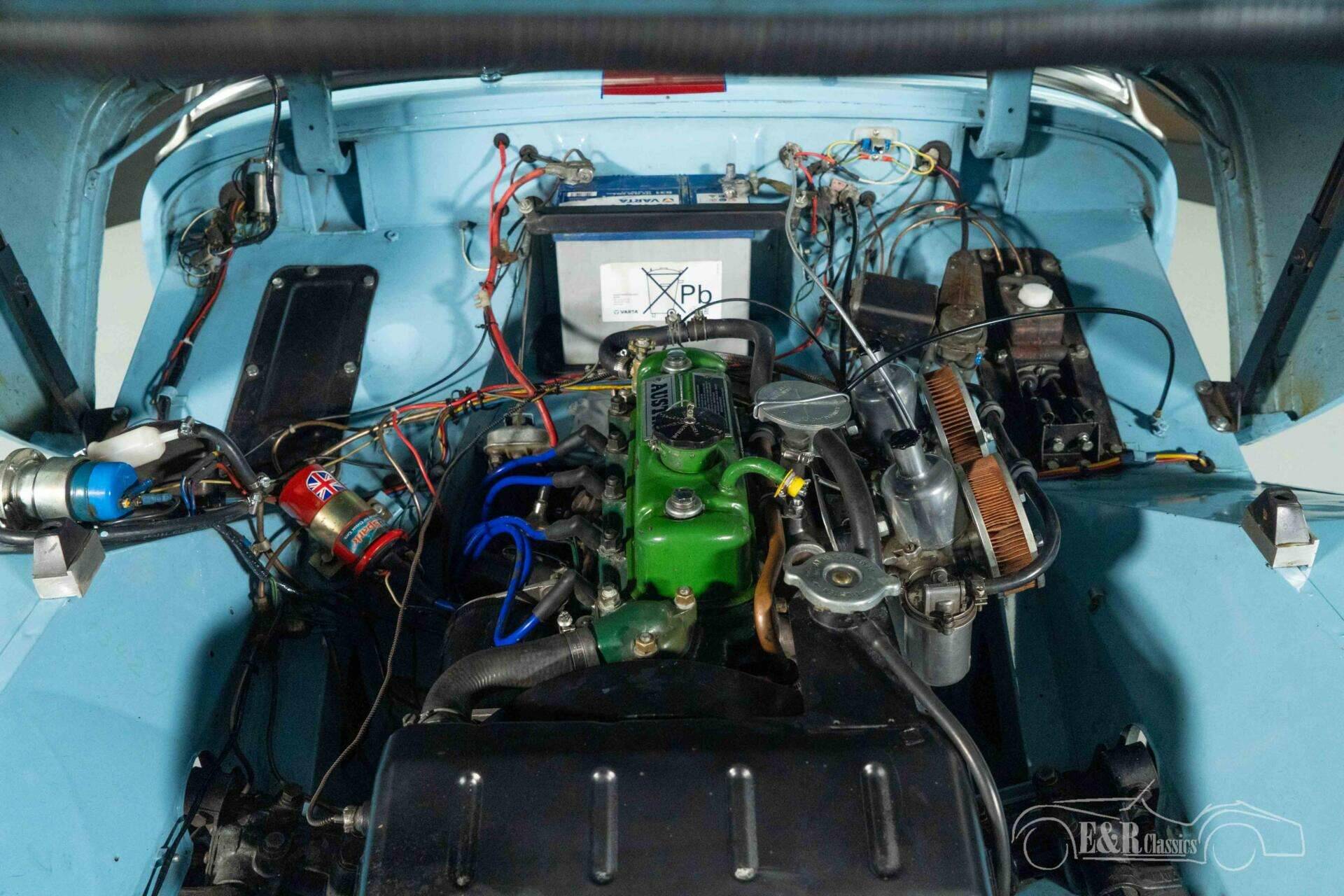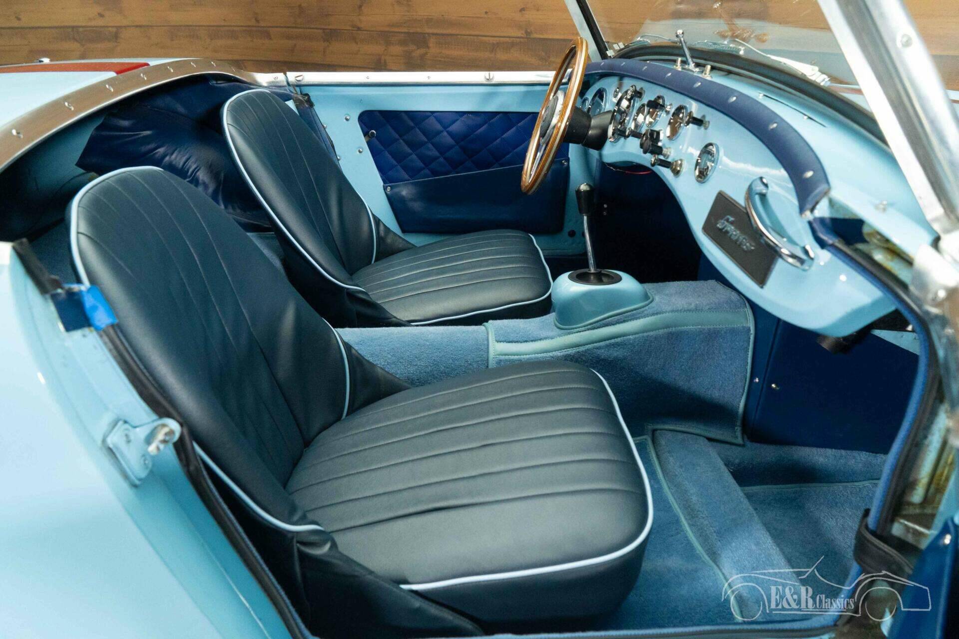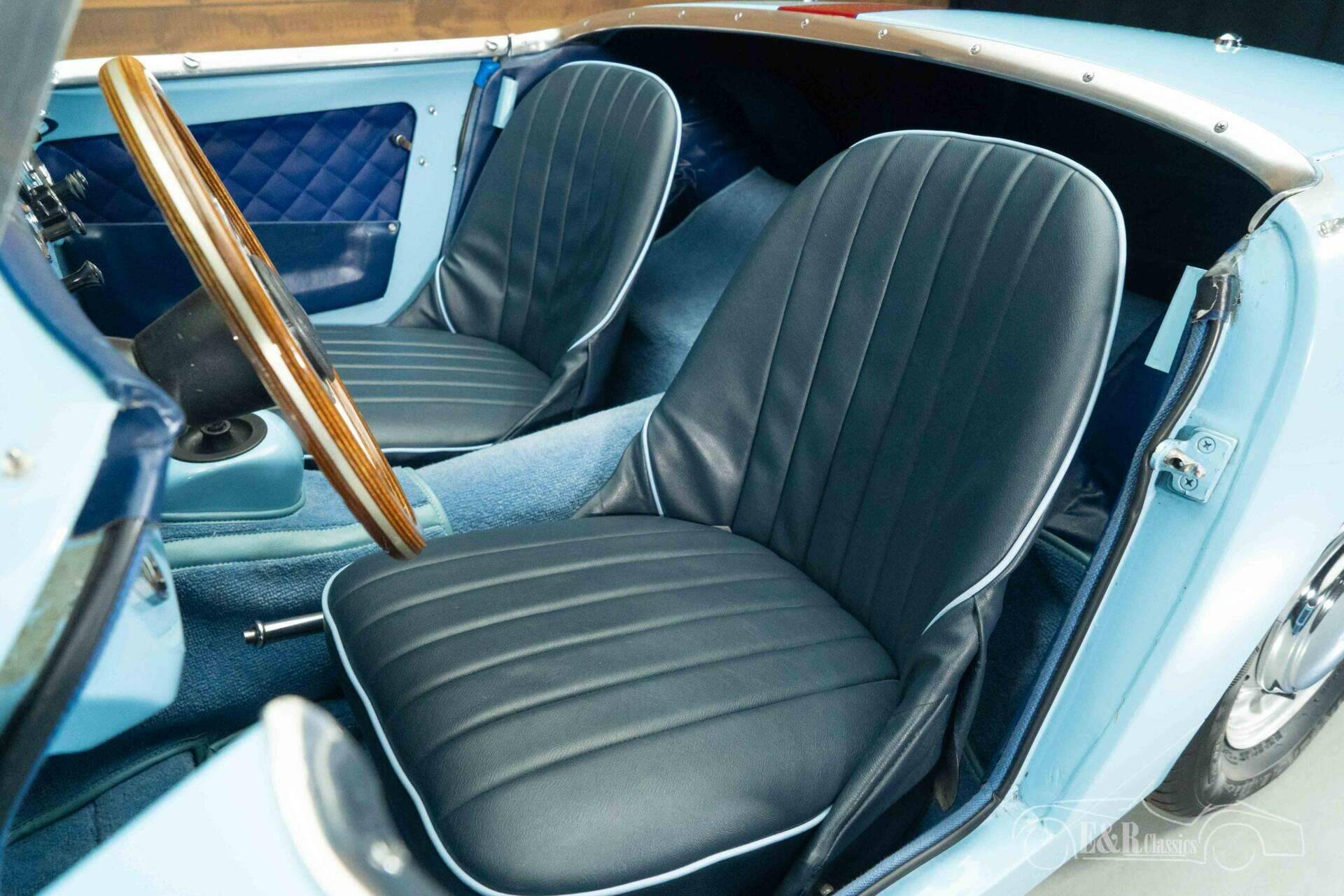Ook optisch maakt deze Sprite een bijzonder sterke indruk. De lichtblauwe lak combineert fraai met de sportieve striping en sluit perfect aan bij het tijdloze ontwerp. De stalen velgen met originele uitstraling, sportuitlaat en correct gemonteerde accessoires versterken het klassieke geheel. Het interieur is verzorgd en stijlvol, met een fraai samenspel tussen het lakwerk en de bekleding. Het dashboard is uitgerust met drie extra Smiths-instrumenten voor olietemperatuur, voltmeter en klok, wat zowel functioneel als period-correct is. De auto wordt geleverd met soft top, tonneau cover én hardtop, waardoor hij geschikt is voor elk seizoen. Een zeer complete en rijk uitgeruste Frogeye, klaar voor zorgeloos rijplezier.