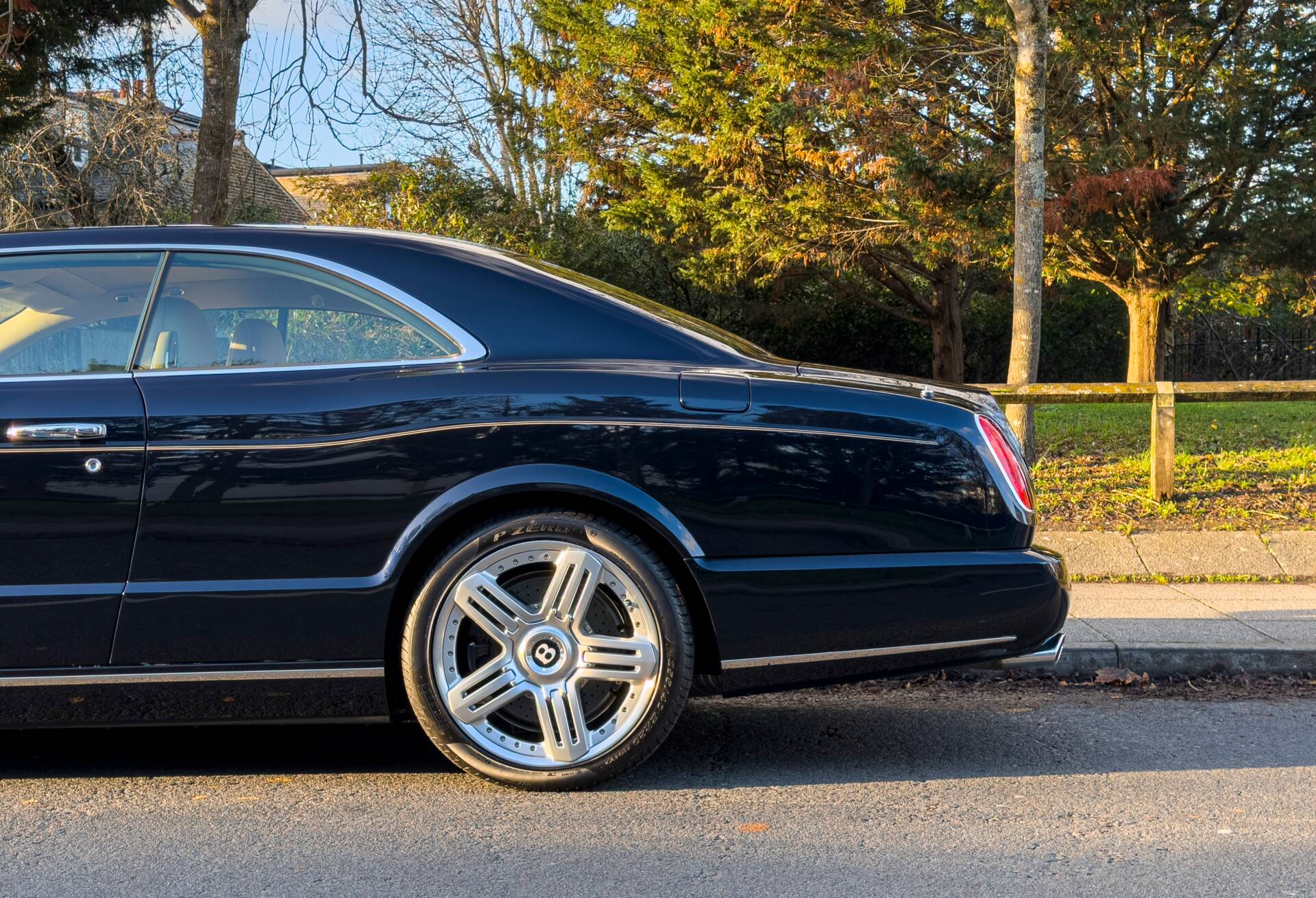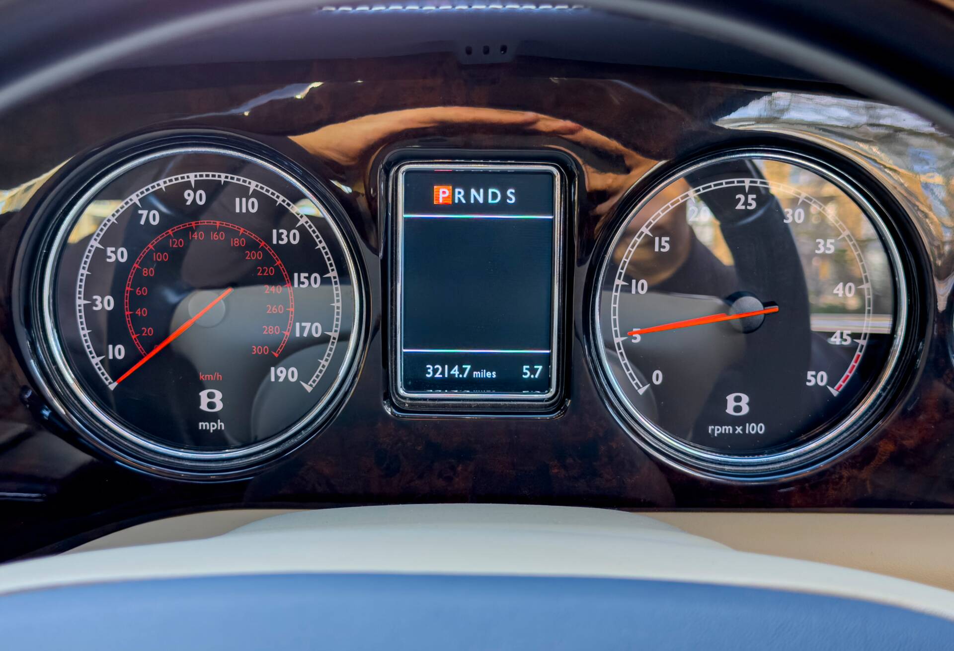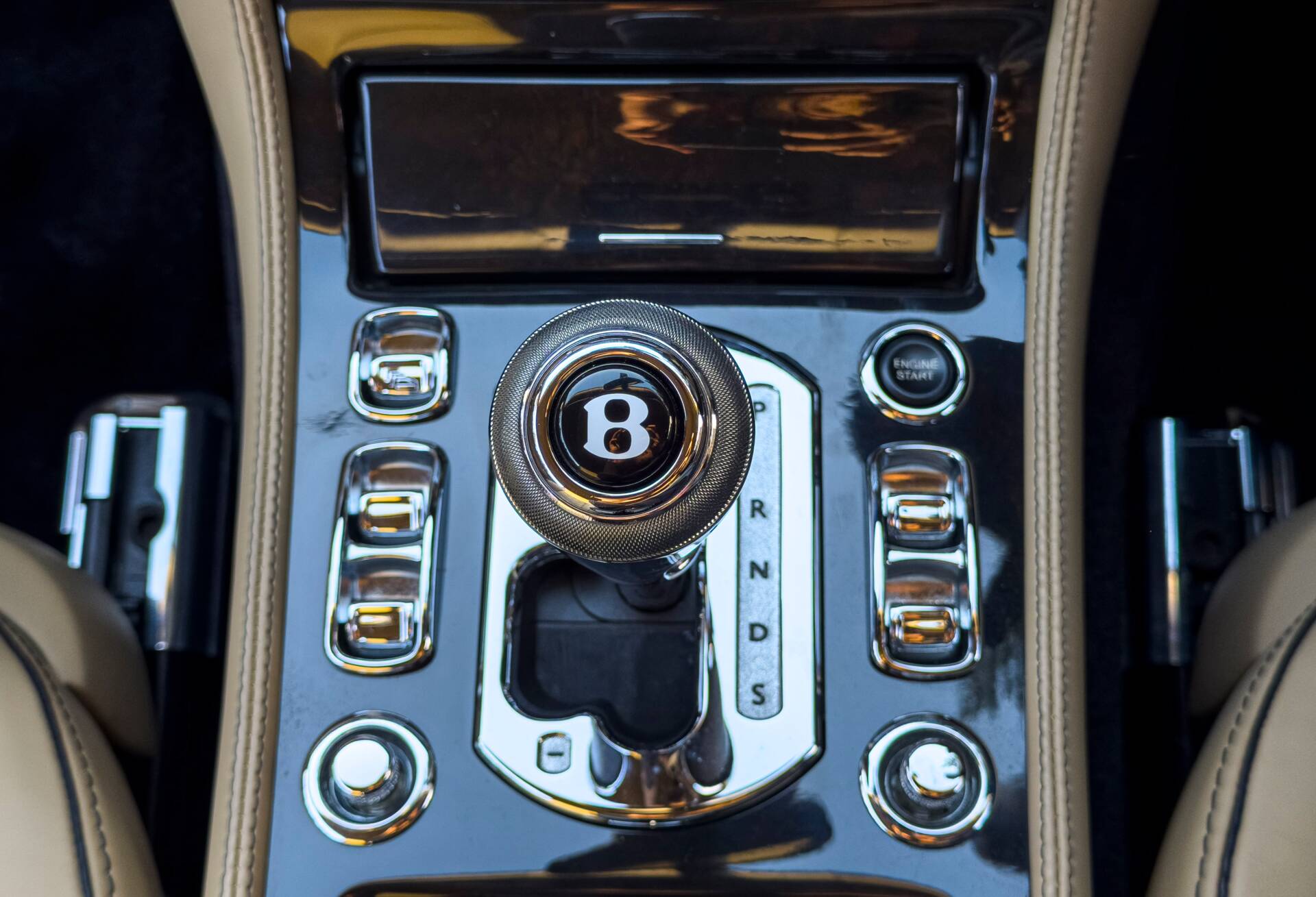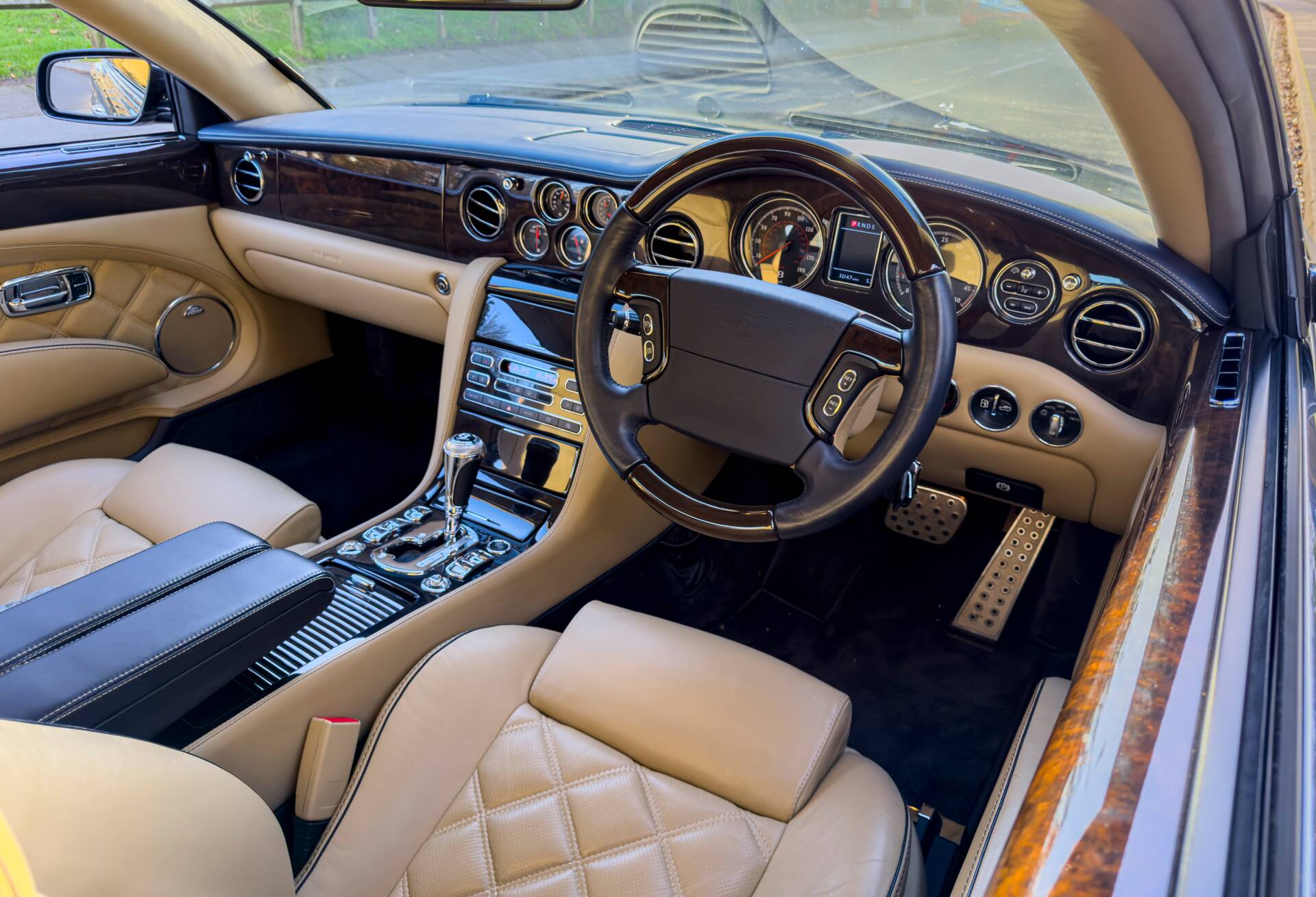 Finished in Special Order Metallic Black Sapphire, this Bentley features Cashew leather upholstery with diamond-quilted seat facings and matching door cards, each embroidered with Bentley Flying B emblems. The carpets and seat belts are colour-matched to the main hide, while the top roll is finished in two-tone leather with contrasting stitching. Dark-stained Burr Walnut veneers add a touch of understated elegance throughout the cabin.