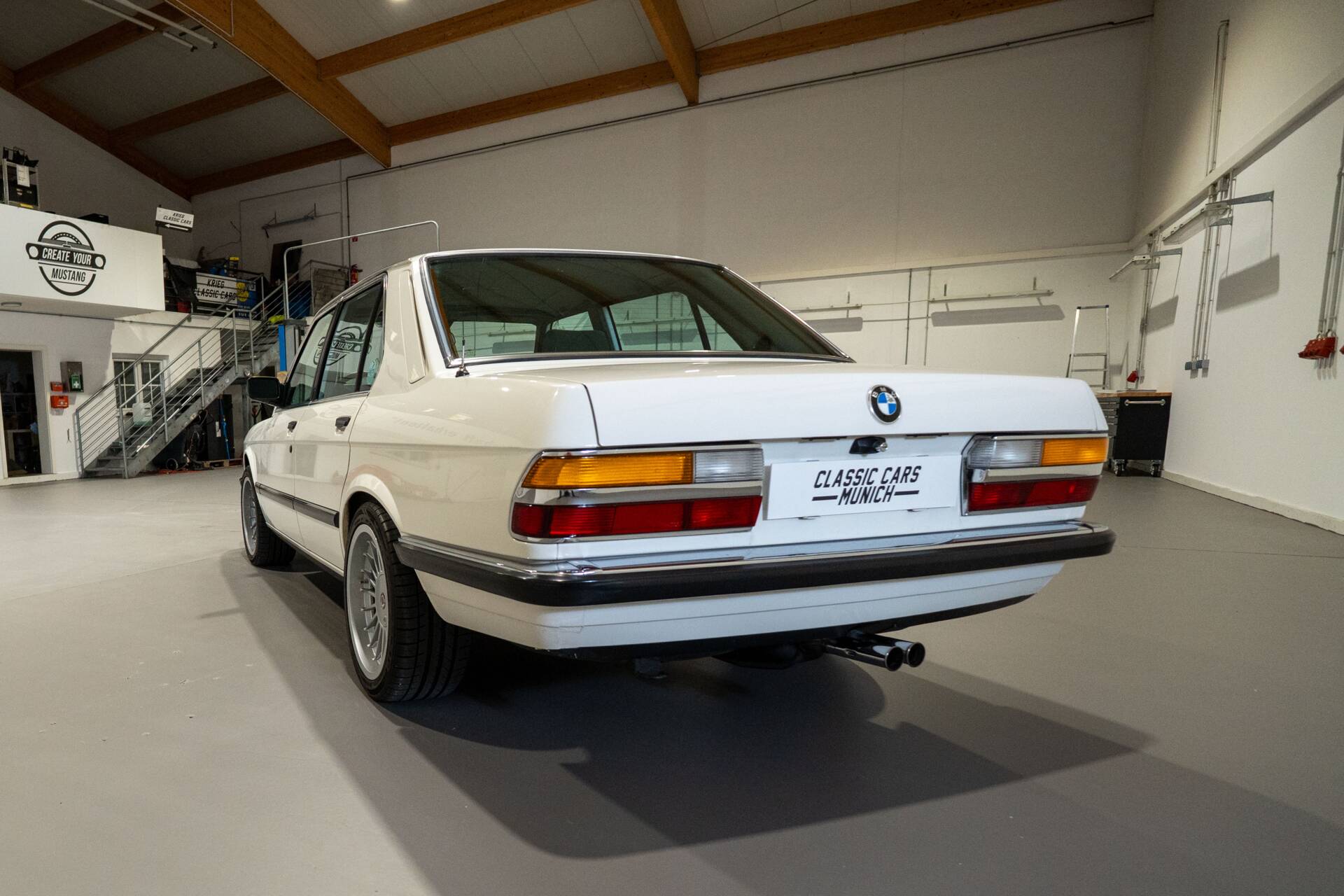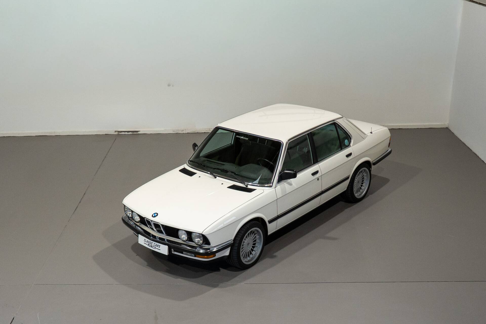 Zum Verkauf steht ein BMW 528i (E28) in klassischem Alpinweiß mit grüner Stoffausstattung.