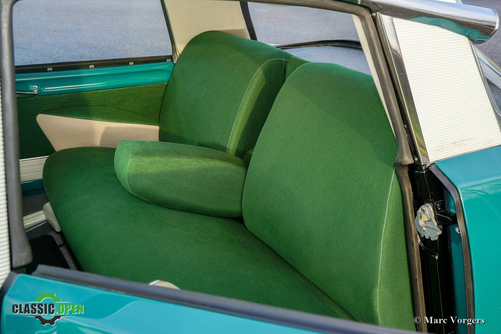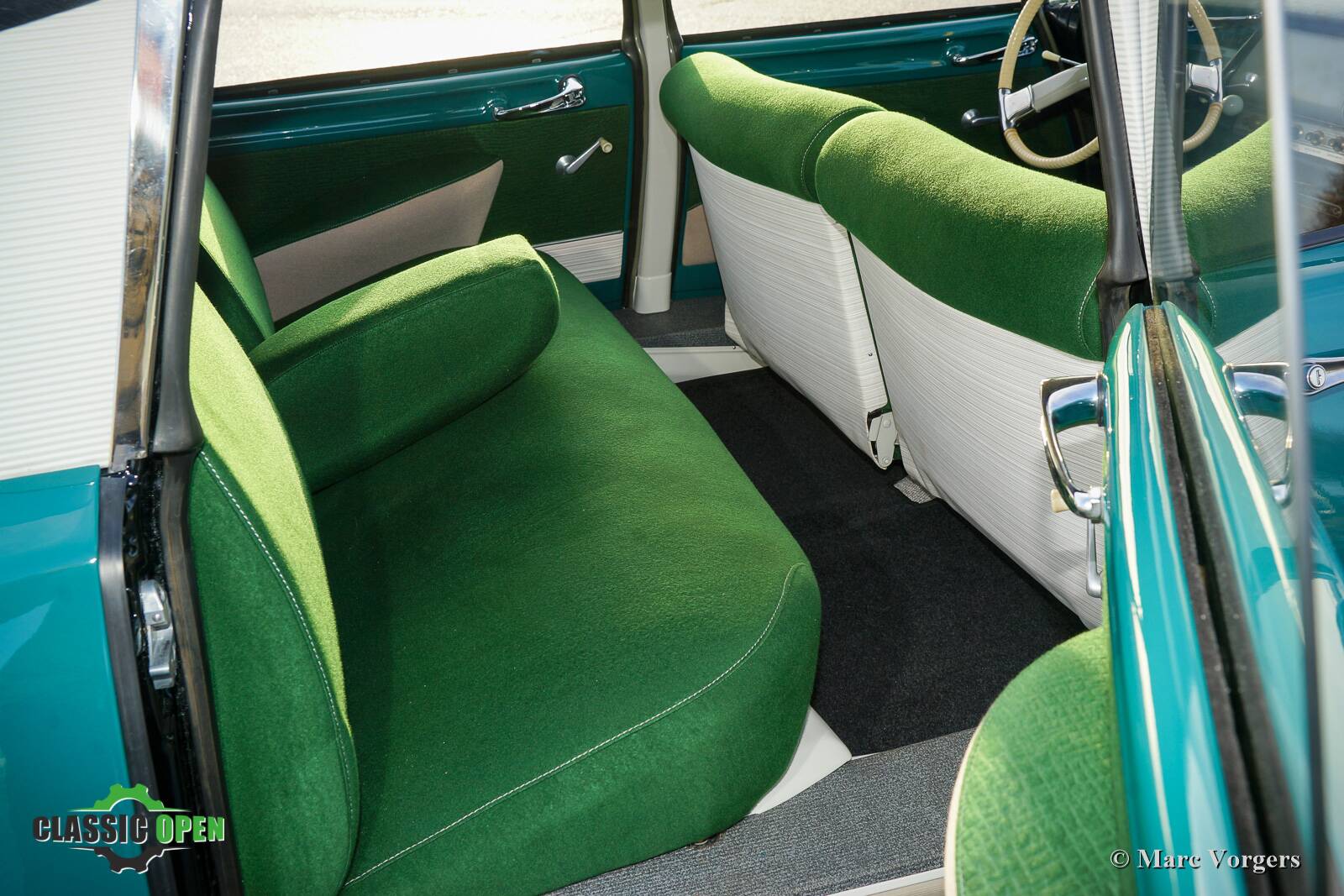 Colour green with a crème roof-top and a green / crème cloth interior.
