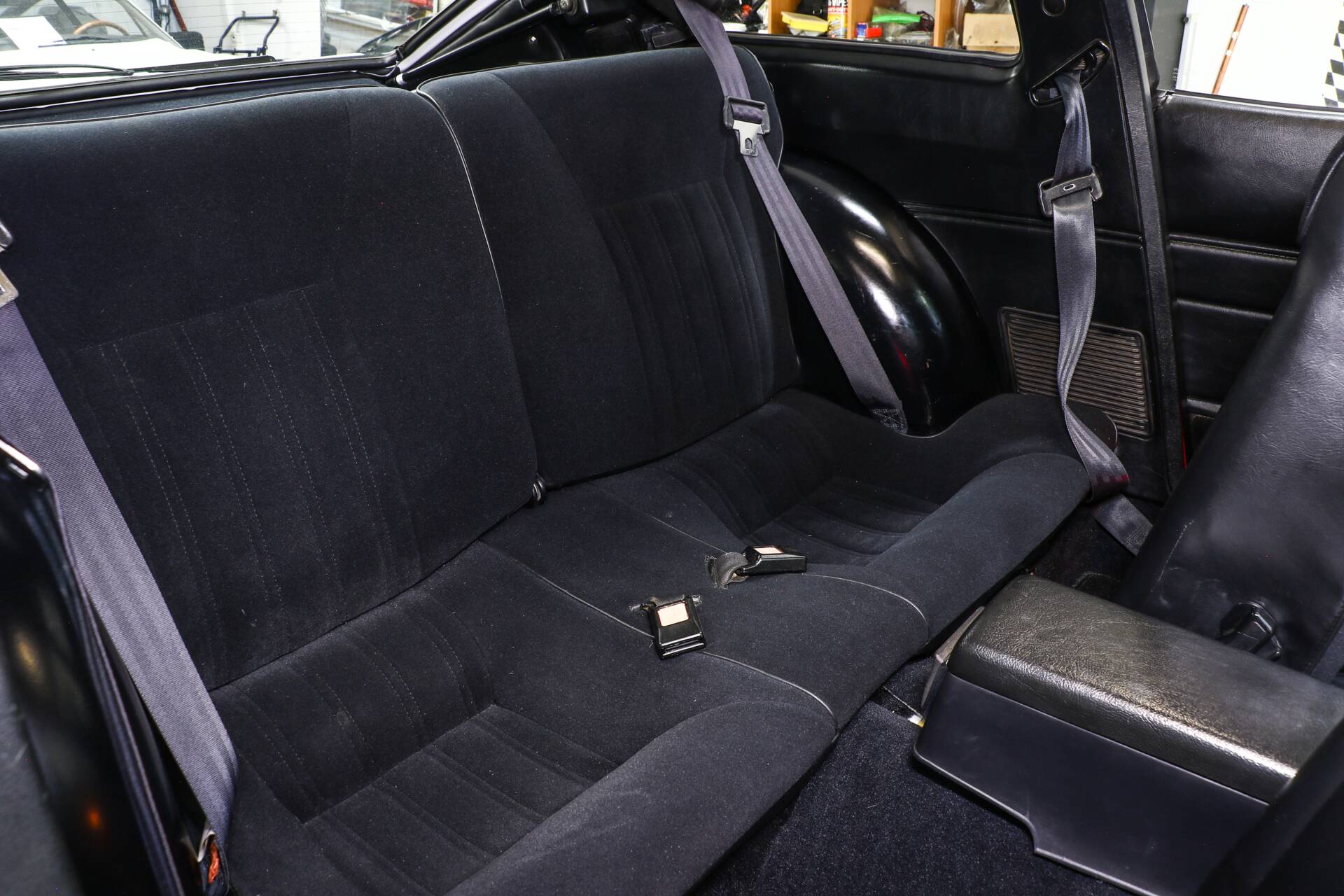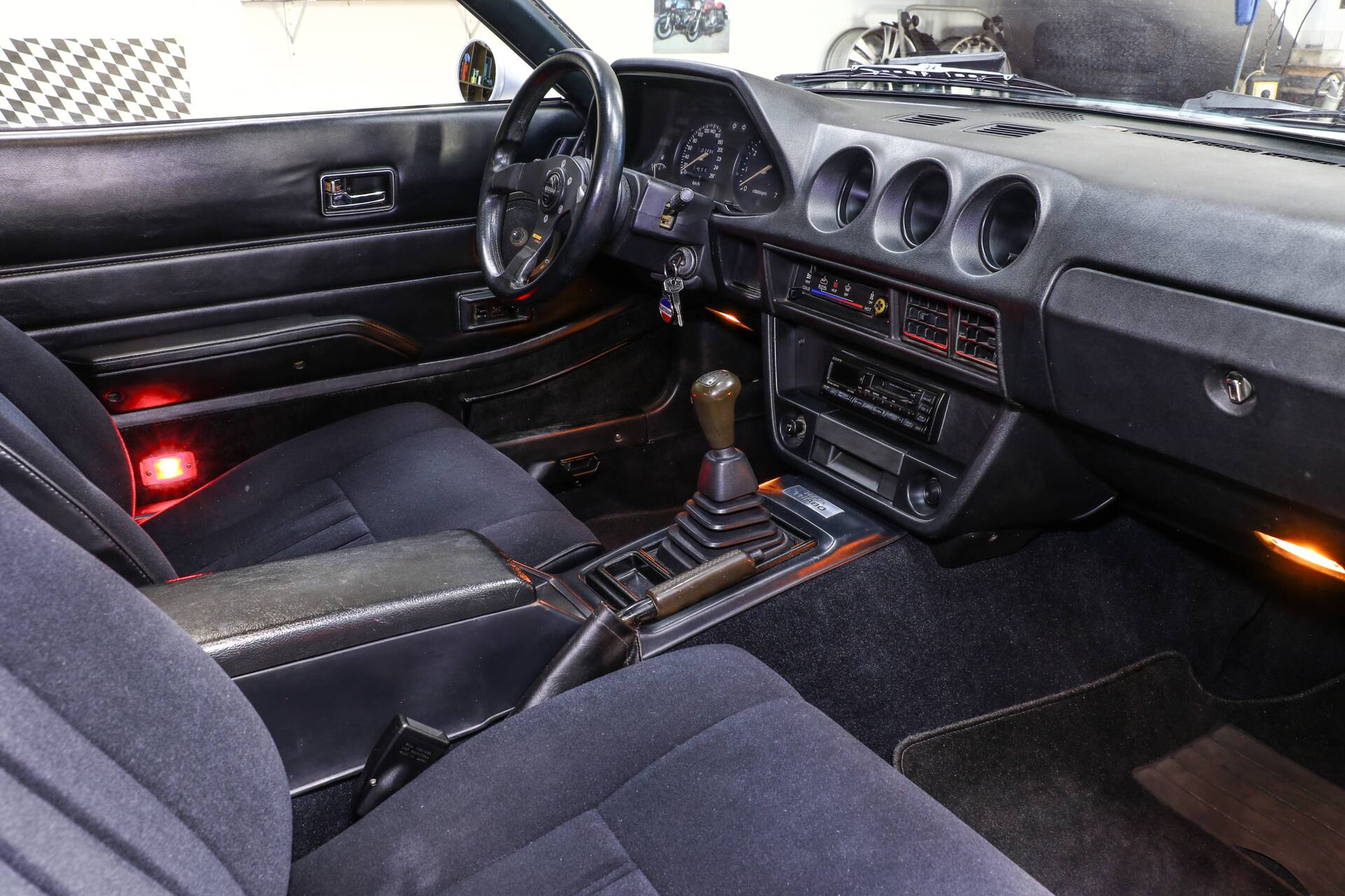 Auch der Innenraum, konsequent in schwarz, verleugnet sein Alter. Alles befindet sich in sauberem, top-gepflegtem Zustand. Luxuriös und in der Cockpitbestückung komplett: stoffbezogene Sportsitze, Teppichboden, getönte Scheiben, elektrische Fensterheber und T-Roof.