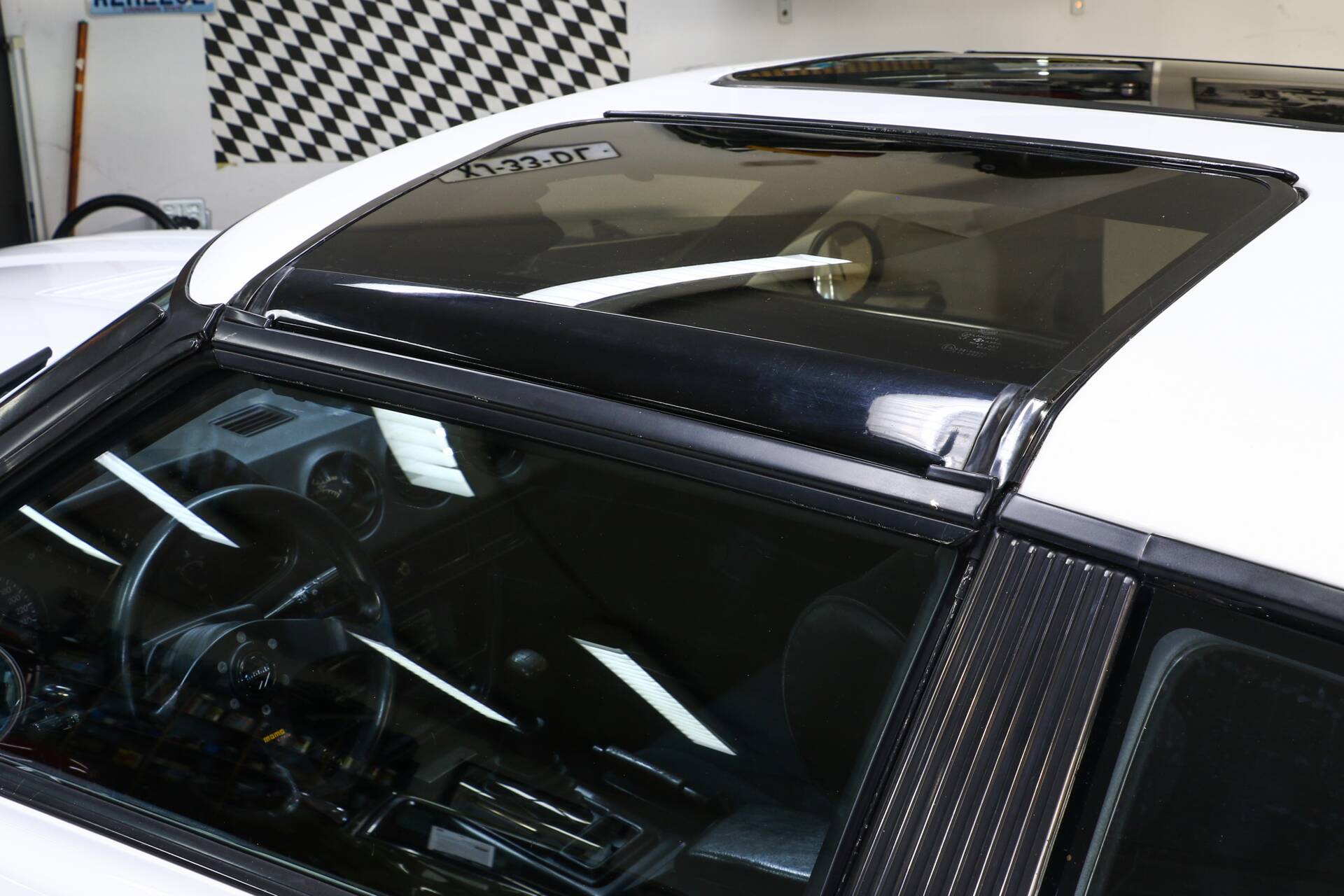 Auch der Innenraum, konsequent in schwarz, verleugnet sein Alter. Alles befindet sich in sauberem, top-gepflegtem Zustand. Luxuriös und in der Cockpitbestückung komplett: Sportsitze, getönte Scheiben, elektrische Fensterheber und T-Roof.