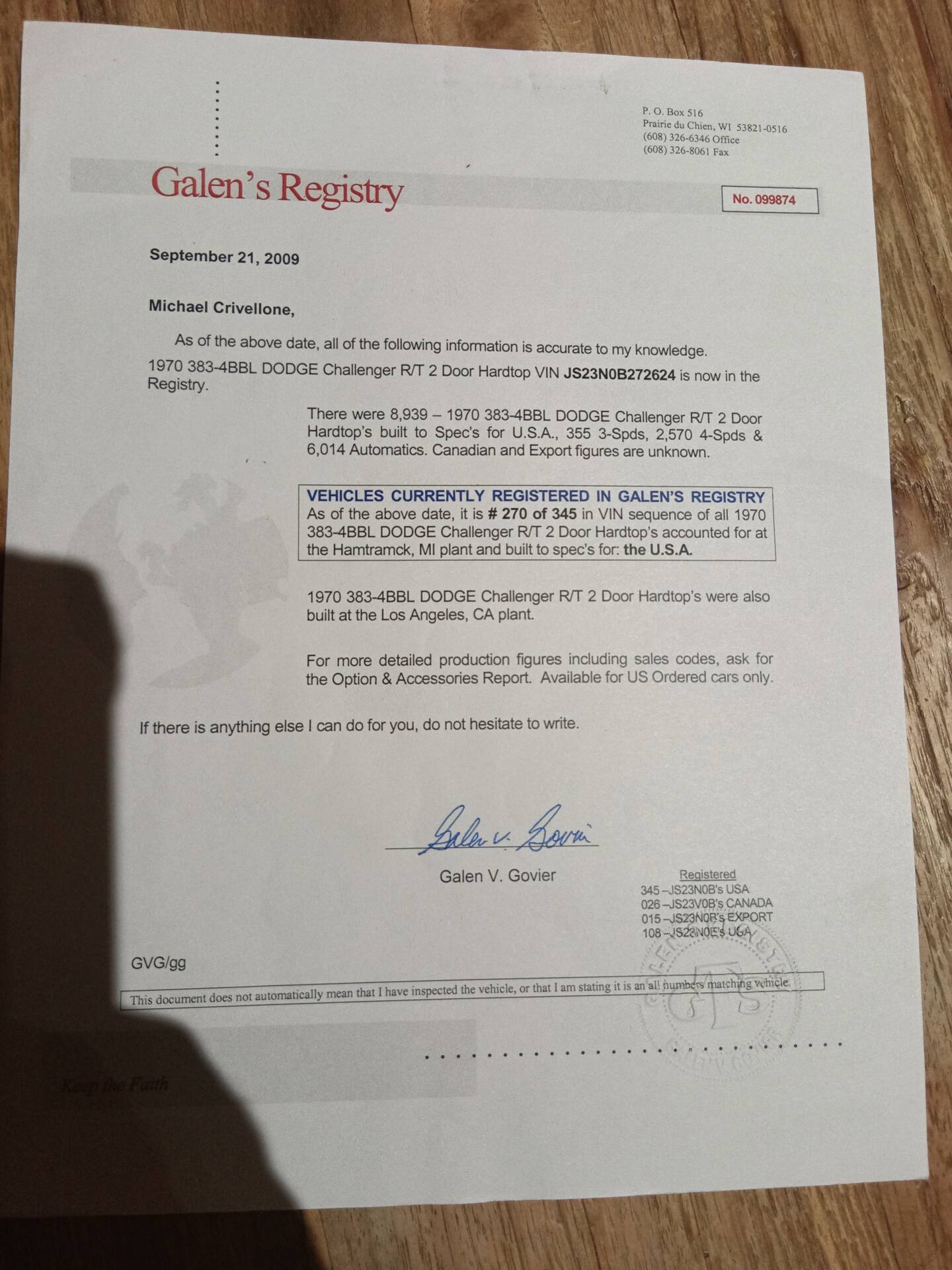 Please note: Galen’s Registry documentation confirms registration and production data but does not constitute a physical inspection of the vehicle.