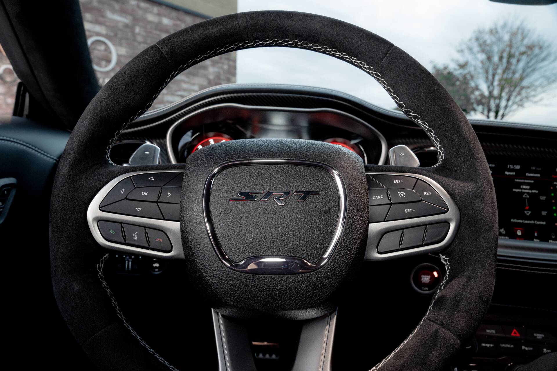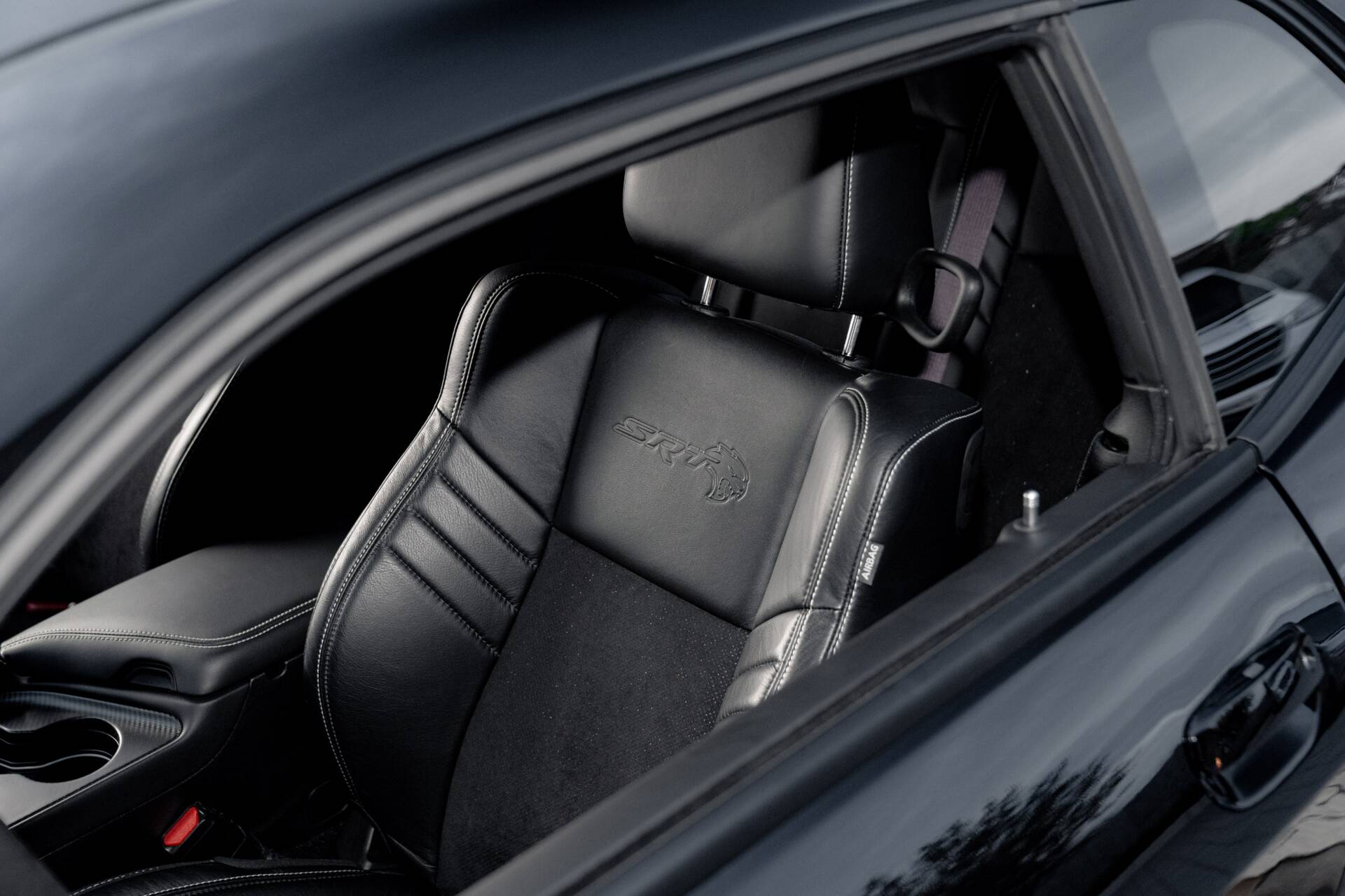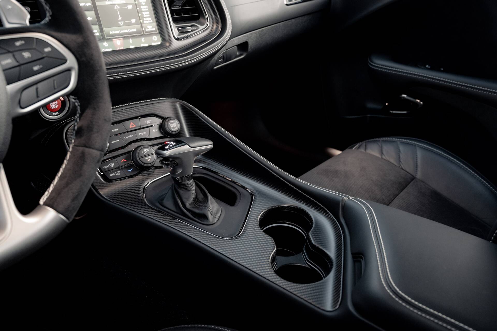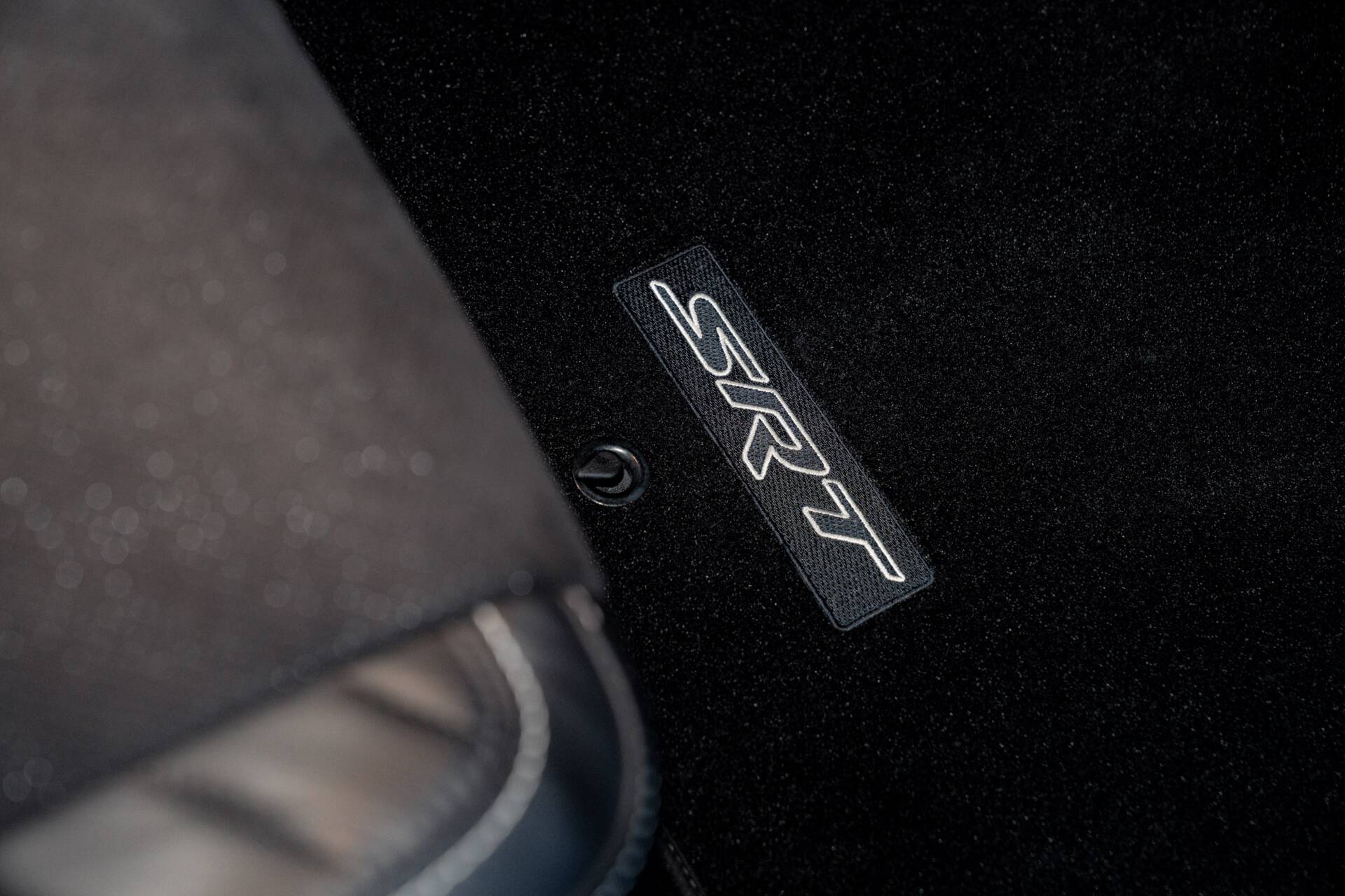 Slip inside, and the scent of Alcantara and Laguna leather fills the air. The steering wheel, wrapped in suede with a crimson SRT logo. Carbon fibre trim glistens subtly in the dim cabin light, while a small instrument panel plaque quietly declares the name.