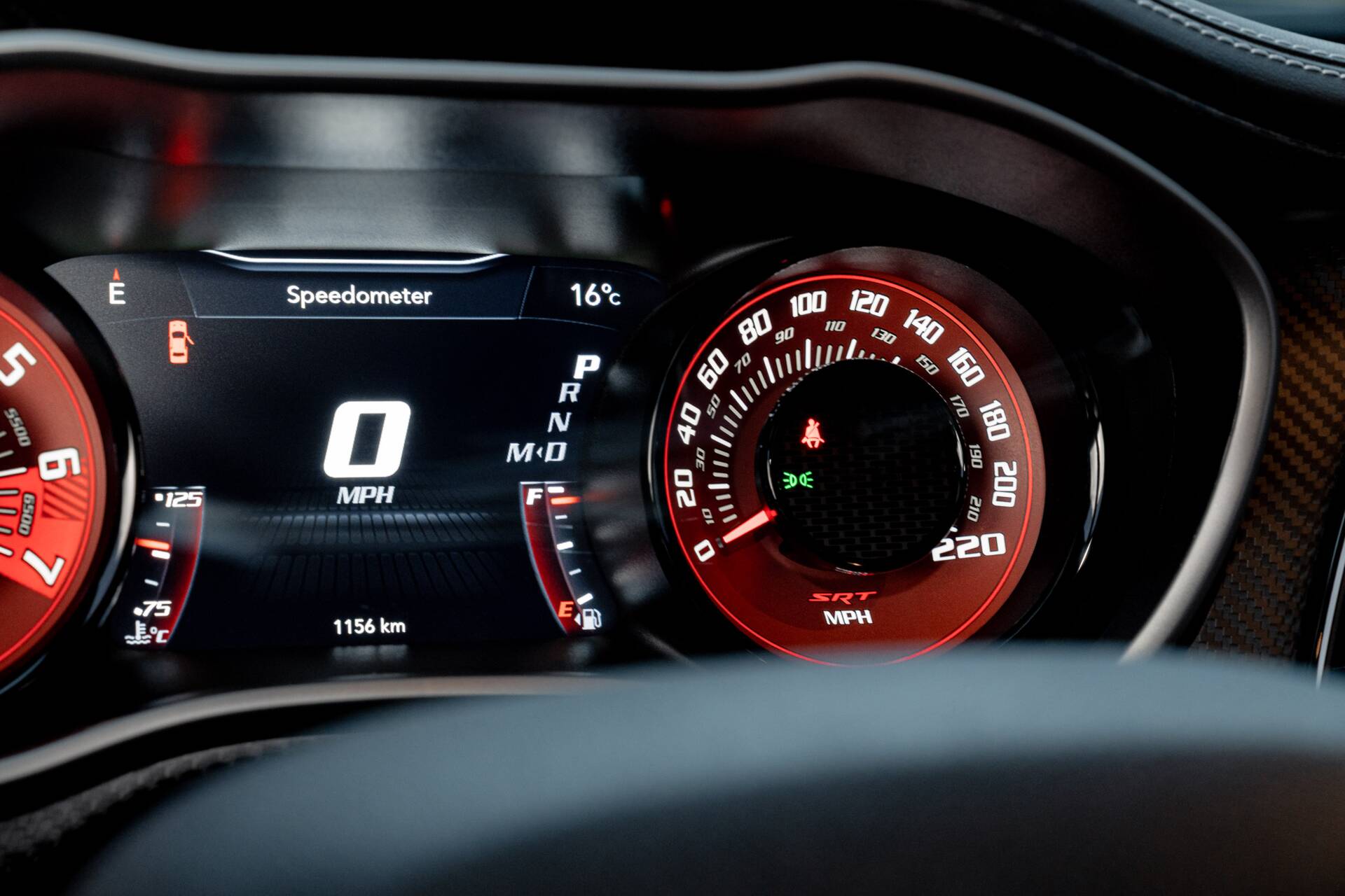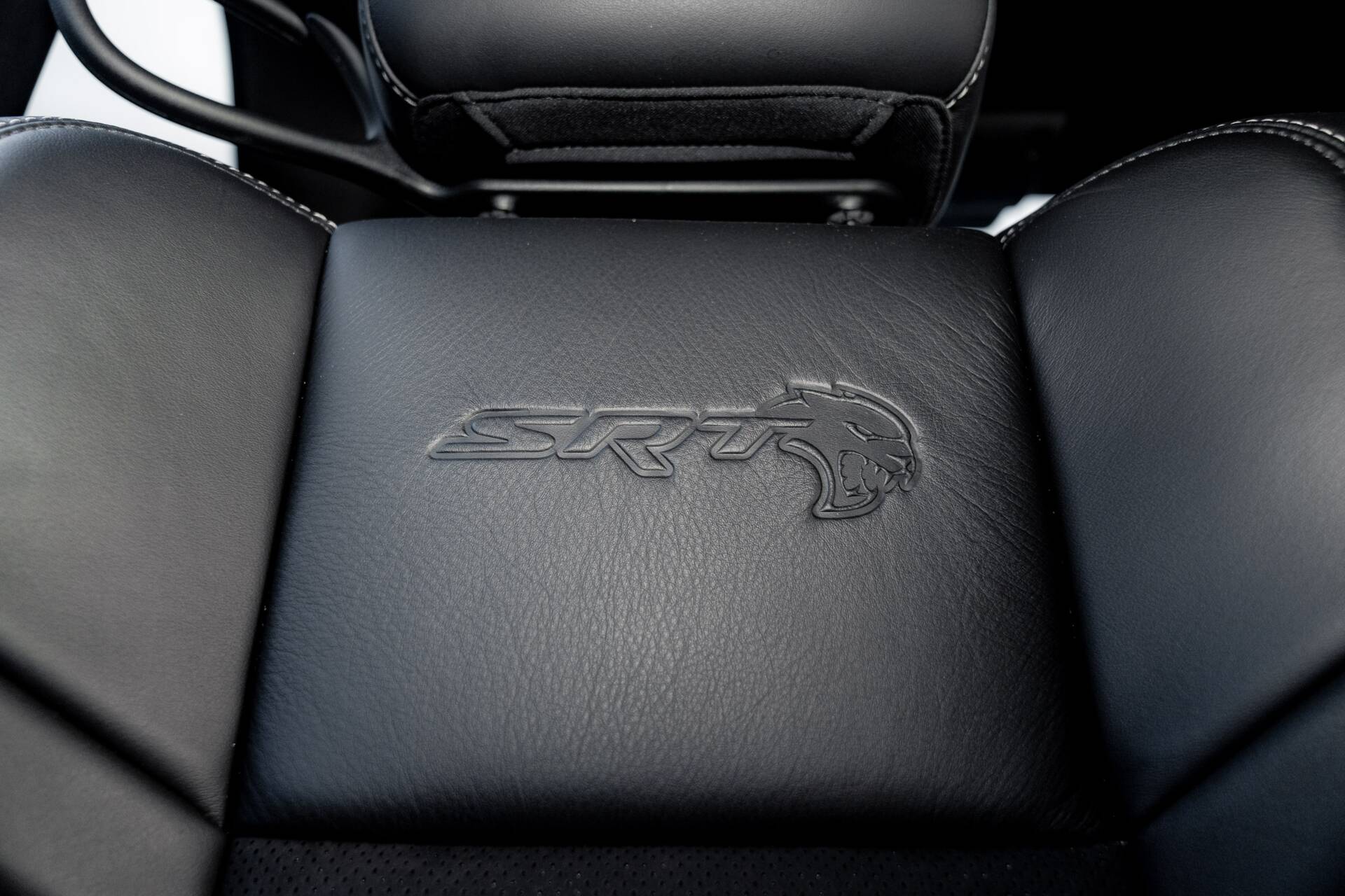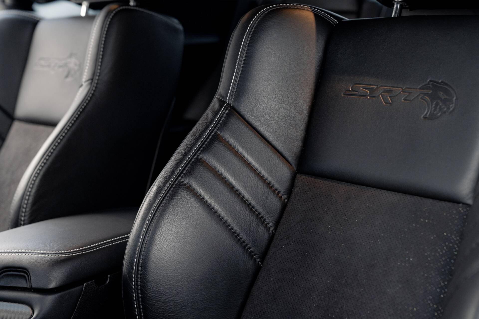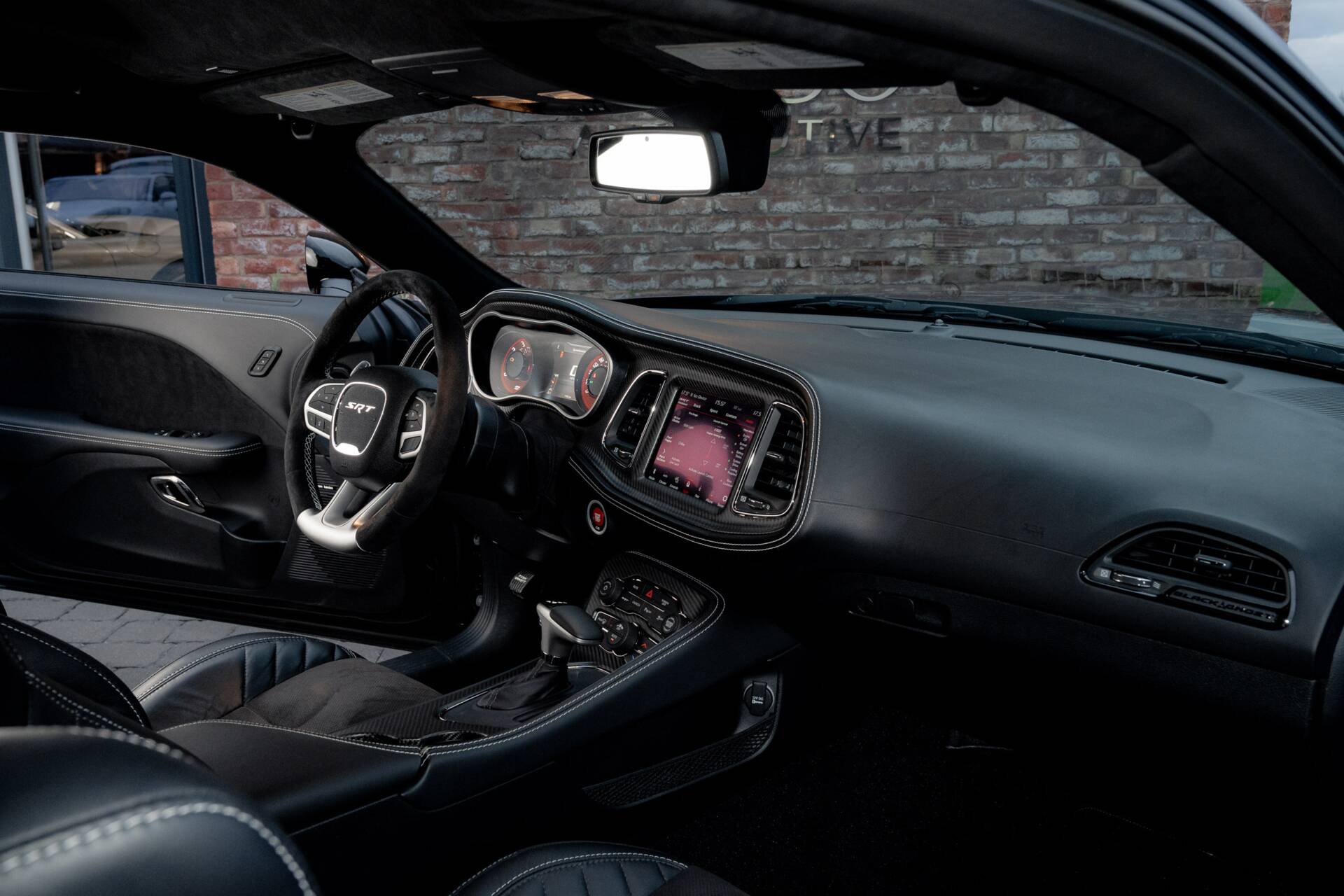 Slip inside, and the scent of Alcantara and Laguna leather fills the air. The steering wheel, wrapped in suede with a crimson SRT logo. Carbon fibre trim glistens subtly in the dim cabin light, while a small instrument panel plaque quietly declares the name.
