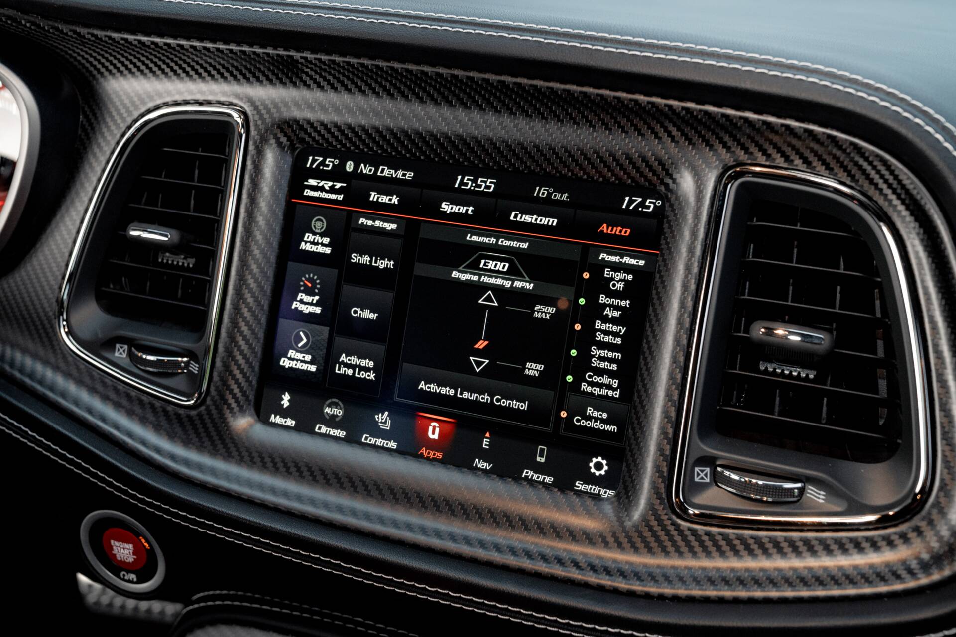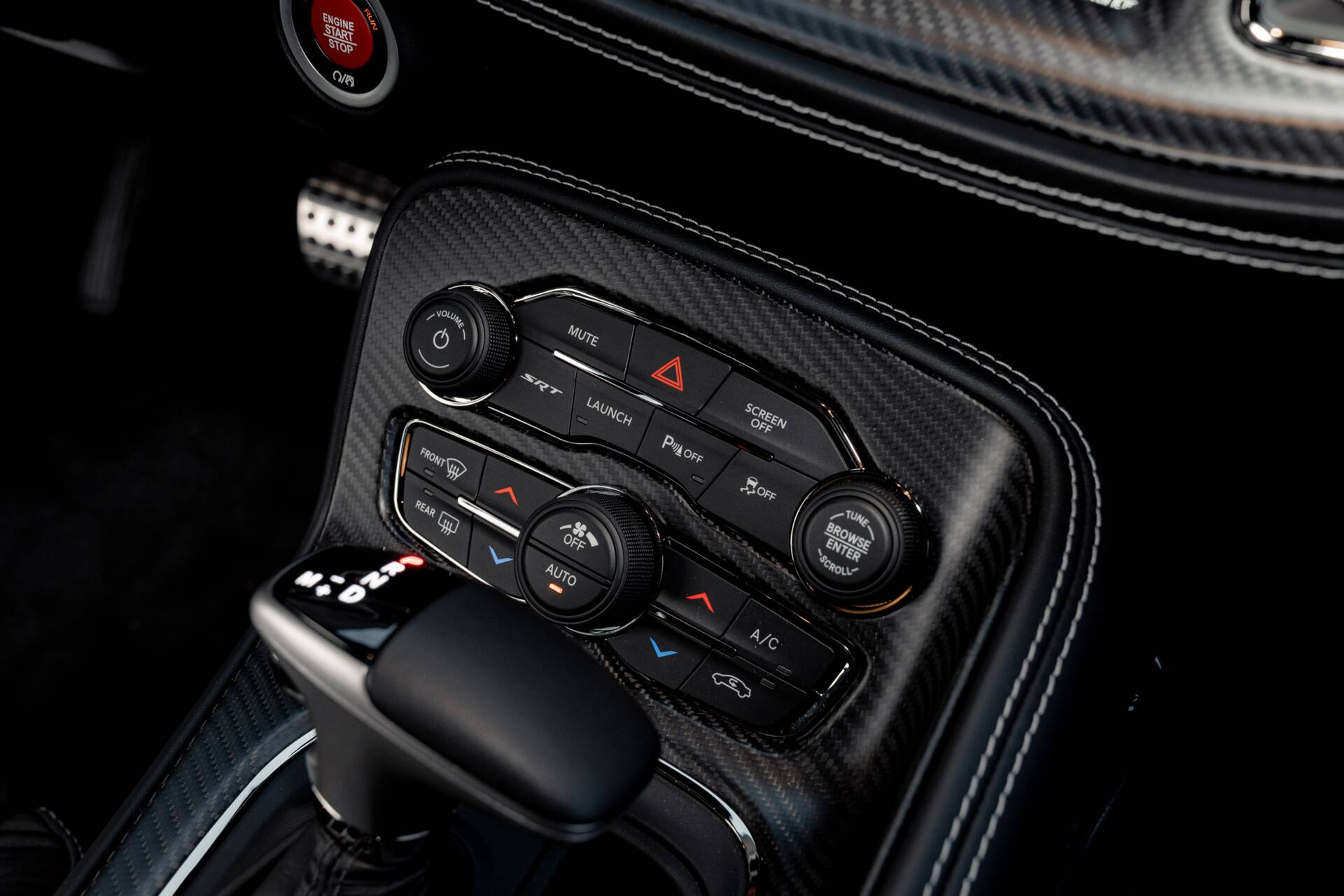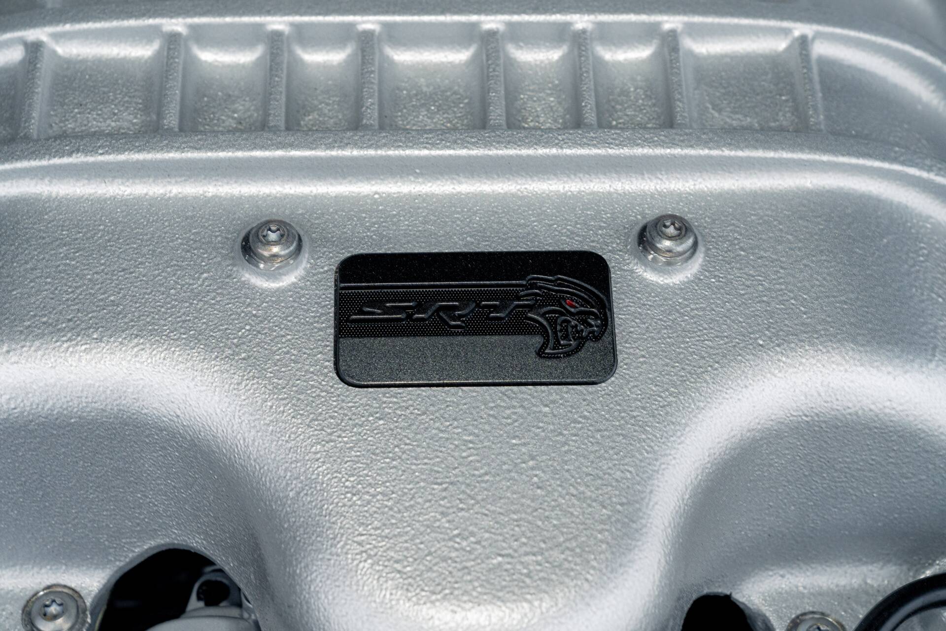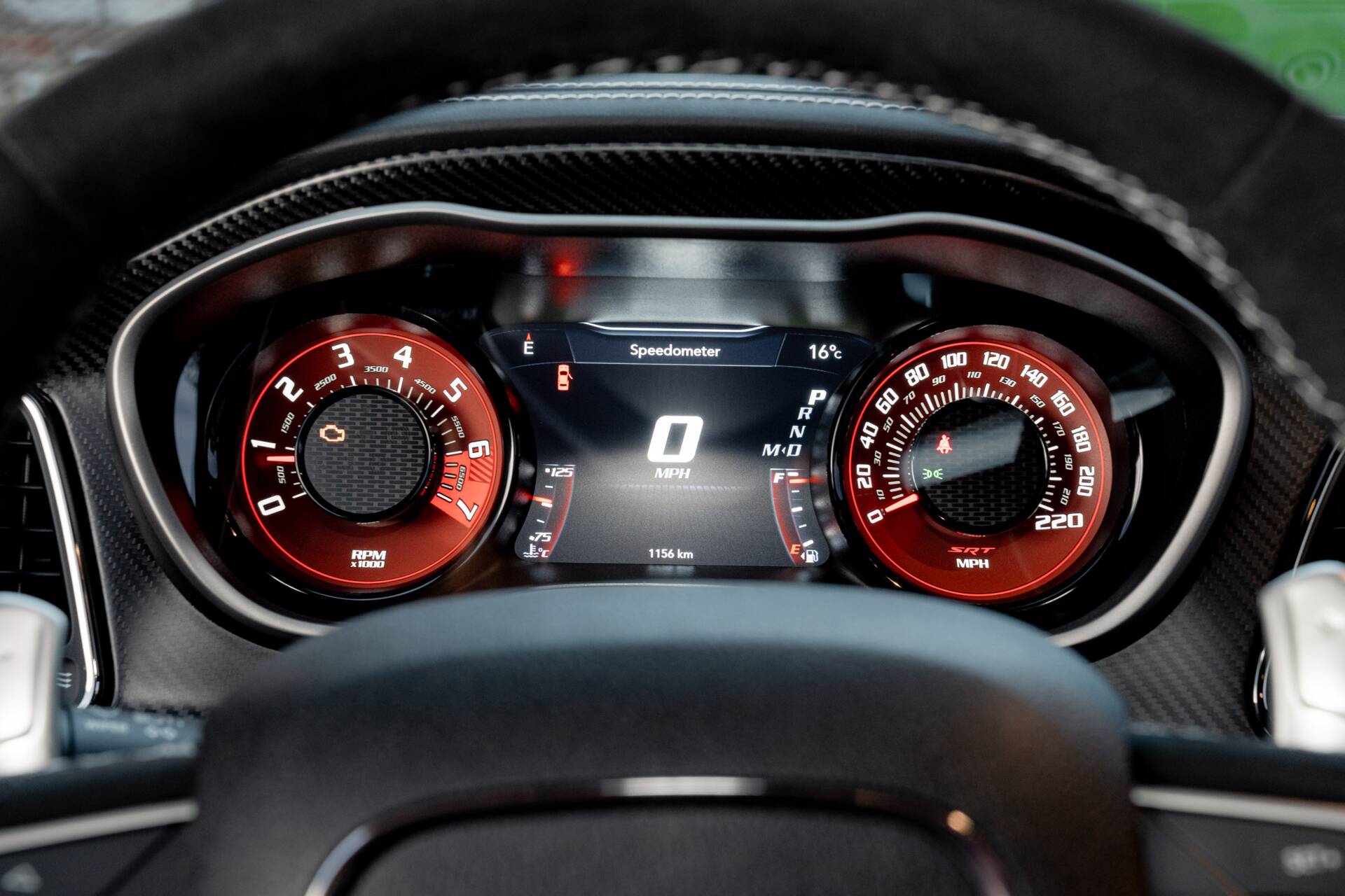 Slip inside, and the scent of Alcantara and Laguna leather fills the air. The steering wheel, wrapped in suede with a crimson SRT logo. Carbon fibre trim glistens subtly in the dim cabin light, while a small instrument panel plaque quietly declares the name.