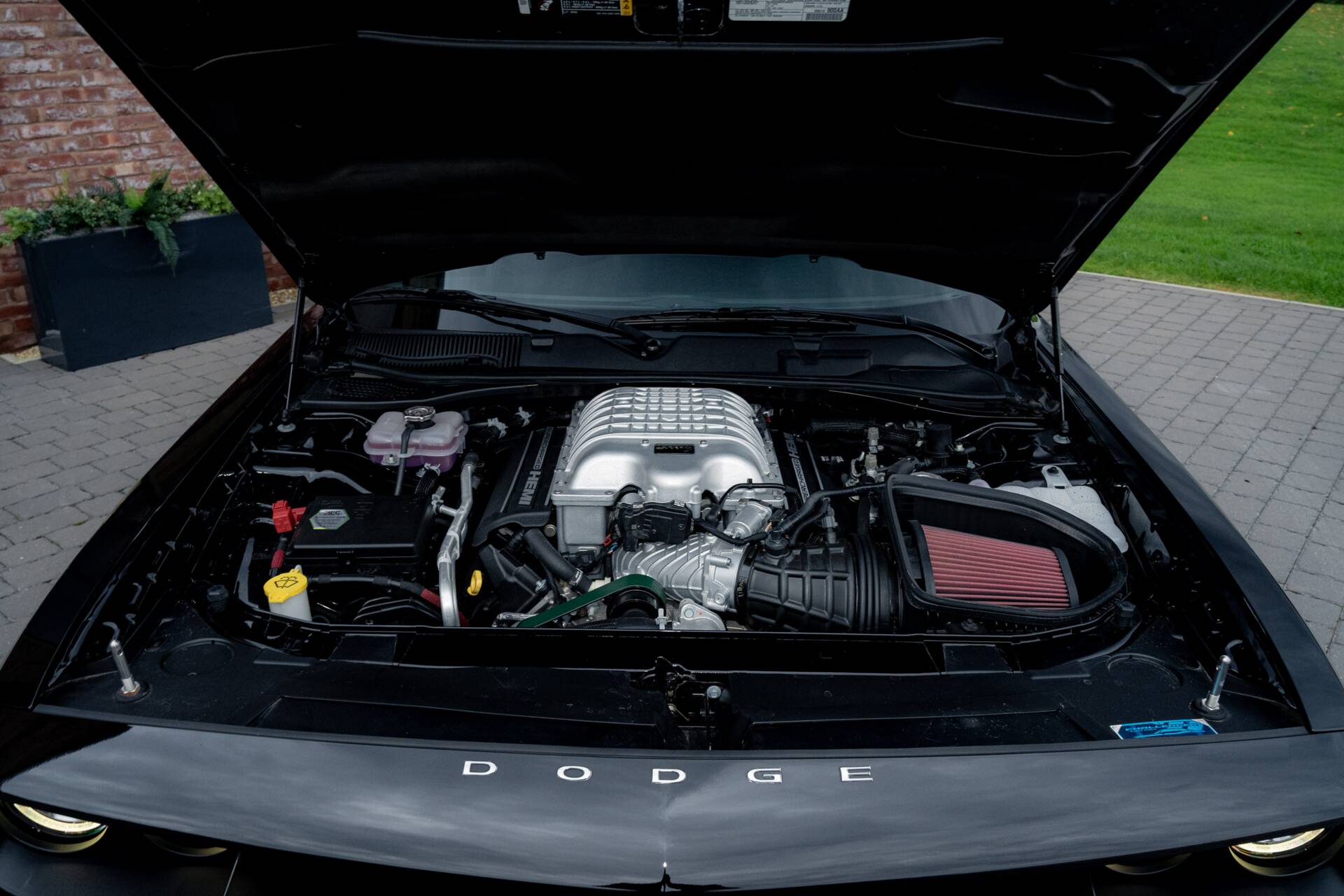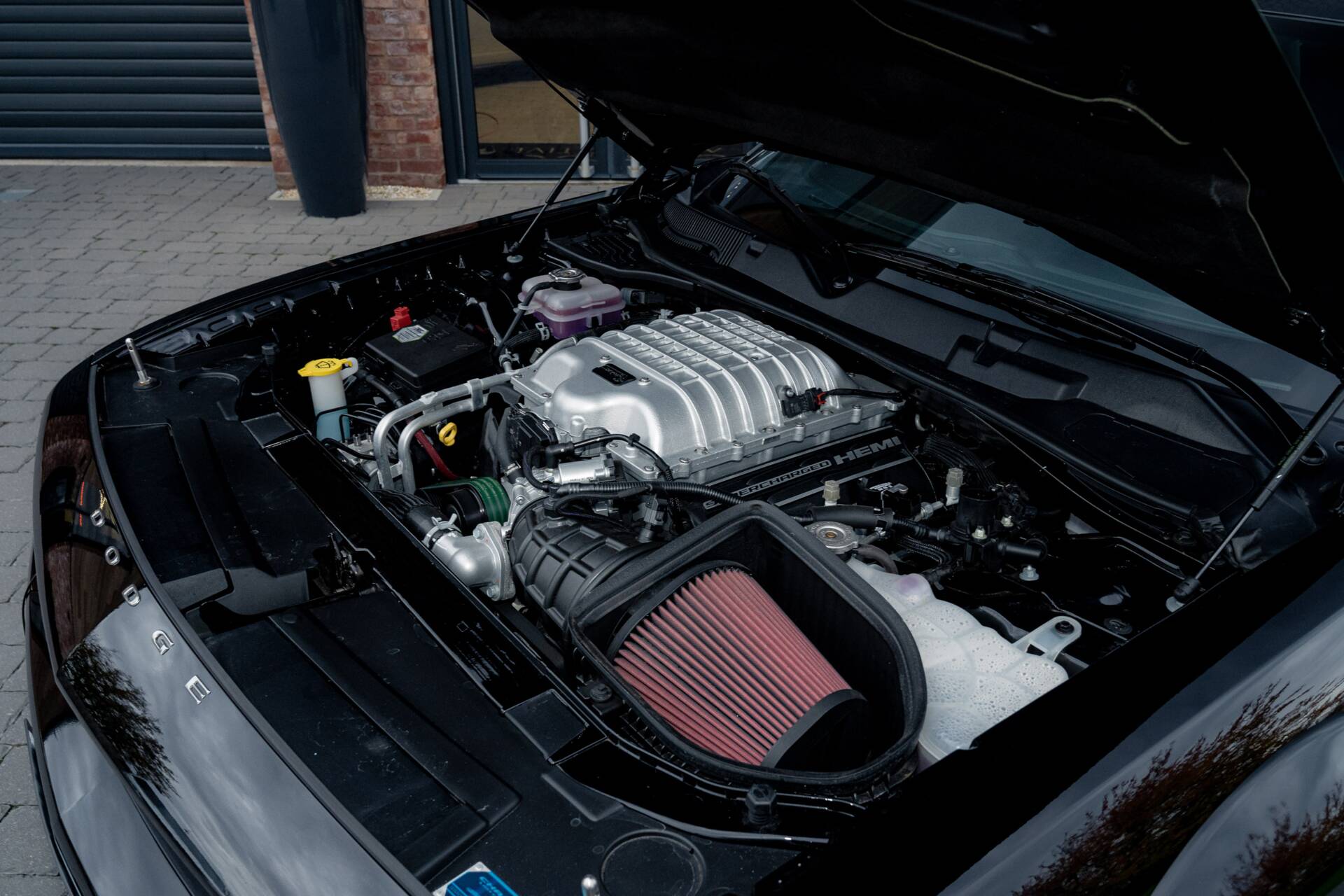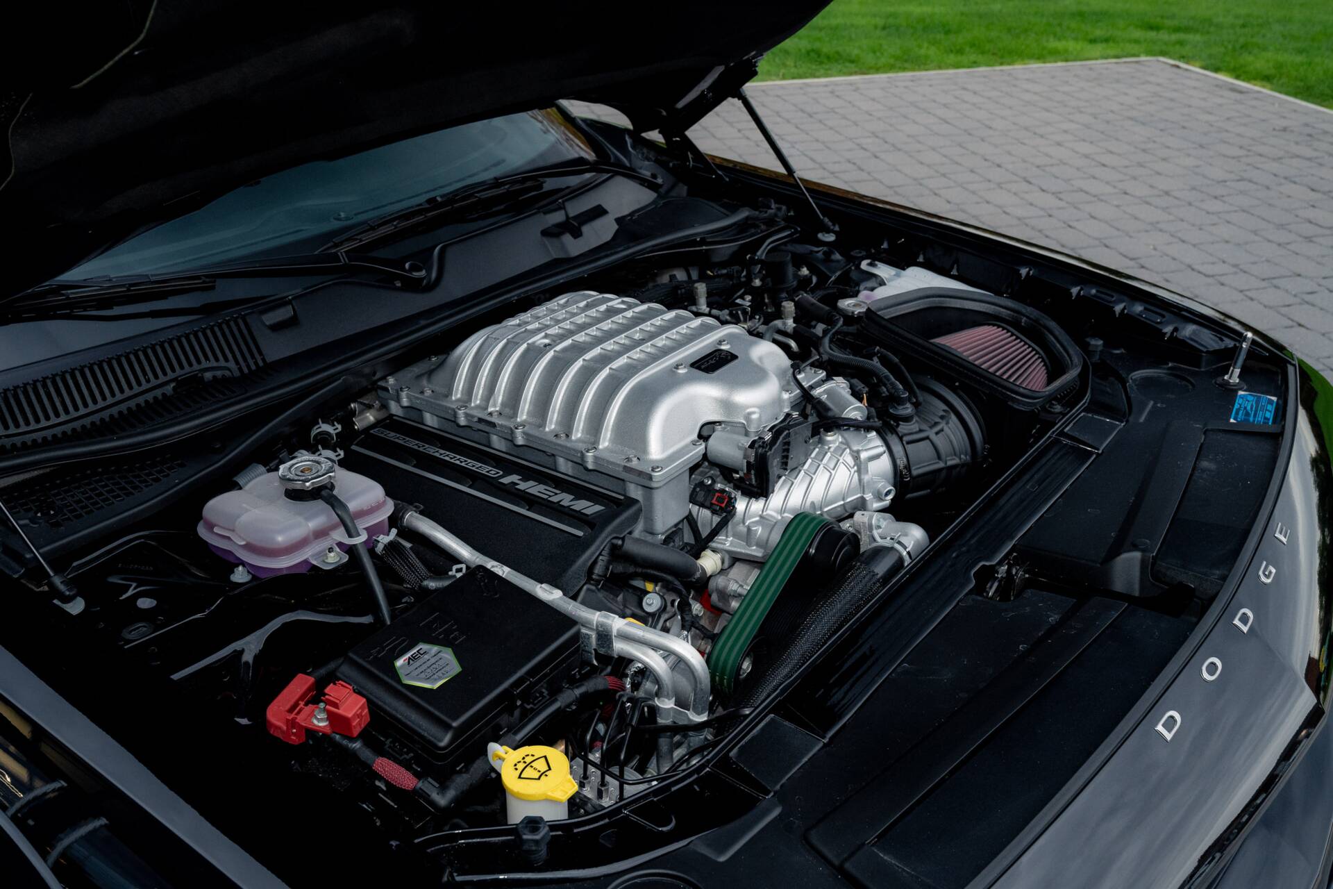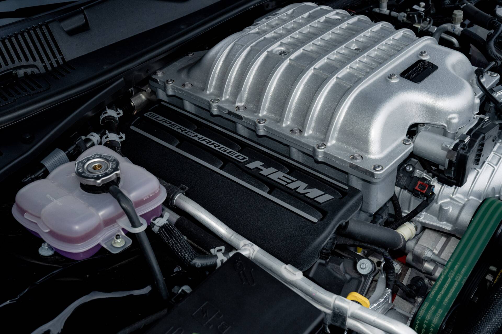 Under the long, sculpted hood lurks a supercharged 6.2-litre HEMI V8, growling out 807 horsepower, enough to twist the earth beneath it. Mated to an 8-speed TorqueFlite automatic, this beast launches like a rocket, its rear tires clawing at the tarmac leaving the kind of twin stripes that make car enthusiasts grin.  The 3.09 rear axle ratio, the widebody stance, and the massive 20×11-inch Satin Carbon “Warp Speed” wheels give it the posture of a predator ready to pounce. Black six-piston Brembo brakes stand by to rein it in.