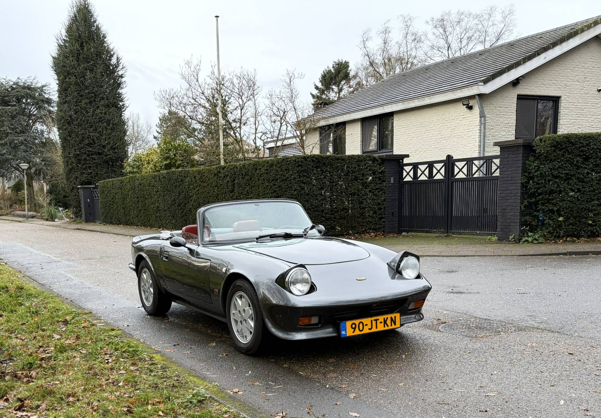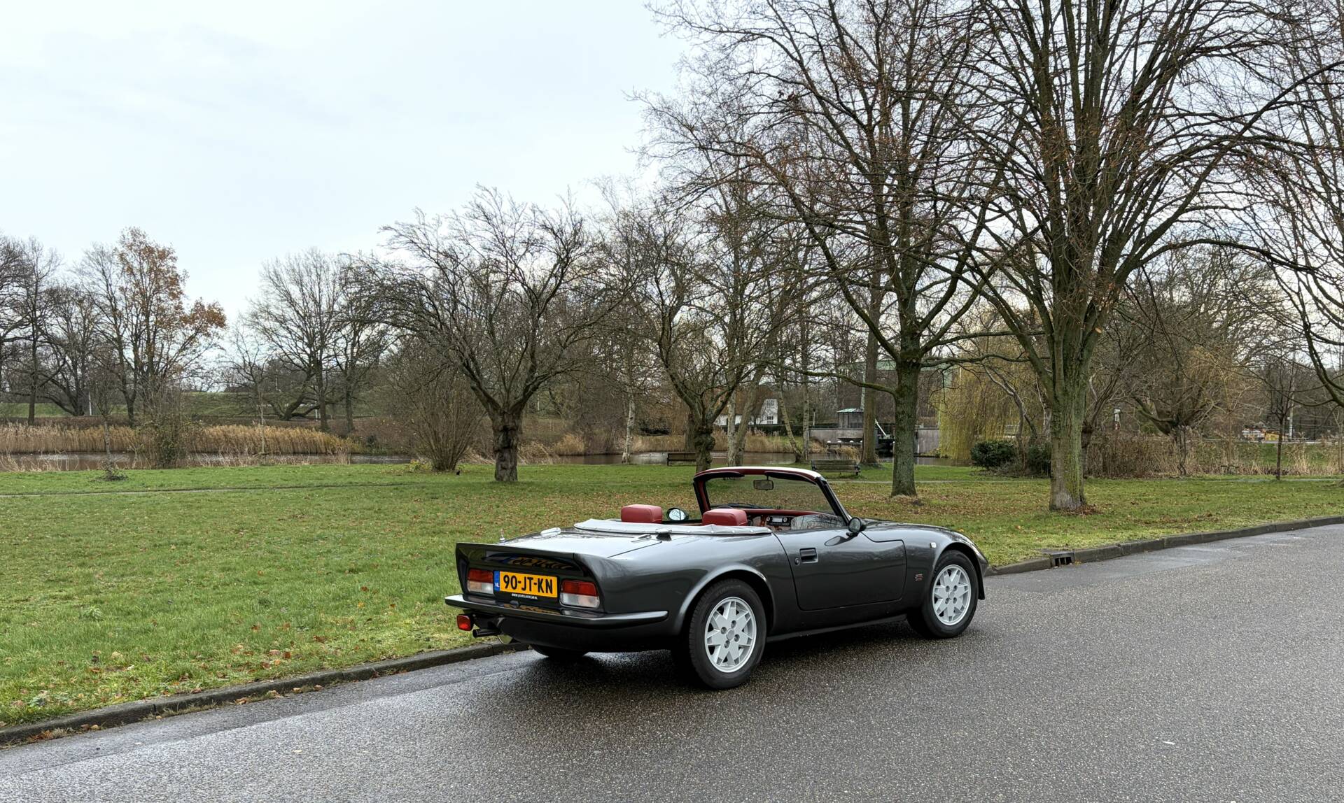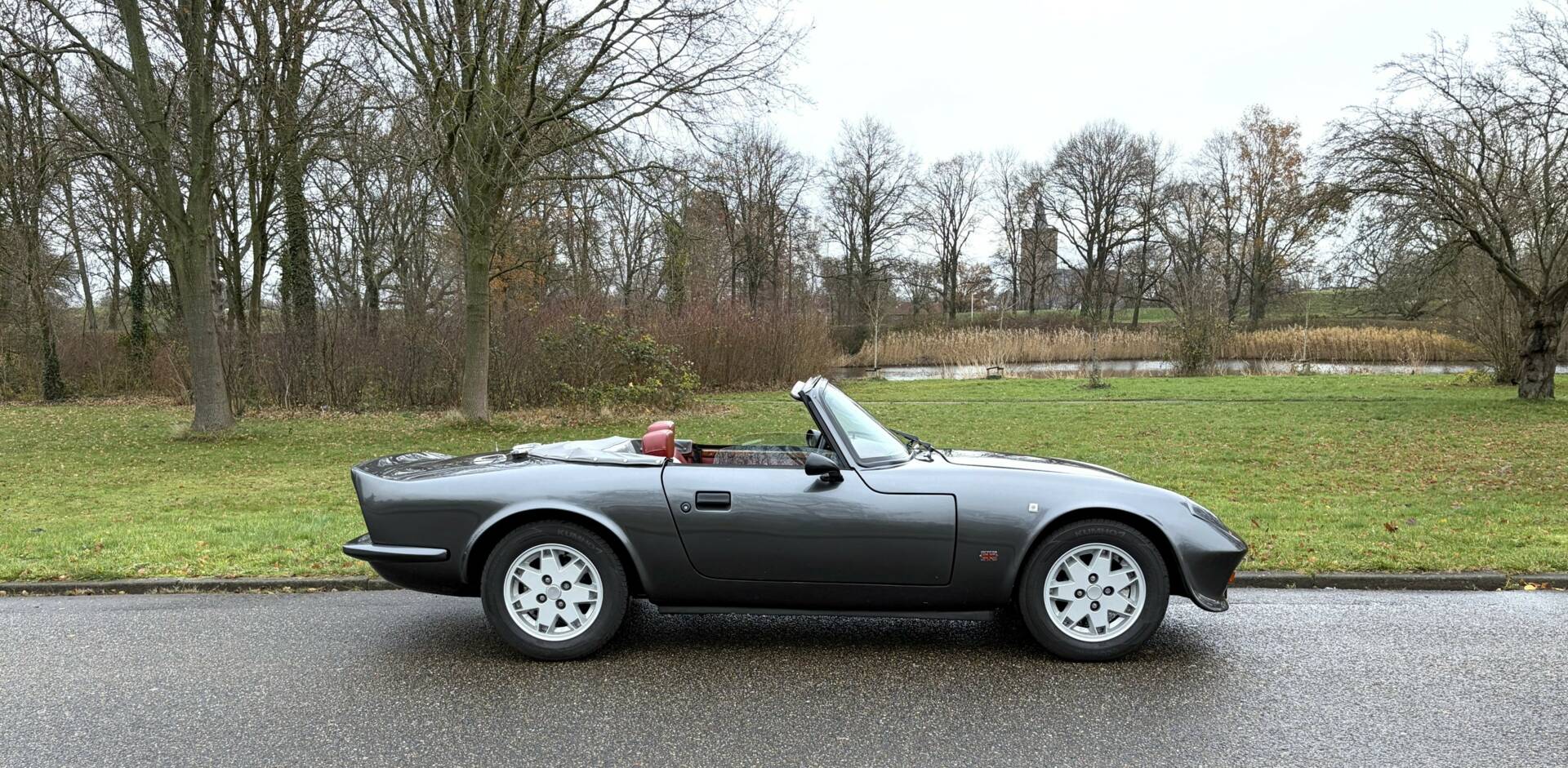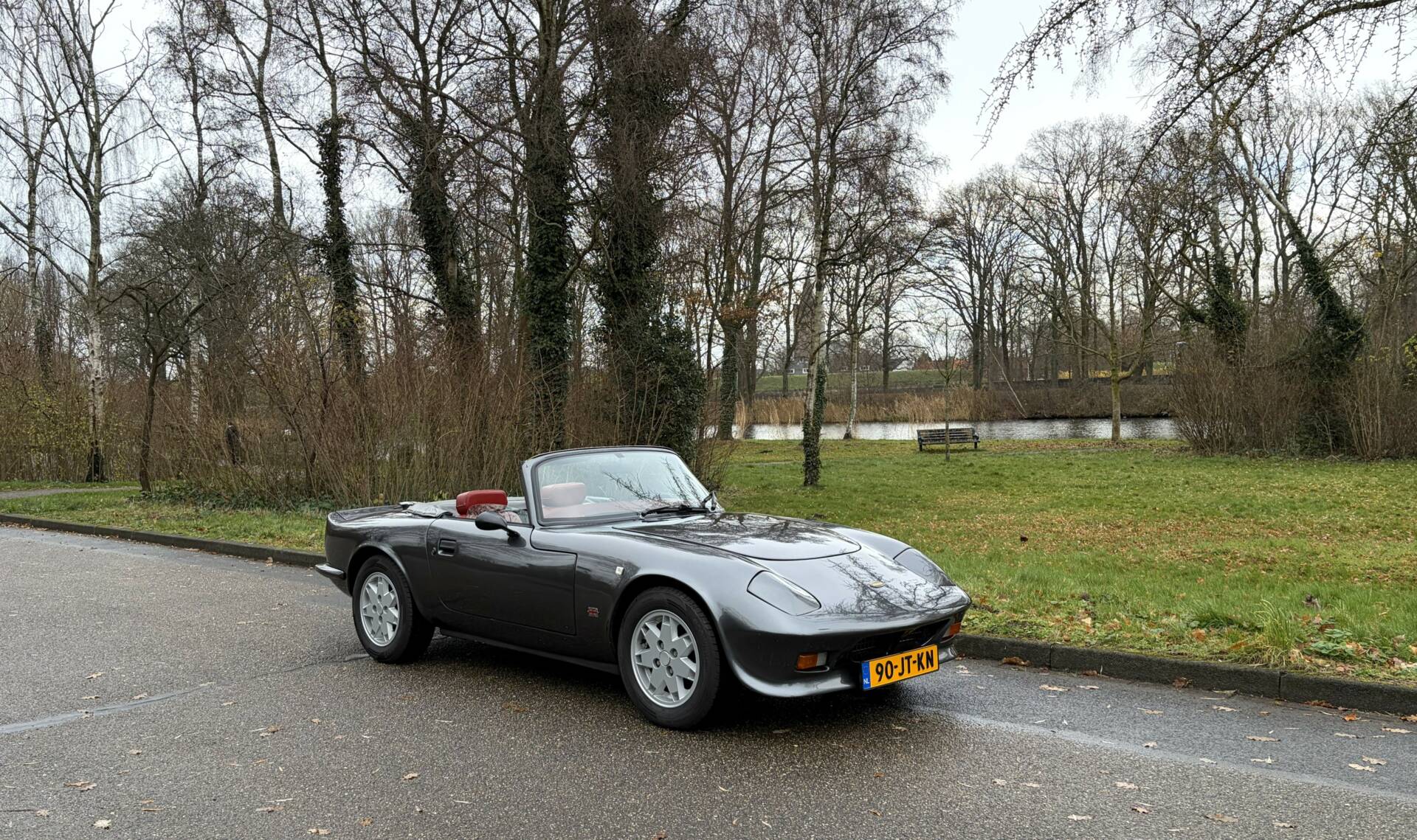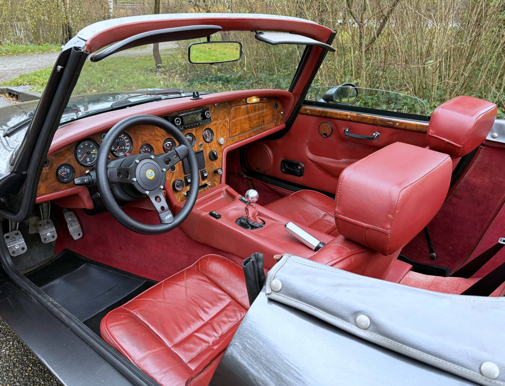This Evante has been repainted in its original colour, ‘Anthracite Metallic’, and the paintwork is of high quality. The body is made of polyester reinforced with Kevlar, making it ultra-light, very rigid and extremely strong. Unfortunately, it is also expensive to produce, and everything is built by hand. Every connoisseur knows that it is very difficult to get a polyester bodywork nice and smooth. The advantage is that rust does not stand a chance. There are some signs of wear on the left side, but that is to be expected after almost 37 years. The original bonnet is still remarkably beautiful and closes tightly. The original cover is also present, as is the tonneau cover. A few clips are missing. The original rims are beautiful and fitted with the correct tyres.