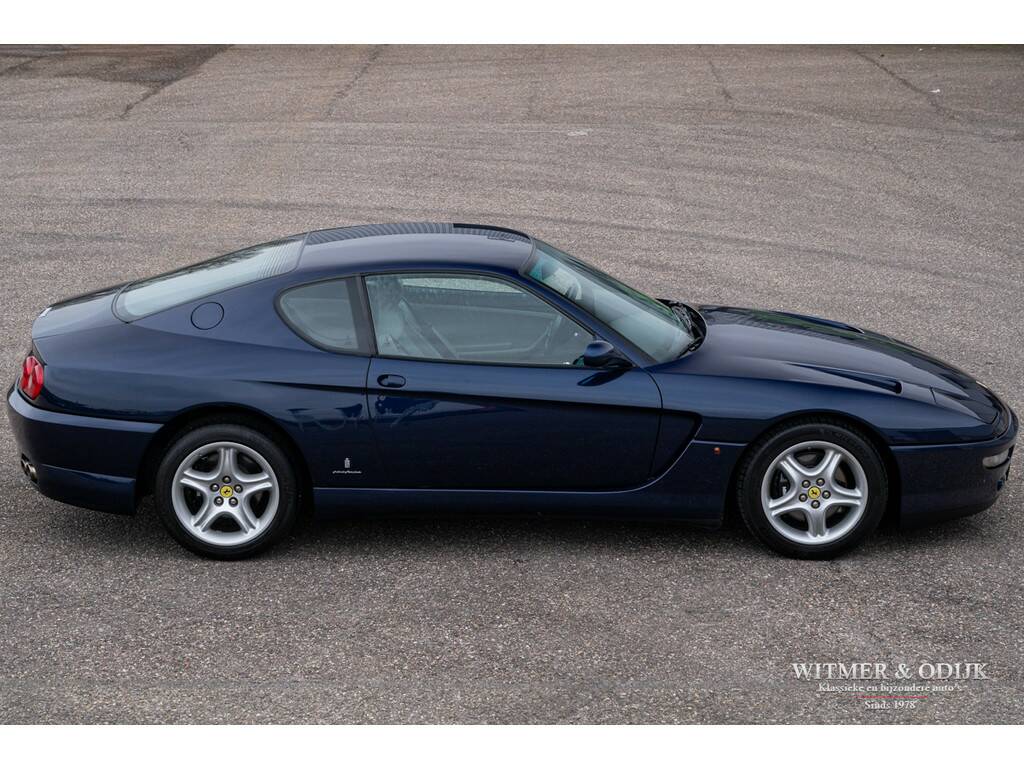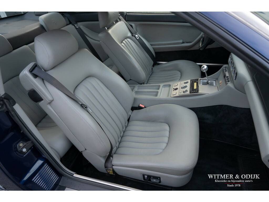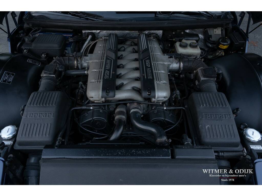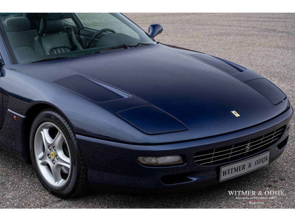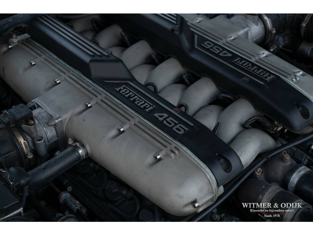 De 456 is een stijlvolle 'Gentlemen Drivers' GT, een zeker voor Ferrari gedistingeerde verschijning. Het is geen agressief ogende en nerveus rijdende pure sportauto. Misschien zelfs daarom een bijna halfbloed Ferrari met wat dna van een automobiel op stand. Bij introductie was het overigens wel de snelste vierzitter ter wereld, dat vermogen komt echter eerder het comfort ten goede. De 442 pk sterke 12 cylinder bezorgt de auto een souplesse en rijgemak waar een reisauto op topniveau aan moet voldoen. Middels de electronisch instelbare schokdempers biedt de auto indien gewenst overigens wel iets meer van het straffe sportwagen gevoel. Gemiddeld gaat u die schakelaar in de praktijk weinig gebruiken. De 456 is ingericht om haar bestuurder en passagiers te behagen. Ruime en volledig electrisch instelbare stoelen bieden ook grotere personen goede steun, het mooie op de bestuurder gerichte dashboard is een genot om naar te kijken en het interieur biedt in deze kleur een ruimtelijk gevoel. De 456 is verworden tot een echte klassieker die zeker in deze conditie door iedere autoliefhebber hoog gewaardeerd wordt. Ontwerper Pininfarina werd in de ontwerpfase sterk geïnspireerd door de beroemde 365GTB/4 Daytona. De lange motorkap, daklijn naar achter toe en de achterlichten zijn de meest in het oog springende herinneringen aan de Daytona. Ook de zgn. 'transaxle' motor en versnellingsbak opstelling (motor voor en versnellingsbak achter) zien we terug in de 456GT. In 1992 geïntroduceerd bij de viering van het veertigjarige dealerschap van garage Francorchamps in België. Leverbaar met een handgeschakelde zesbak en een automaat met vier versnellingen, de handbak is natuurlijk de leukst rijdende en tegenwoordig meer waard dan een automaat. Het model wordt gemiddeld het meest gewaardeerd in donkerblauwe tinten, het hier aangeboden exemplaar is uitgevoerd in fraai Blue Le Mans Metallizzato.