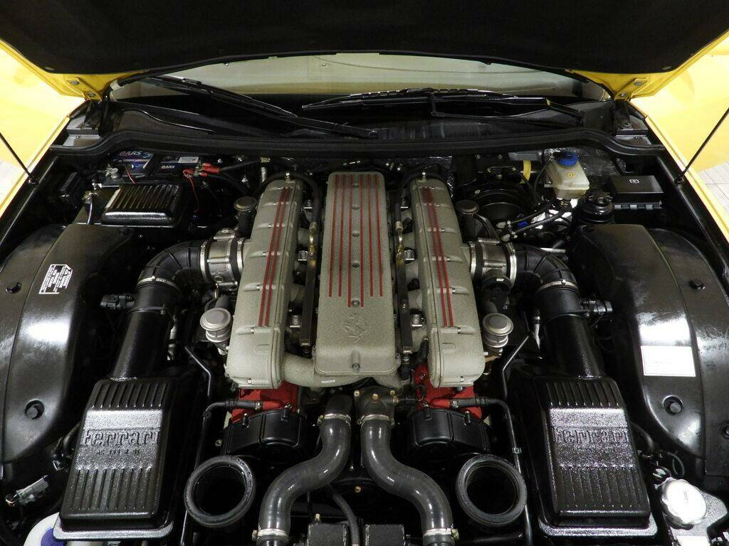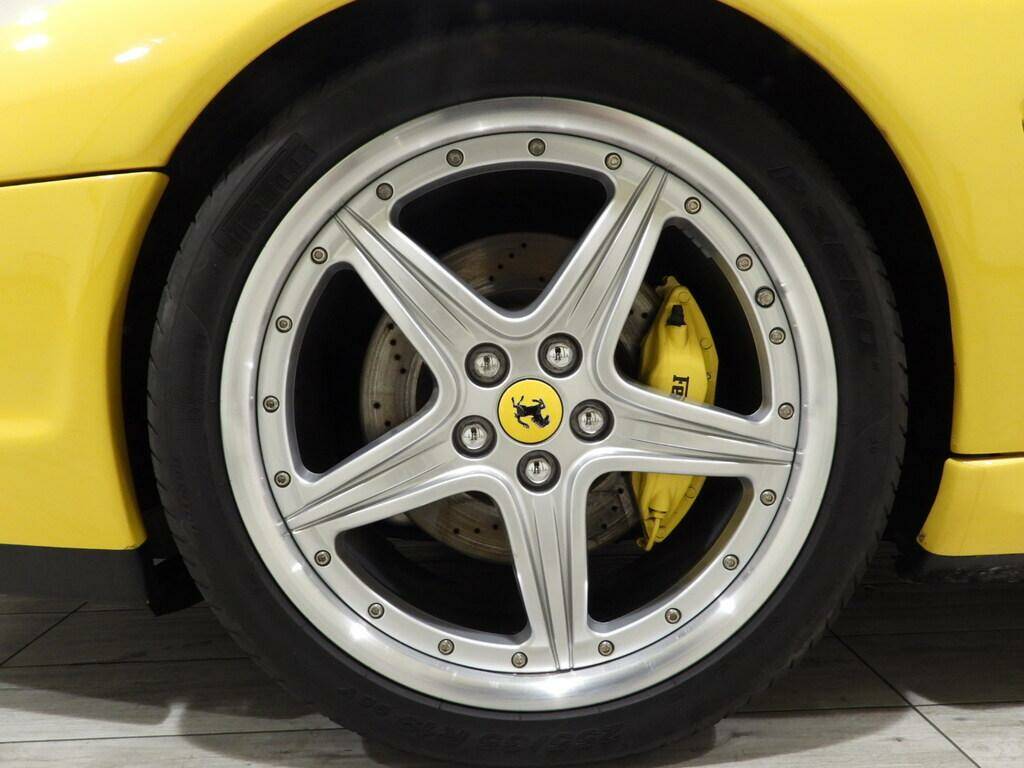 Electrically adjustable seats with memory function, full black leather dashboard and panels with Modena yellow piping and stitching (matching the body color), black wool carpeting, three-spoke perforated leather steering wheel with paddle shifters, power windows, automatic climate control, original period Ferrari radio, five-spoke Ferrari alloy wheels with yellow calipers, 255/35 R19 front and 305/30 ZR19 rear Pirelli PZero tires, dual electrically adjustable exterior mirrors