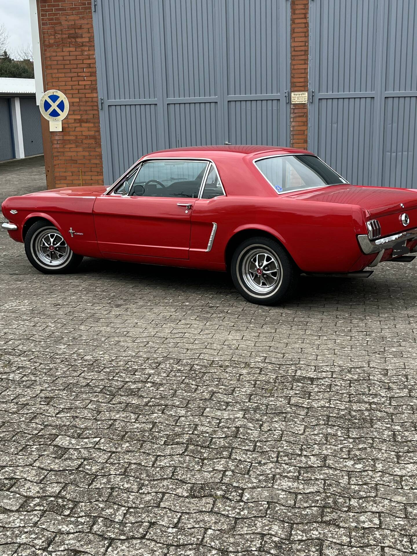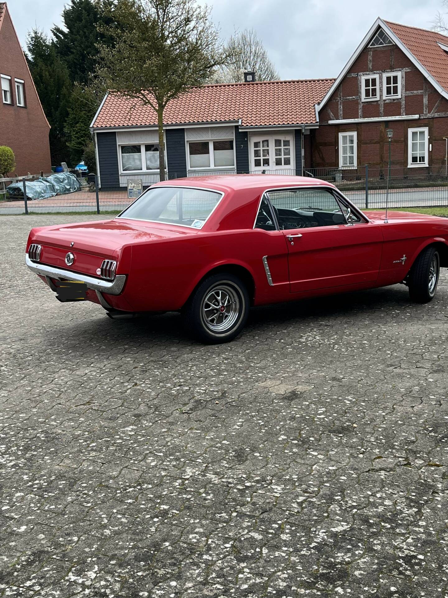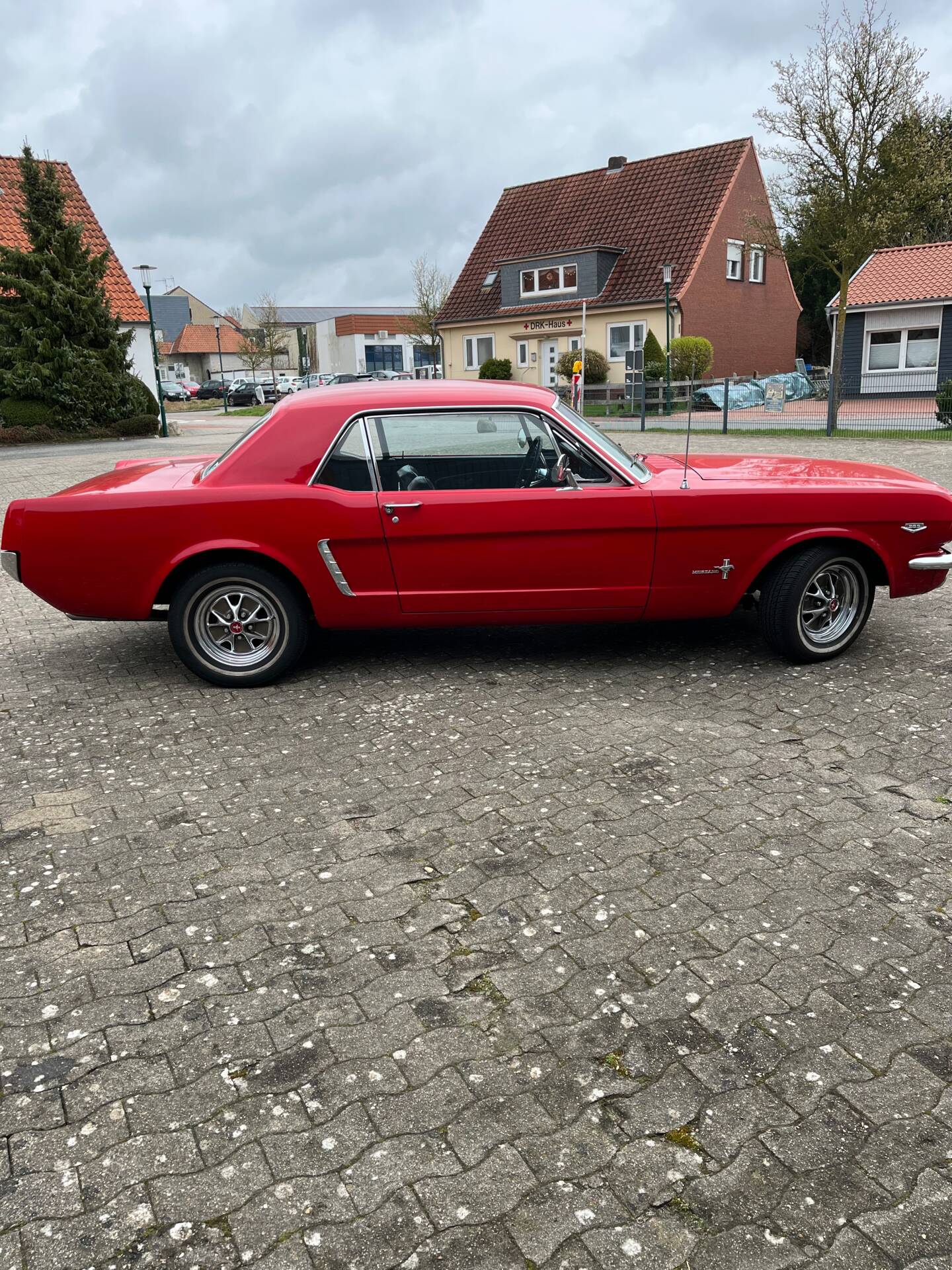 Ford Mustang aus dem Jahr 1965. TÜV neu. Selbst im Jahr 2018 aus den USA importiert und hier den Innenraum neu restauriert. Bewertungsurkunde vom TÜV aus dem Jahr 2022 liegt vor und wurde mit Note 2 angegeben. Der Wert des PKW wurde mit Euro 29.200 angegeben. Das Fahrzeug ist technisch in einem guten Zustand. Optisch könnte man noch ein paar Verbesserungen durchführen. Leider kann ich nicht genau sagen, ob das Fahrzeug die rote Farbe als Originallackierung hatte.