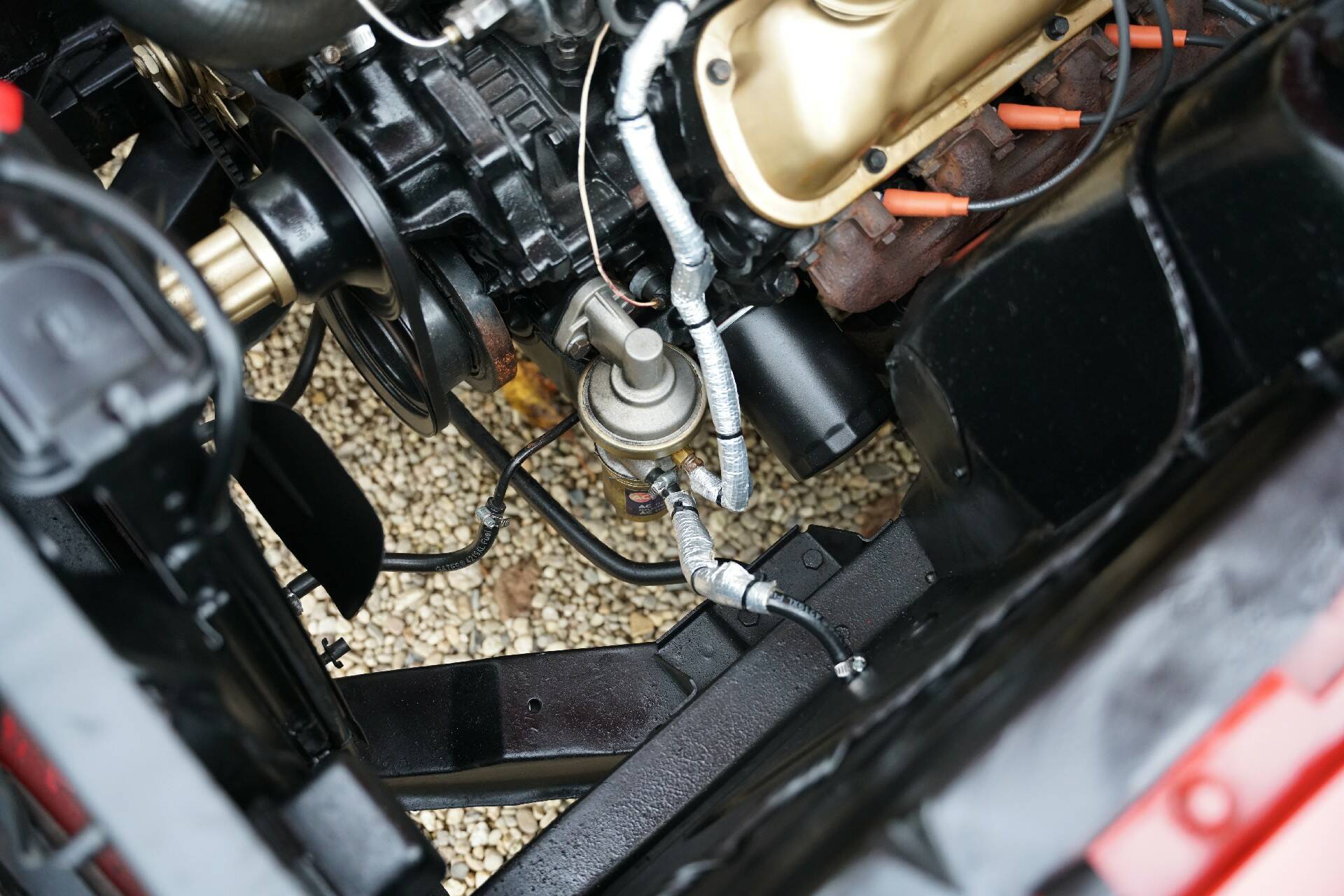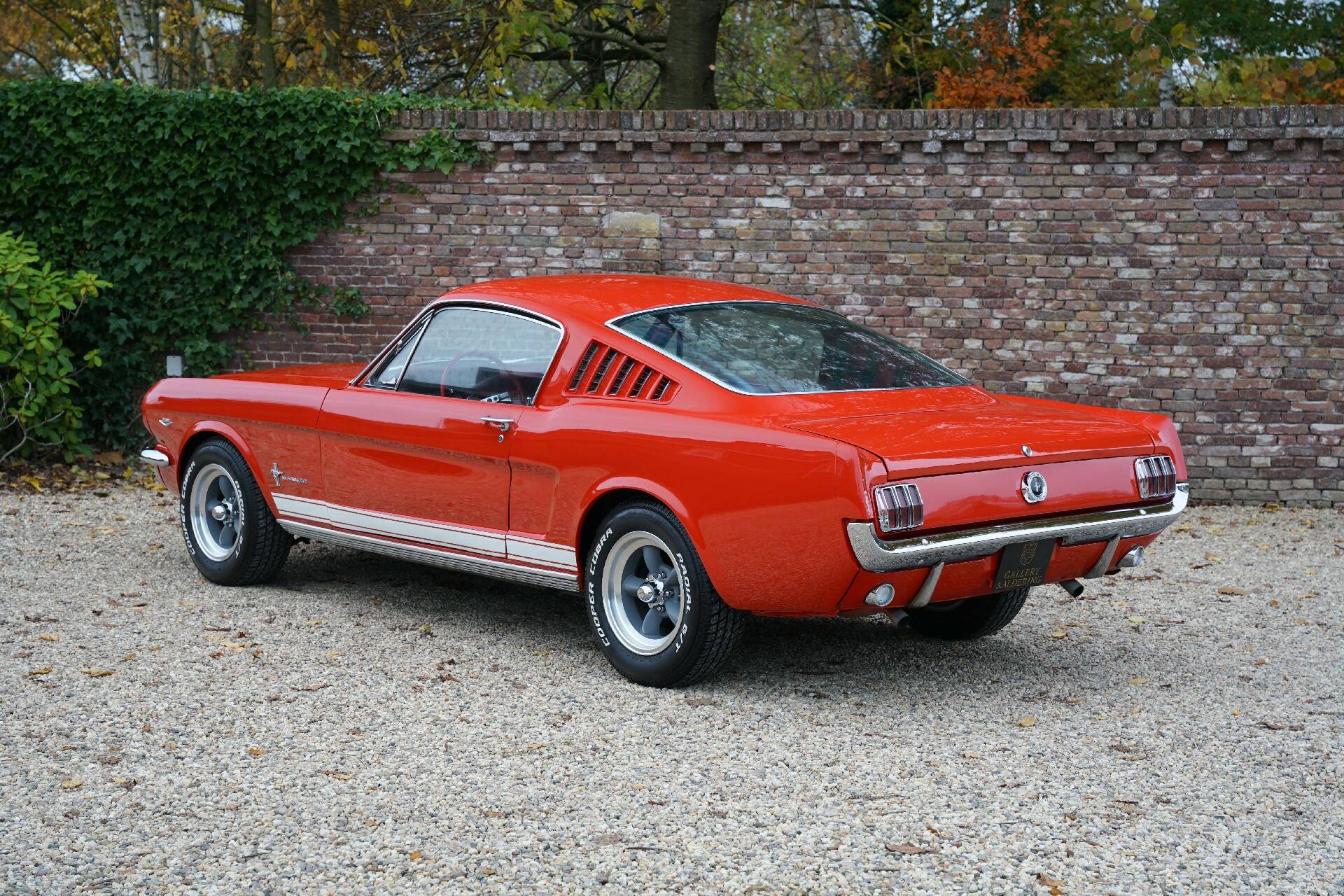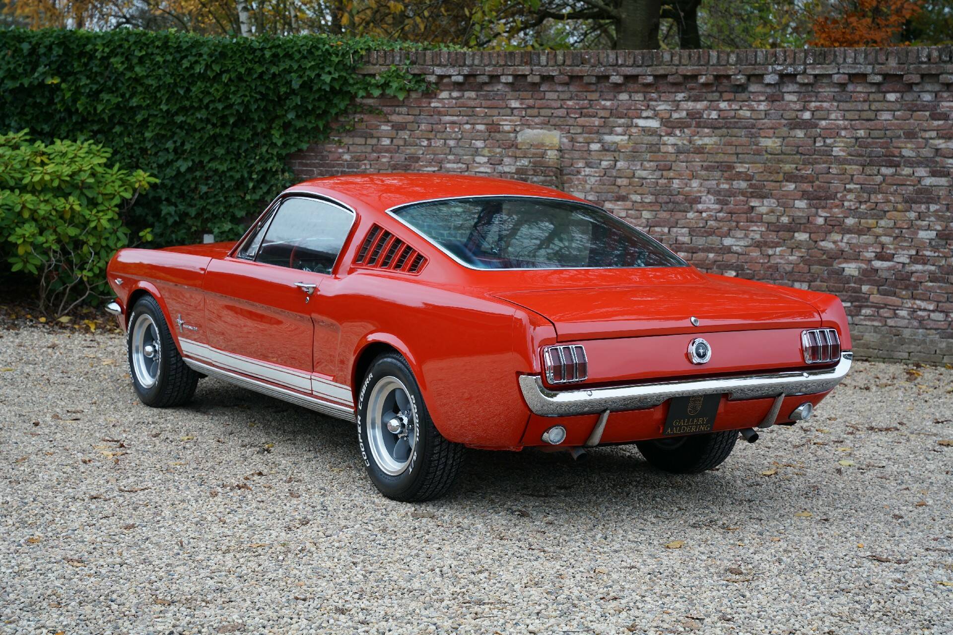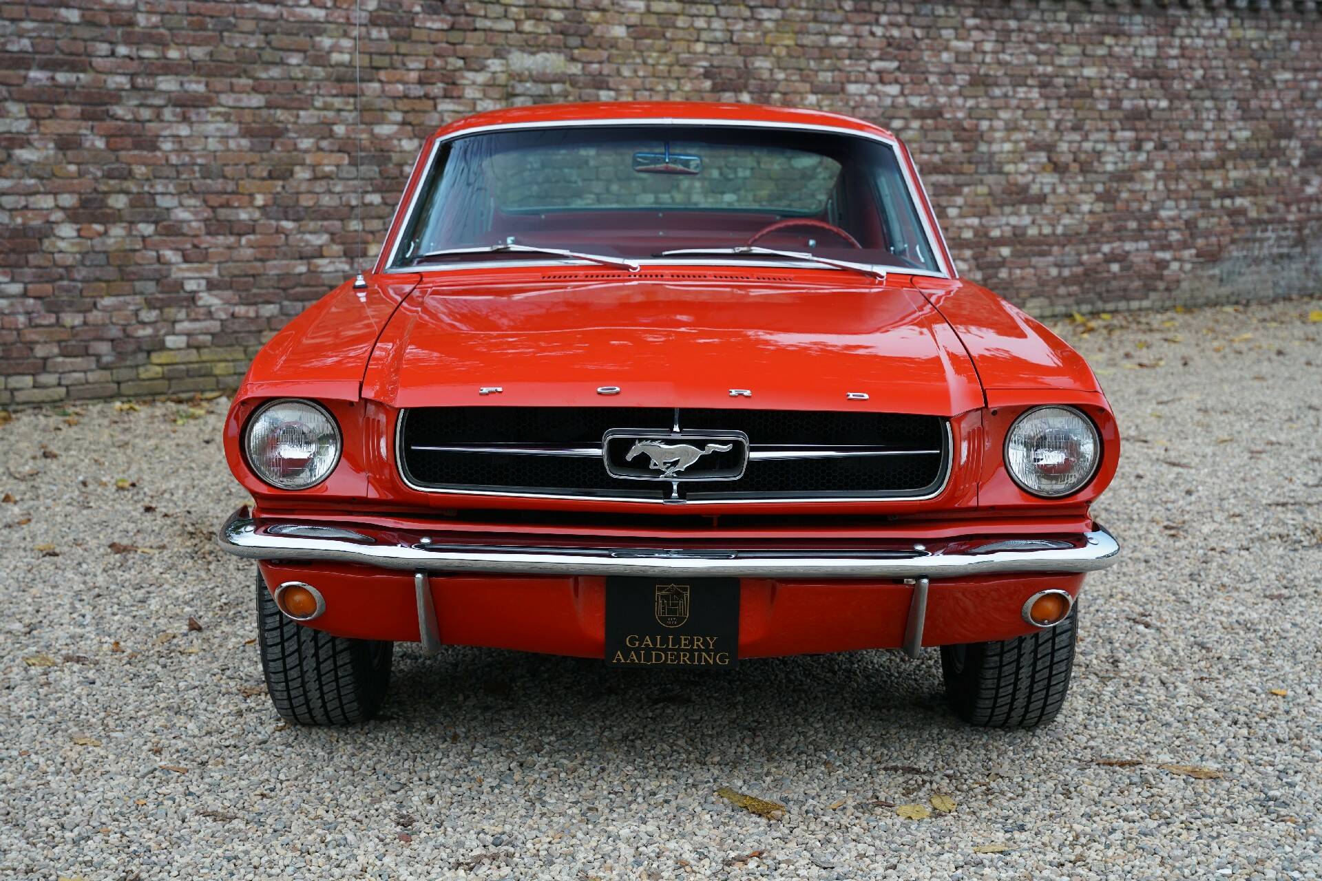 Our car is a so-called red over red example and is a feast to behold. This car has already been fully restored and is in a fine state. The nice and thin panelwork is correctly aligned and looks amazing. The chrome brightwork also fits well and looks great. The car has its original steel rims with the original hubcaps all shod in correctly sized rubber. The Mustang has been sprayed in the timeless “Rangoon Red” finish. The paintwork was particularly well redone at the time of restoration and has remained in splendid condition.