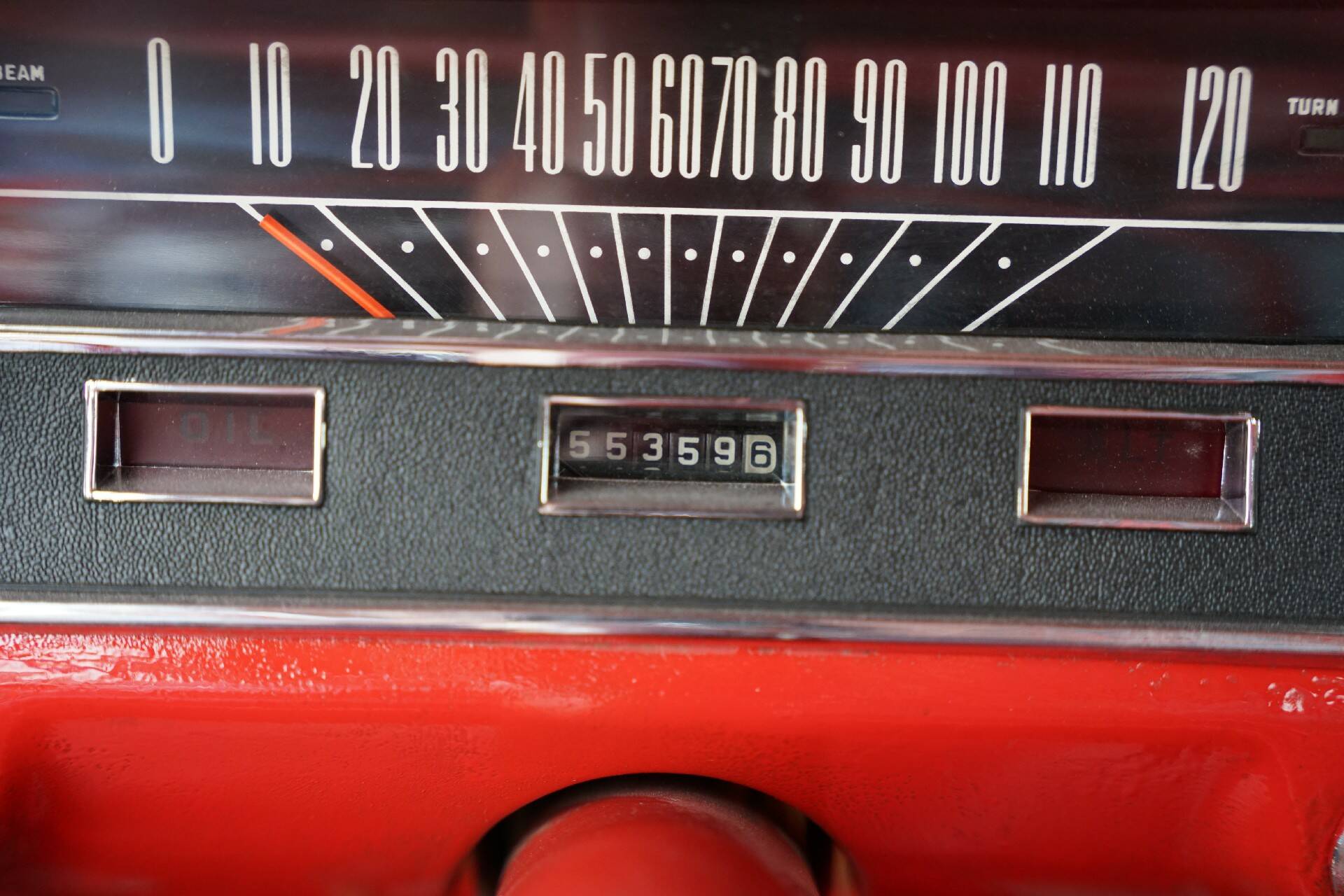 The car’s inside is divine. Red on red may sound like overkill but with a Ford Mustang Fastback it is just so very right. The replaced carpets are in good condition. The upholstery has also been renewed and looks great. The dashboard is very neat with all gauges, switches and controls working as intended.