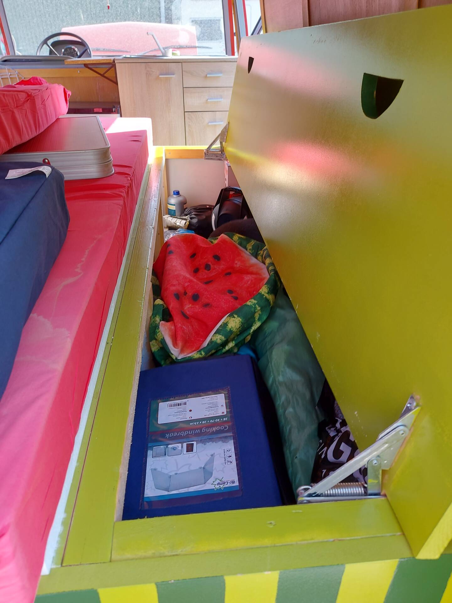 - Tafel, deze kan omlaag worden geplaatst zodat een groot bed ontstaat.
