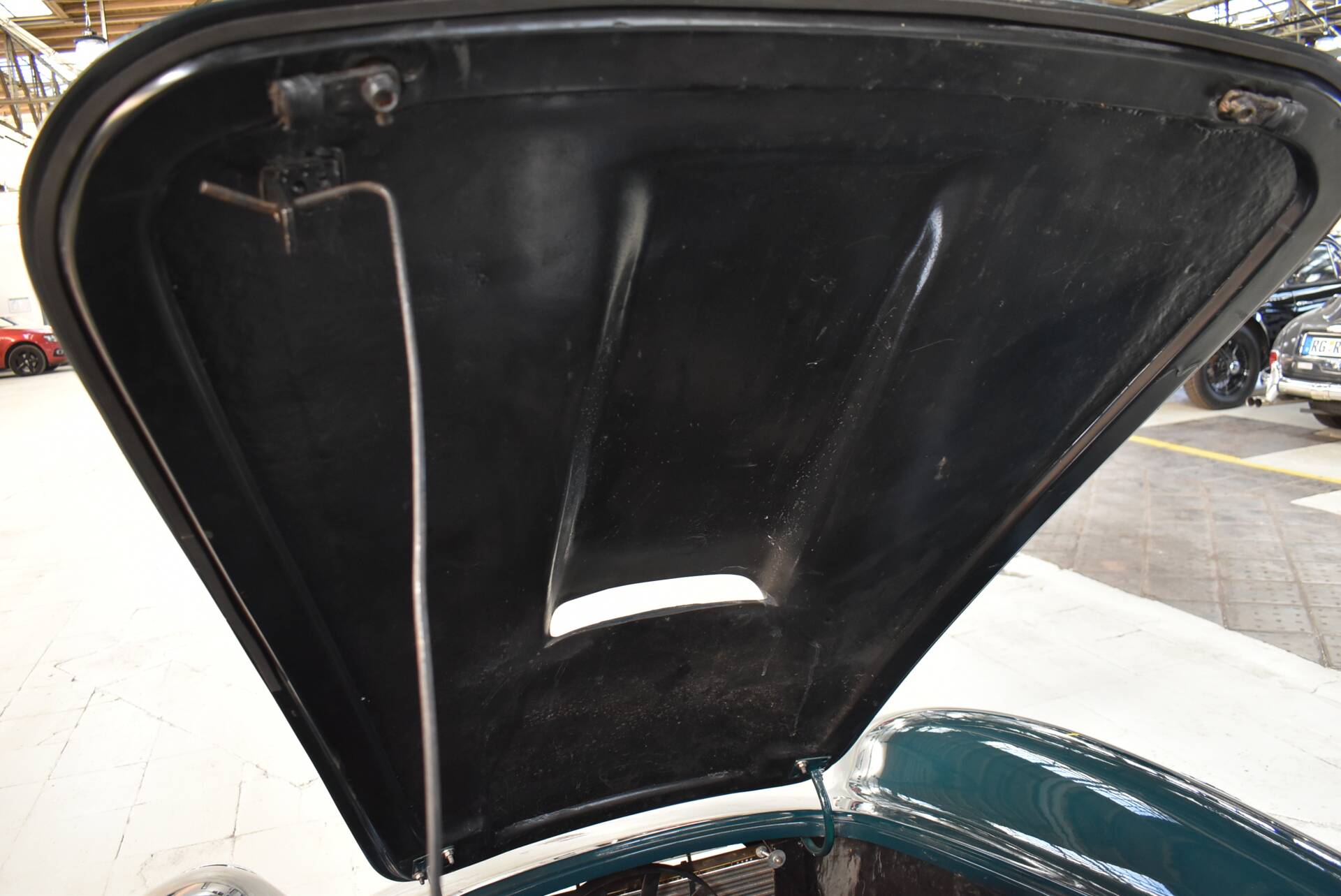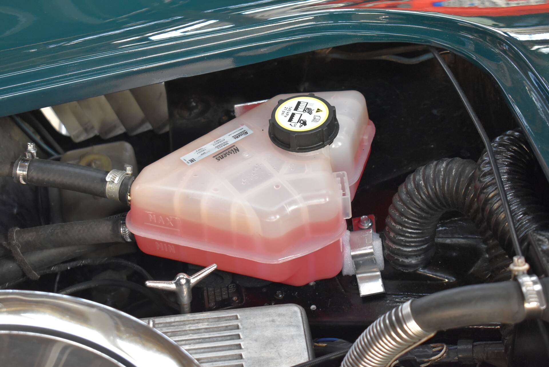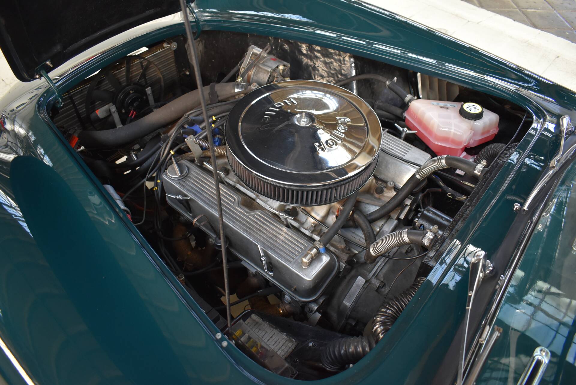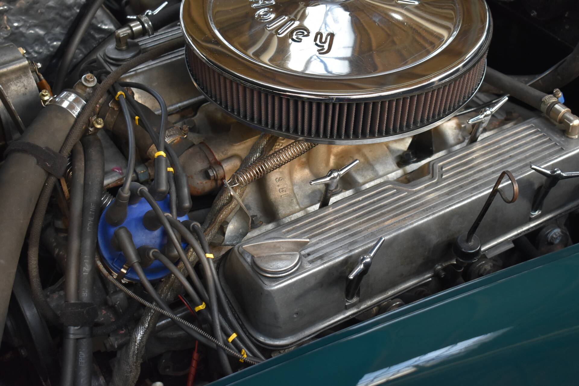 Verbaut ist ein 3,5 ltr. Rover V8 mit knapp 200 PS, einem Holley 4-Barrel Vergaser und Luftfilter sowie einem 5 Gang Schaltgetriebe.