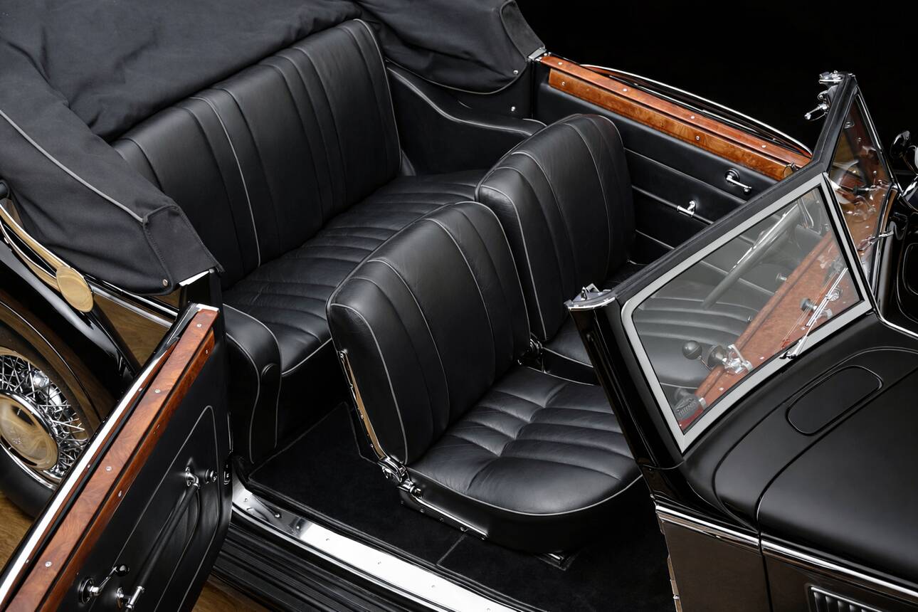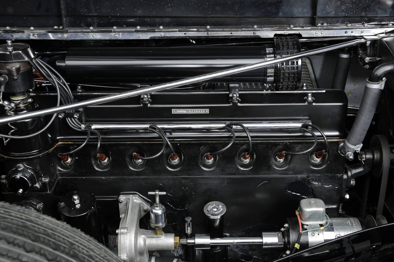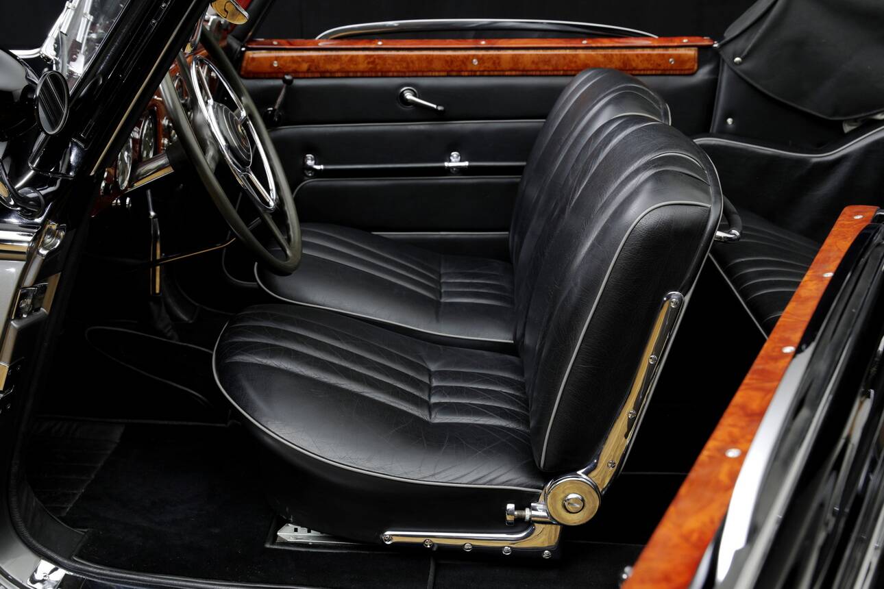 The body was fitted with a new wooden frame as a structural element, and the panels were carefully repaired. This work was carried out by Malmquist in Sweden. As a result, this particular car is distinguished, both then and now, by the excellent fit of the bodywork and chrome trim. Moreover, the engine was overhauled and repaired by Gebrüder Heise Motoreninstandsetzung in Northern Germany. The car was given an extremely attractive and period-appropriate two-tone paint finish in black and silver-grey metallic, with a black leather interior and a black soft top.