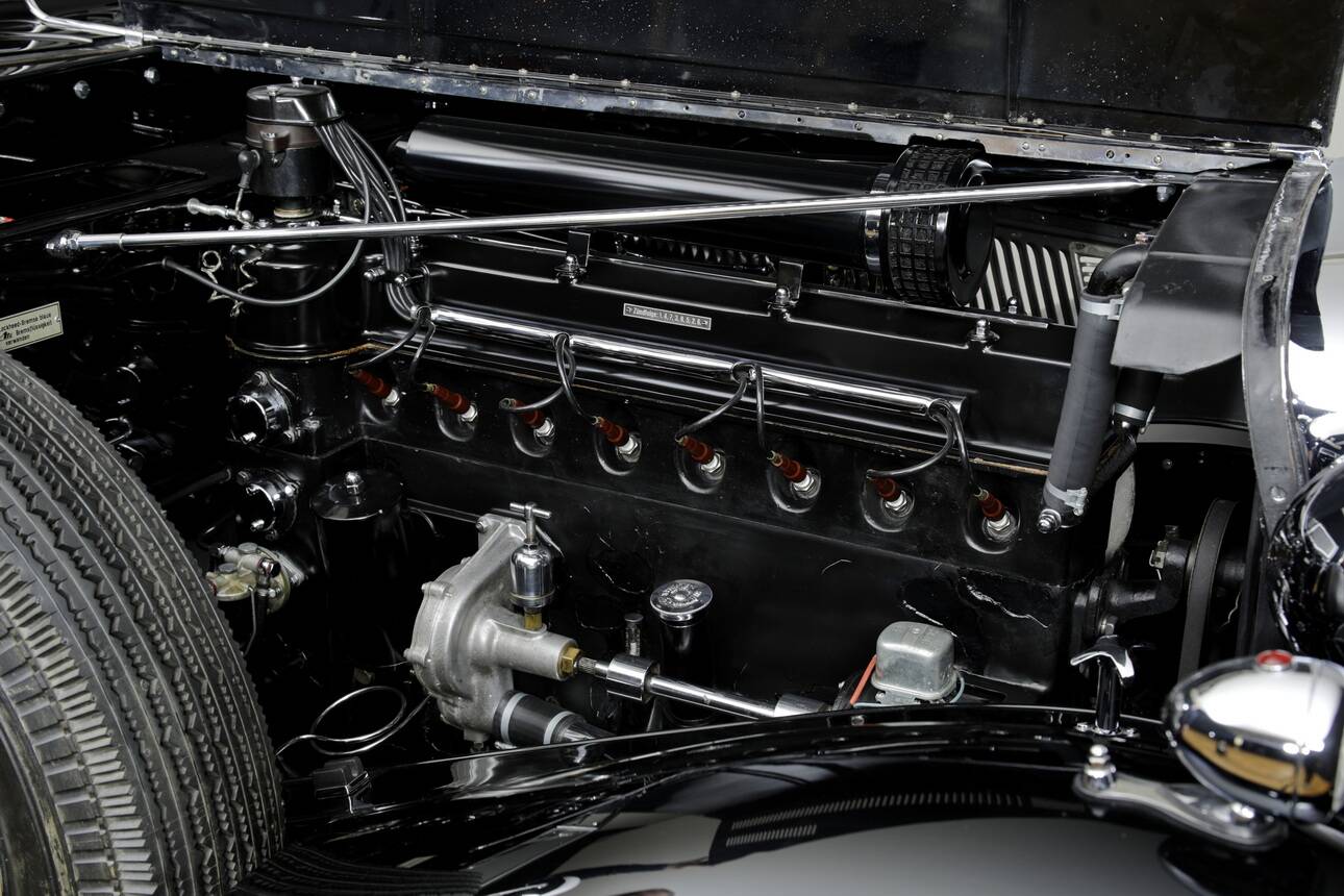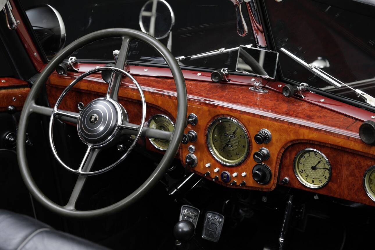 Compared to the two subsequent 853 versions, this first-series example features several very attractive details: the noticeably longer bonnet with a more elegant side-line; the low, fold-out windscreen assembly; the lower roofline (on the 853 A, the soft top resembles a balloon); the beautiful gold-coloured instruments instead of black fittings, as well as the brass-chrome trim, which from mid-1937 onwards was made entirely of aluminium.