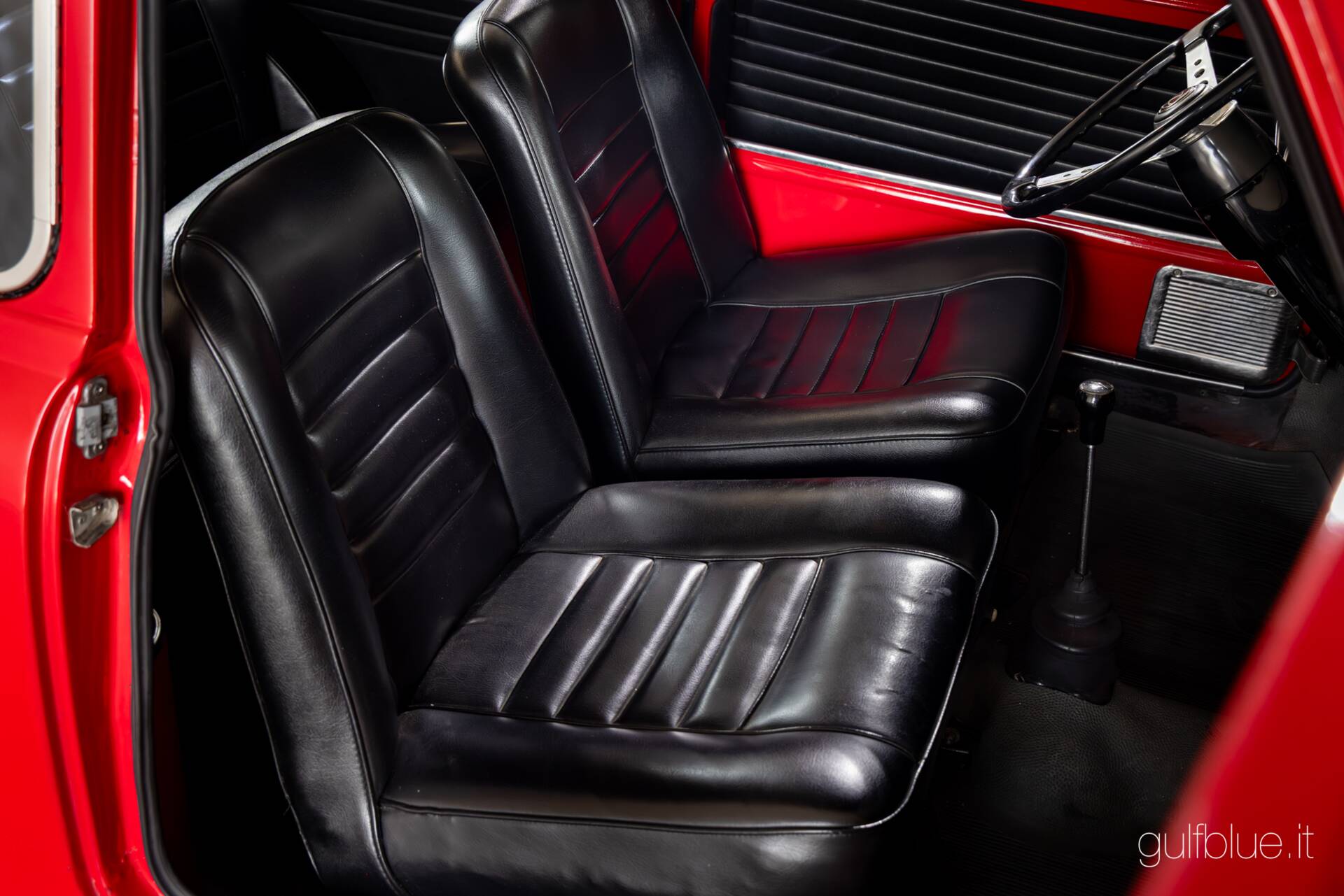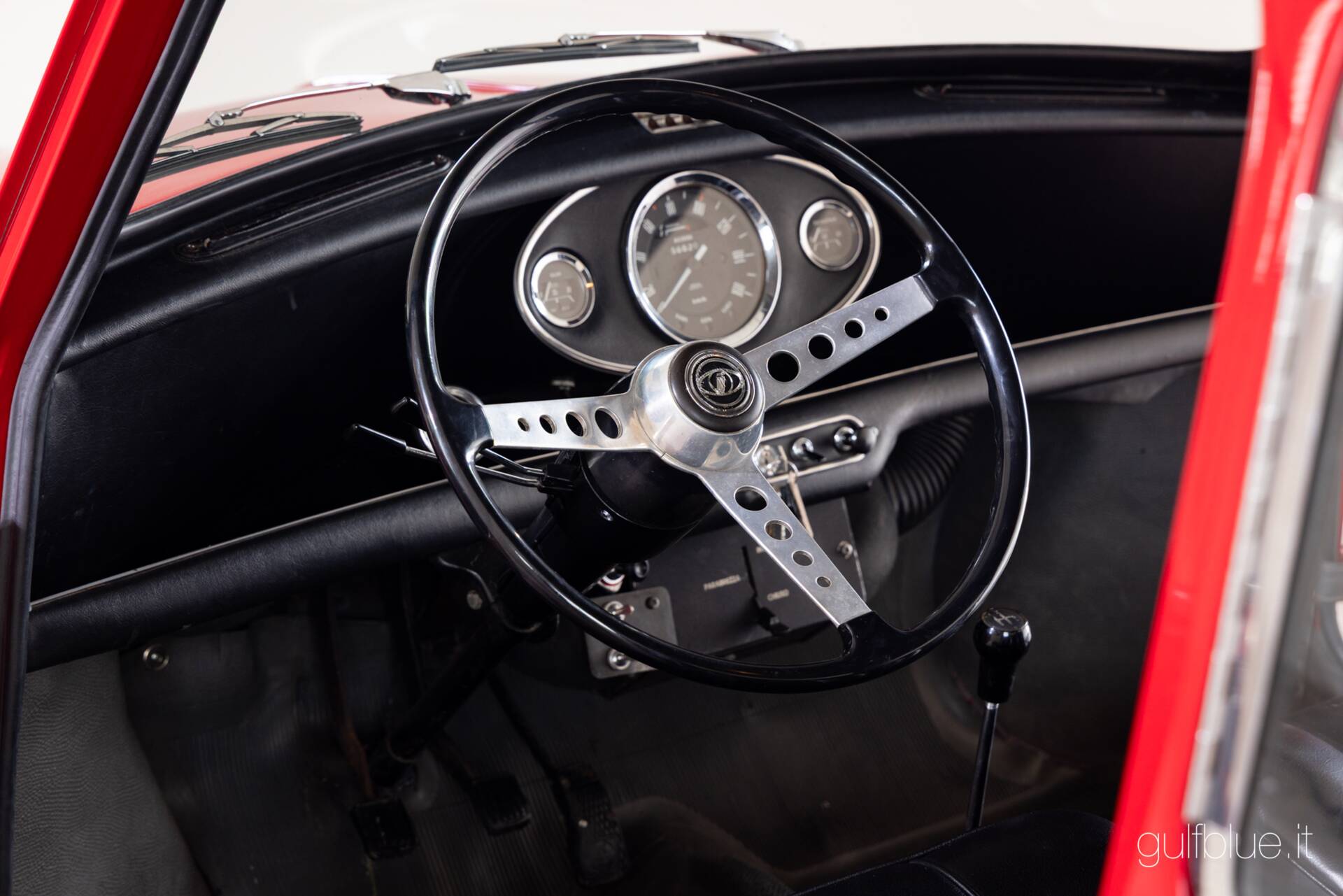 After the first 20 years of use, this Mini Cooper was deregistered and kept in the same family's garage until 2005, when it was returned to the road, used by a mechanic from Bologna who oversaw its restoration, and then by two "regularity races" enthusiasts, still in Bologna, who have kept it to this day, enhancing it with the accessories that were a must-have for red Mini Coopers of the mid-1960s: starting with the essential set of four auxiliary headlights, four beautiful Melber alloy wheels, and rear stone guards. Inside, the rare original steering wheel with perforated metal spokes adds just enough sportiness to make it feel like you don't need much else, except a tachometer for more precision in sports driving.