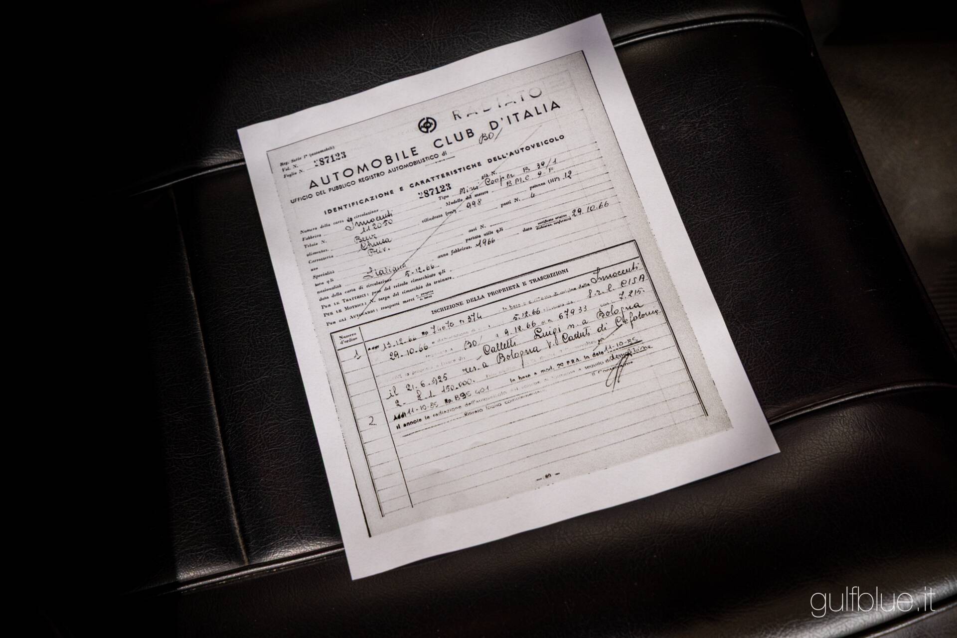 Produced at the Lambrate plant in Milan in October 1966, this Innocenti Mini Cooper was sold new in Bologna by the Cisa dealership to Mr. Luigi Calletti, who kept it in the family until 2009. After a couple of owners, the car passed into the hands of a passionate collector who refinished it in its current sporty configuration.