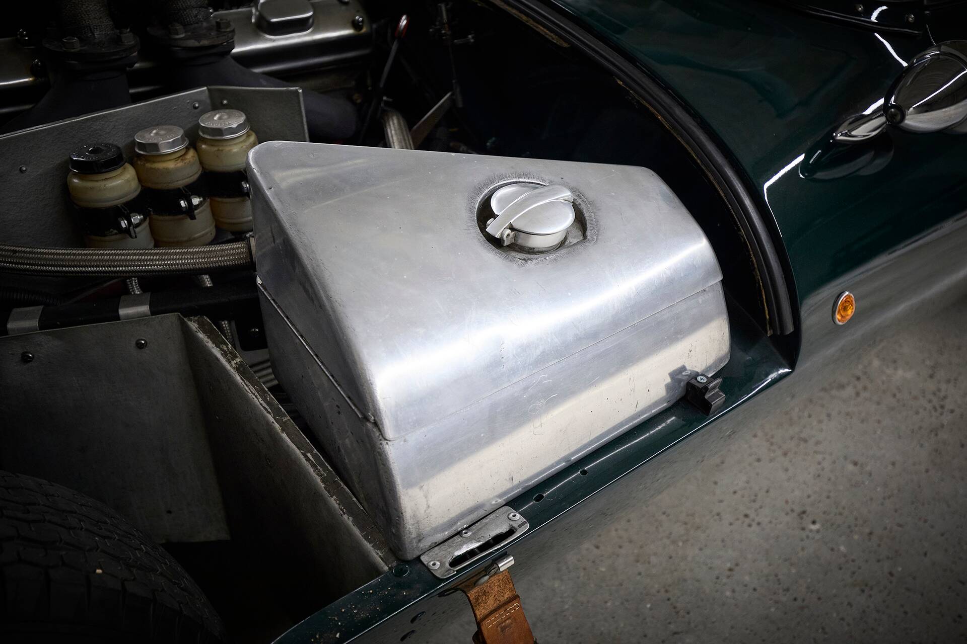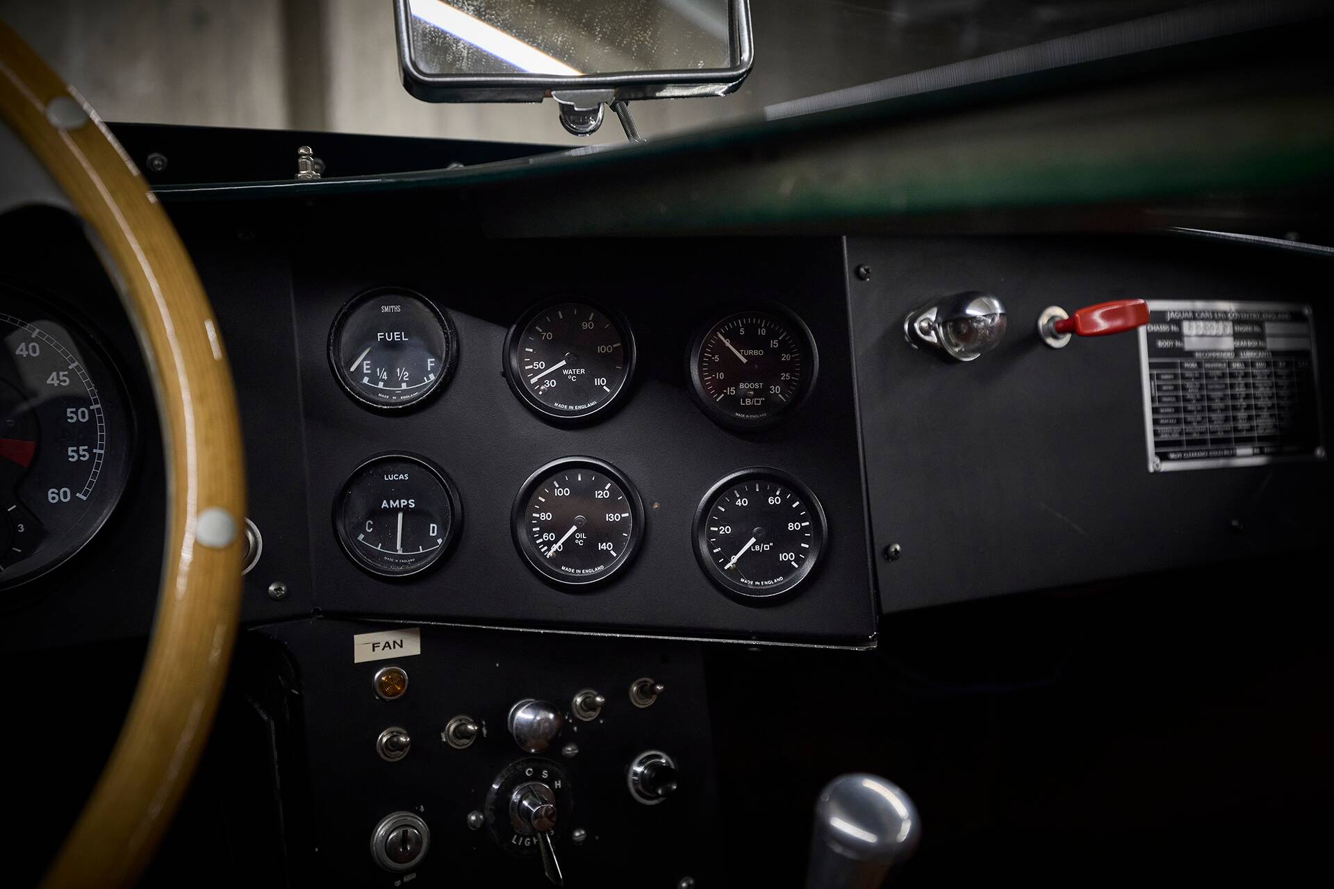 From its earliest days, the car was designed to capture the spirit of Jaguar’s legendary Le Mans racers. Harwood refined the vehicle further with characteristic D‑Type hallmarks: the distinctive fin, removed windscreen and bumpers, and a race-oriented body configuration. The monocoque tub was carefully modified, while period‑correct suspension, running gear and original E‑Type interior elements were retained to preserve authenticity. The engine—a short‑stroke Jaguar XK unit enlarged from 2.4 to 3.0 litres and turbocharged—was assembled with performance components including a high‑pressure oil pump and bespoke Piper camshafts, lending the car a uniquely spirited and mechanical character.