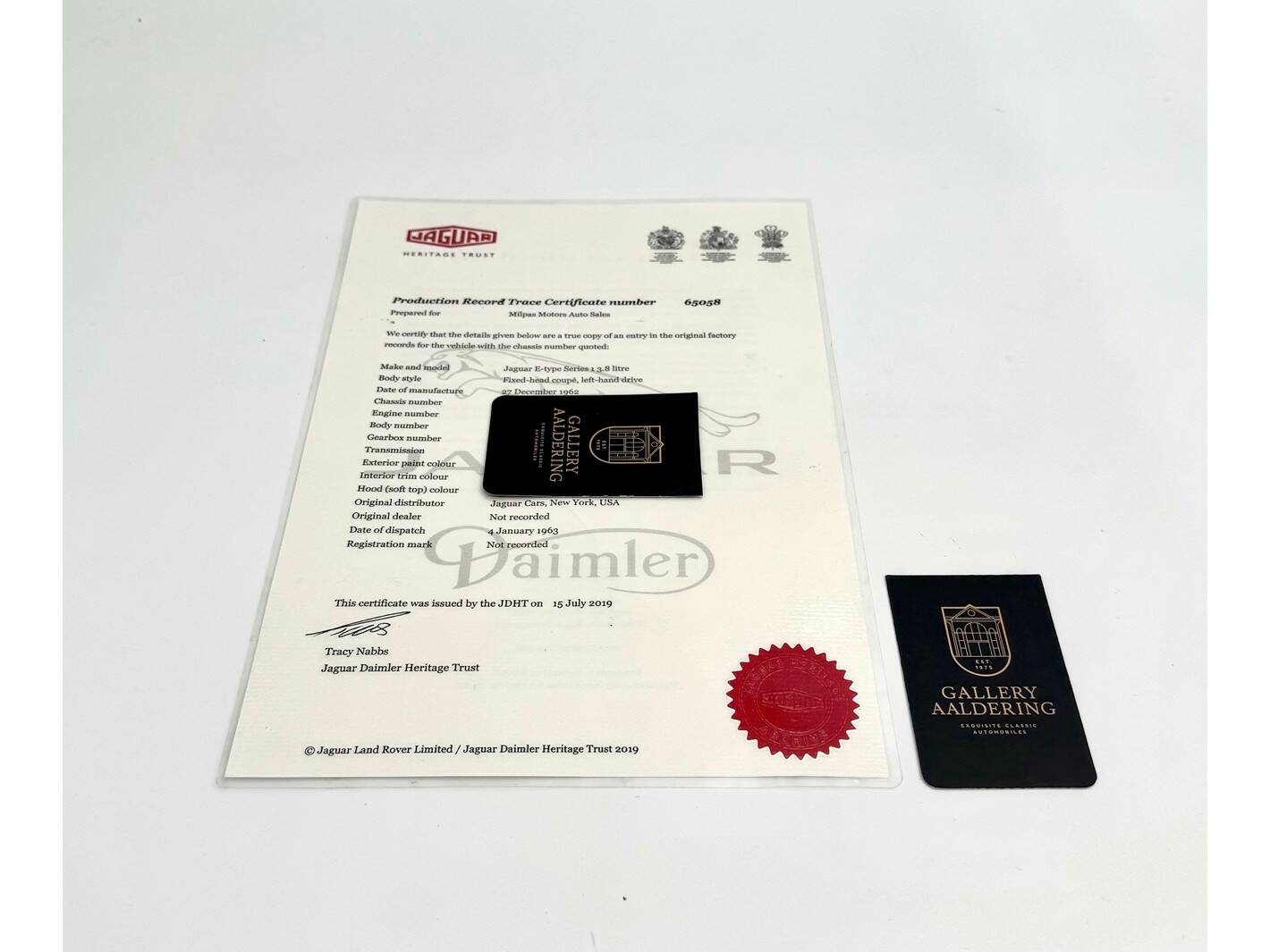 Jaguar E-Type 3.8 Litre Series 1 Coupe "Matching numbers and restored" The "nut and bolt restoration" has been modestly documented in photographs, Restored and rebuilt in the mid-1990s, Offered with the Heritage certificate and the board map with booklets, Carmen Red over black leather interior, From a California car museum where it was displayed as "a showpiece", Manufactured in 1962 - Registered in 1963,