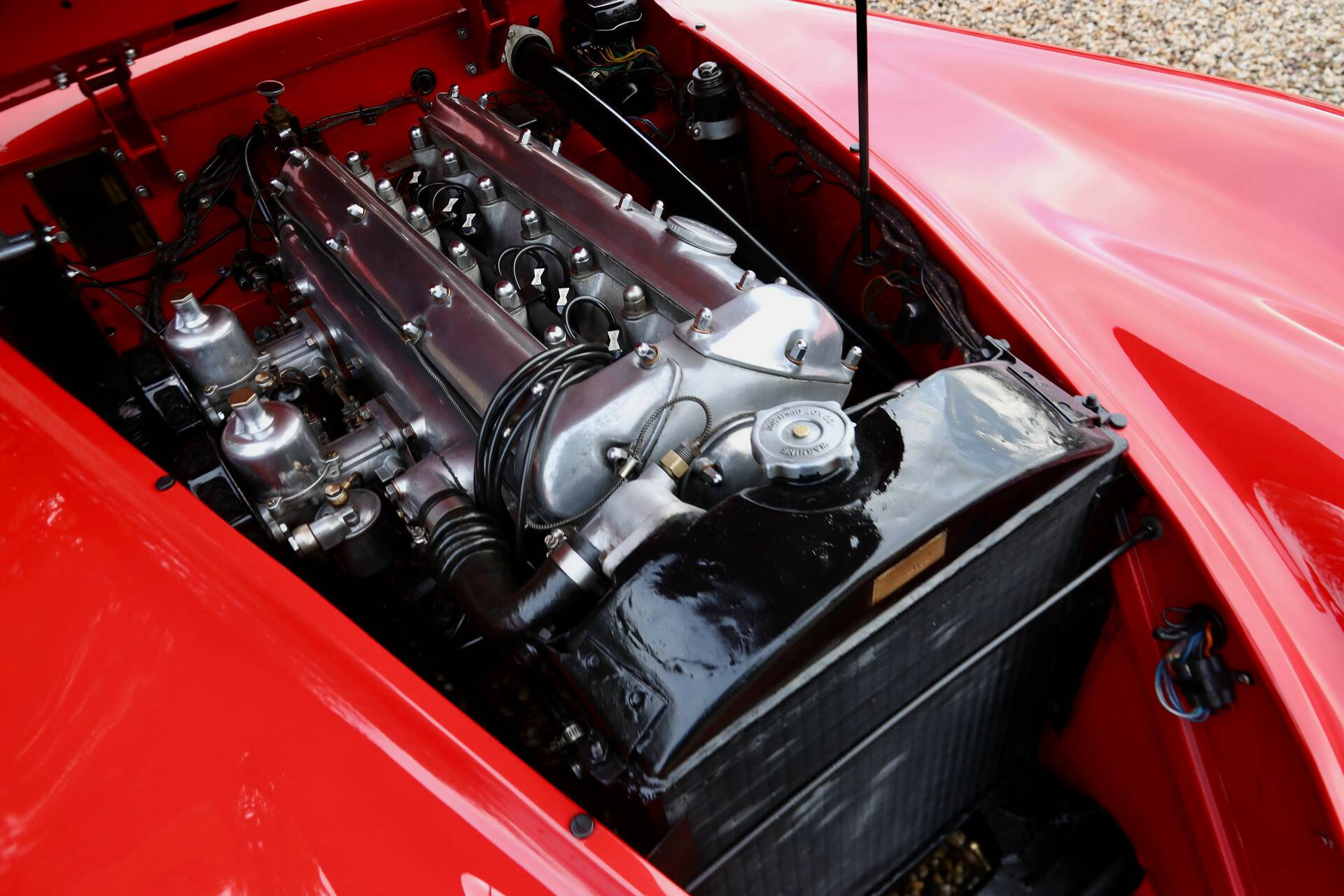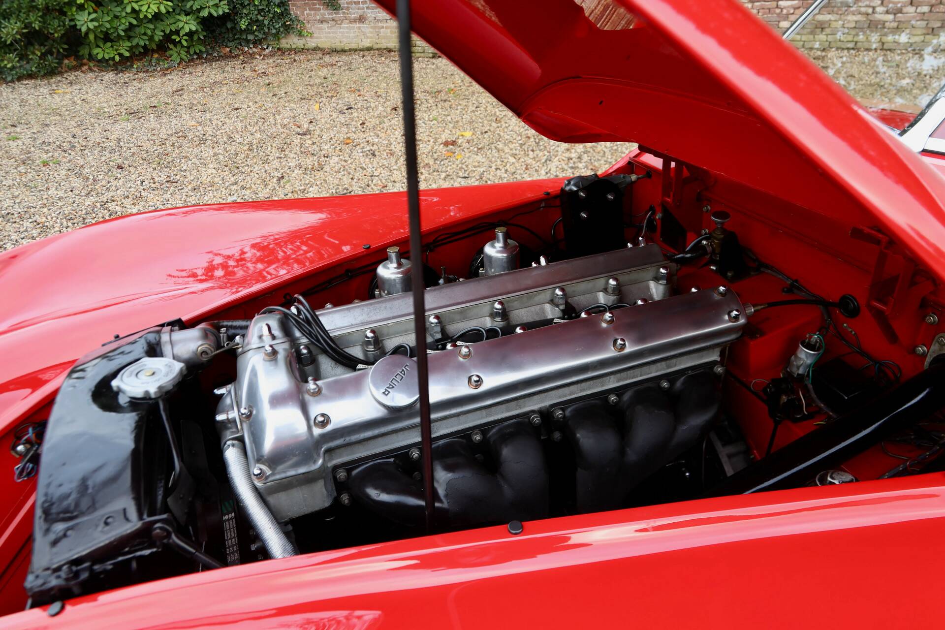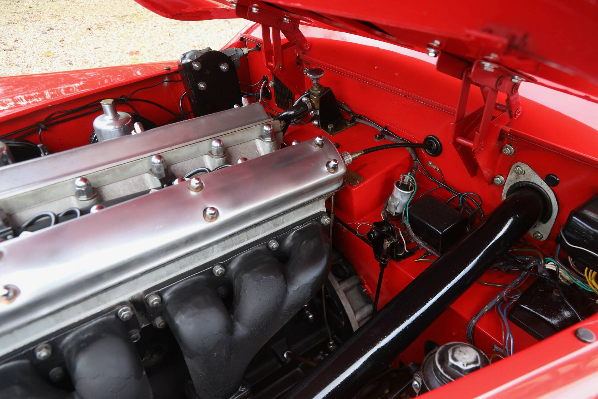 Let us start underneath with our description. The chassis is of course completely rust-free and looks good. The bodywork has been very well looked after with only slight signs of use. The correctly aligned panelwork is nice and thin. The recently replaced and well-fitting hood is easy to operate. The hood frame is also up to standard. The red finish was expertly reapplied and still presents neatly with only a few blemishes detected. The chrome wire wheels, bumpers and other brightwork all look very presentable.