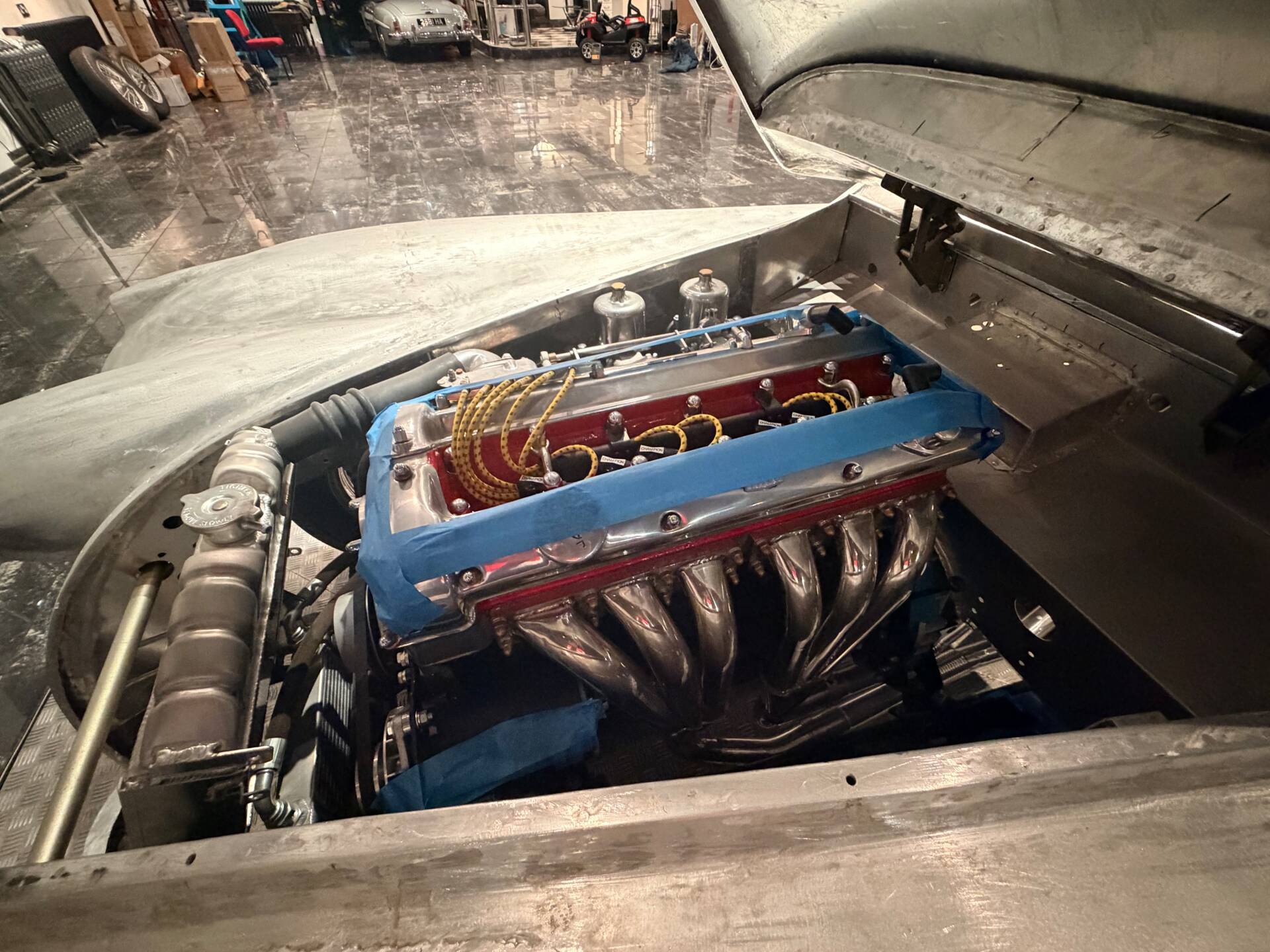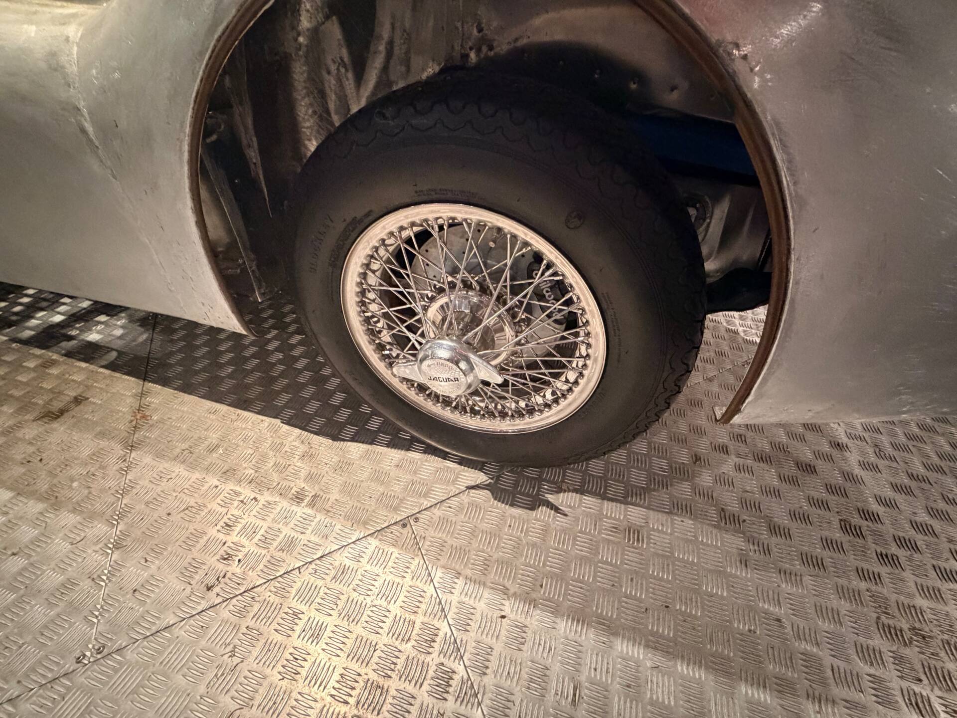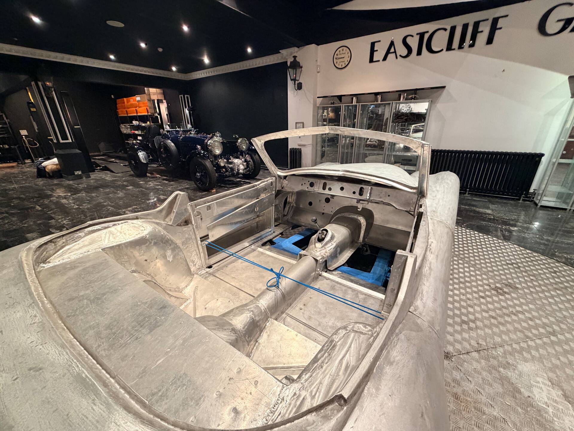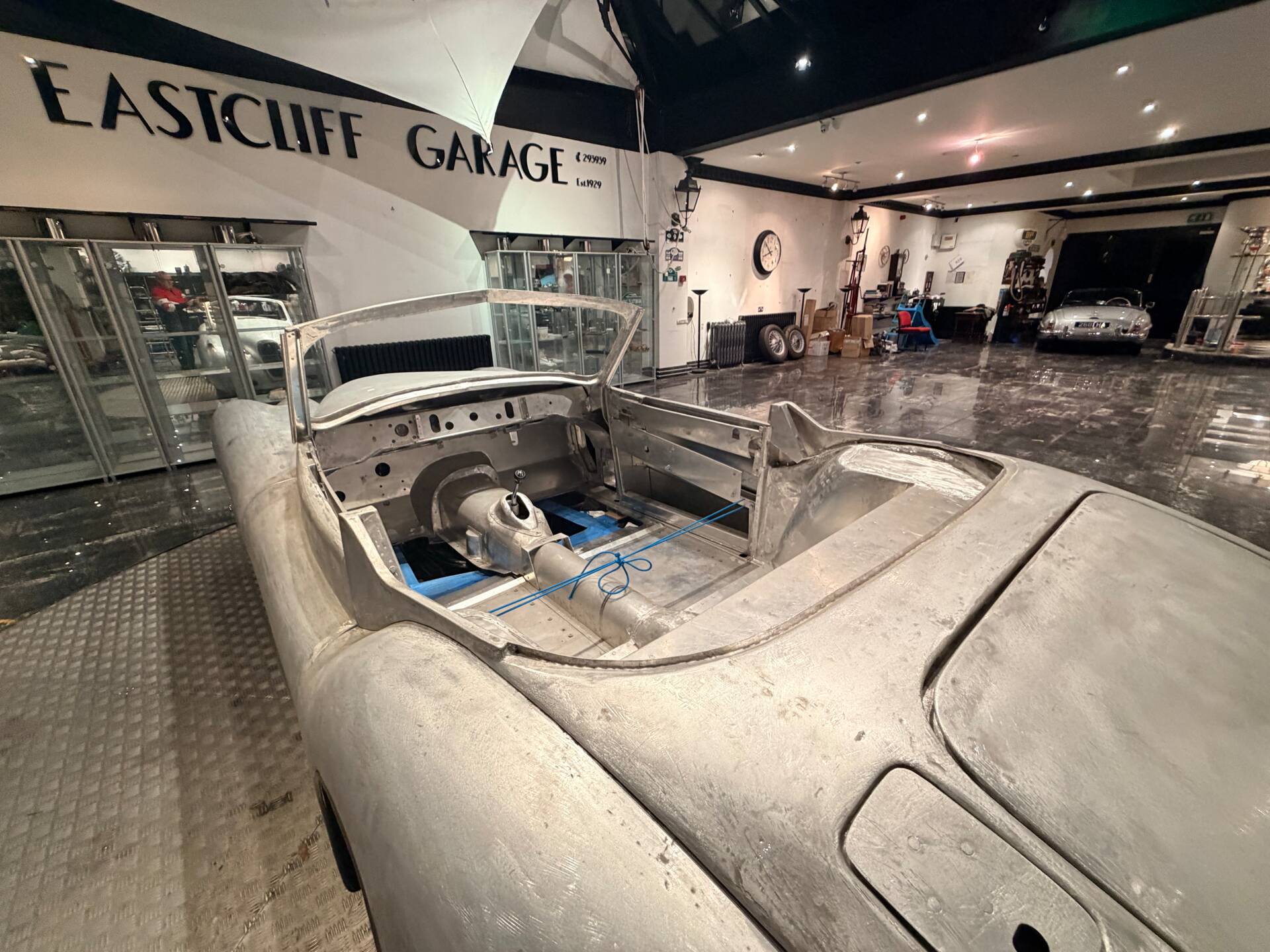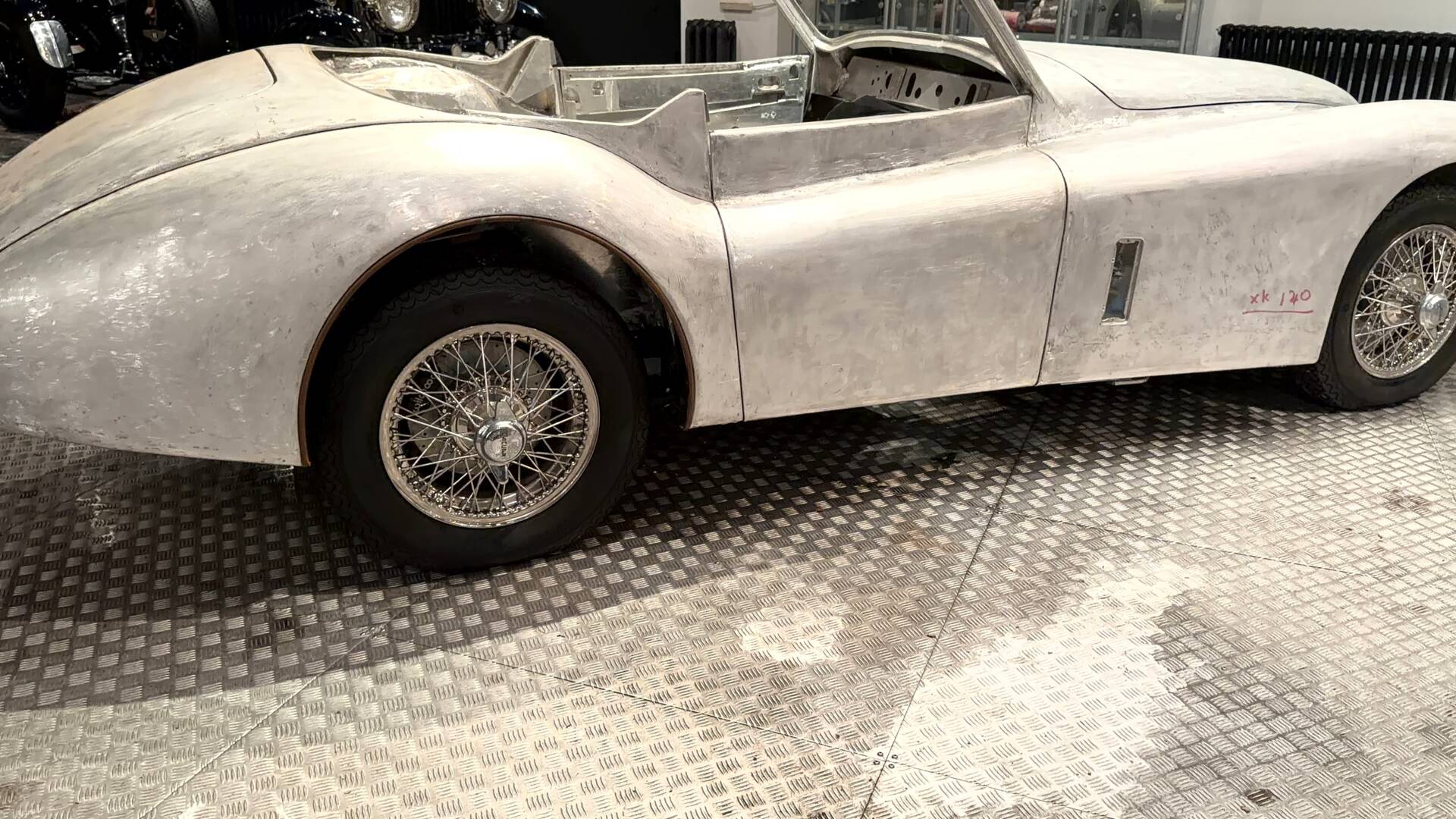 This XK is presented as a rolling chassis with an unpainted body. The engine and gearbox in place and are all restored. The car comes with polished spoked chrome wheels and boxes of various parts, ready to be fitted.