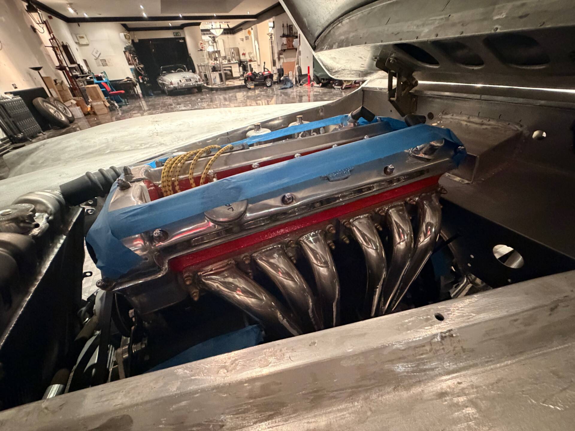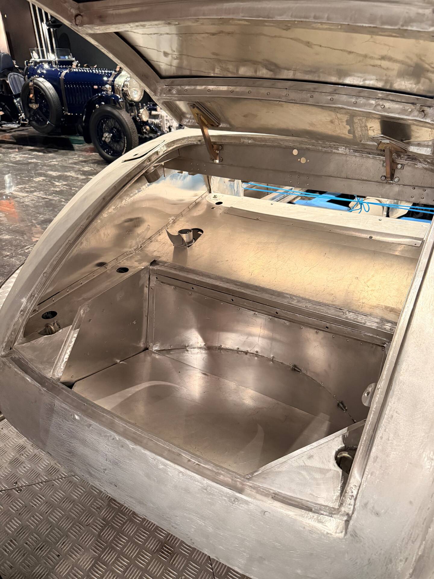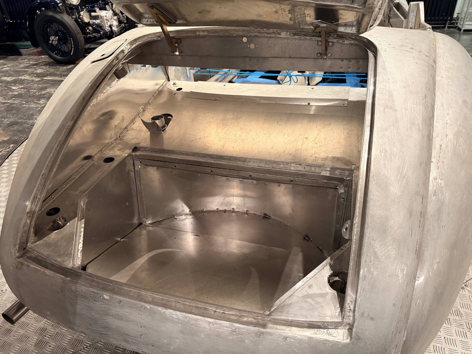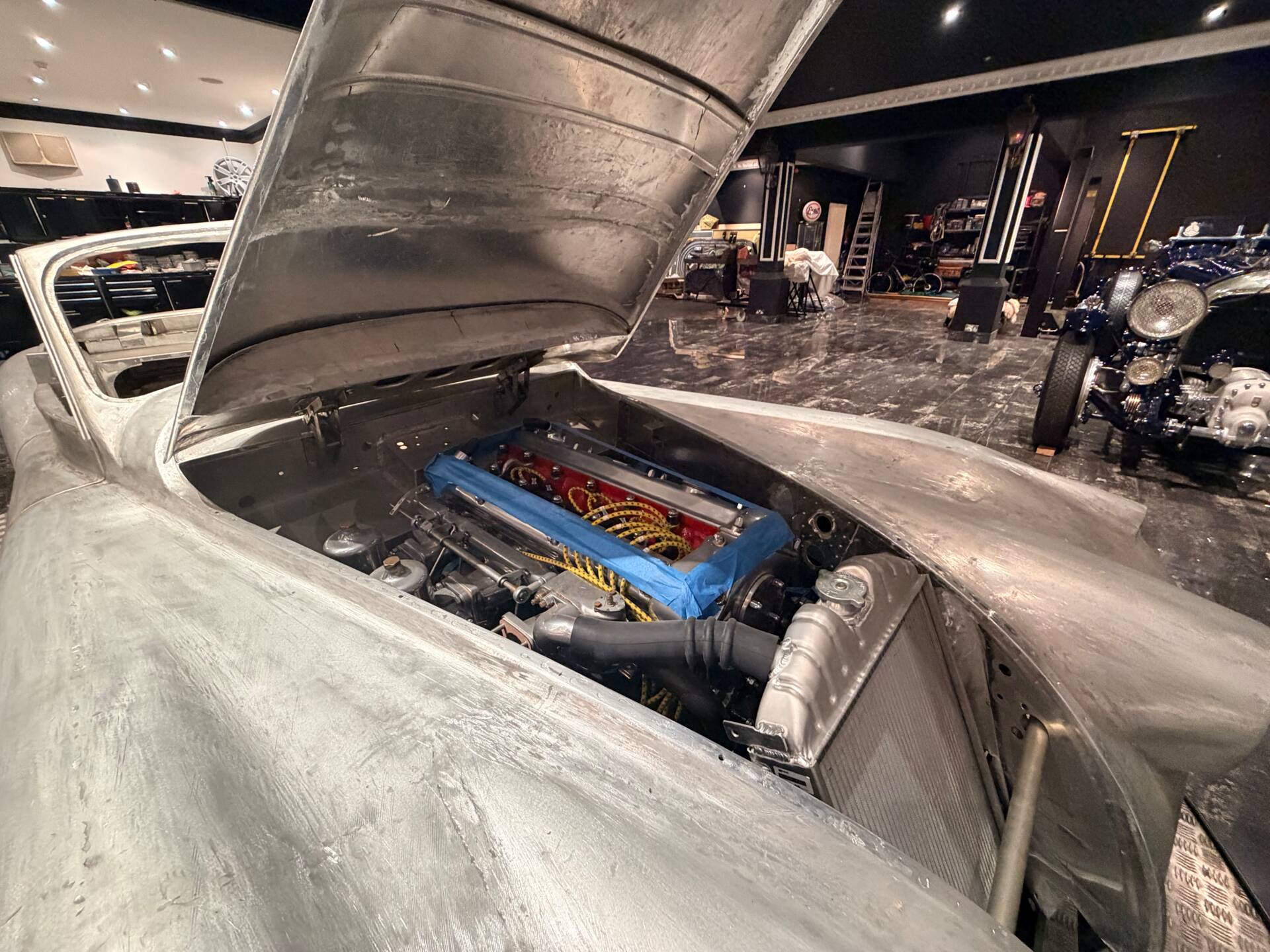 This XK is presented as a rolling chassis with an unpainted body. The engine and gearbox in place and are all restored. The car comes with polished spoked chrome wheels and boxes of various parts, ready to be fitted.