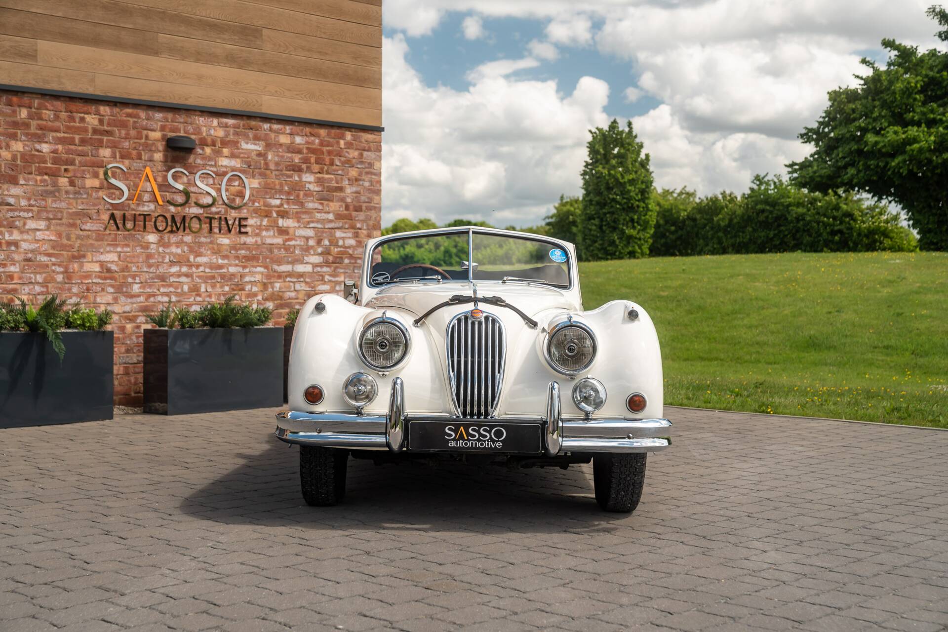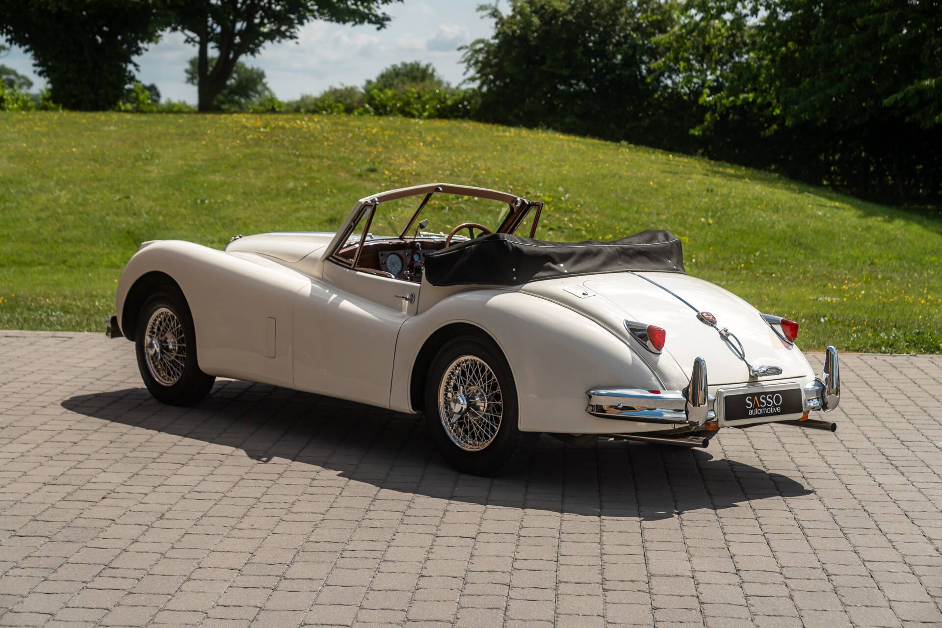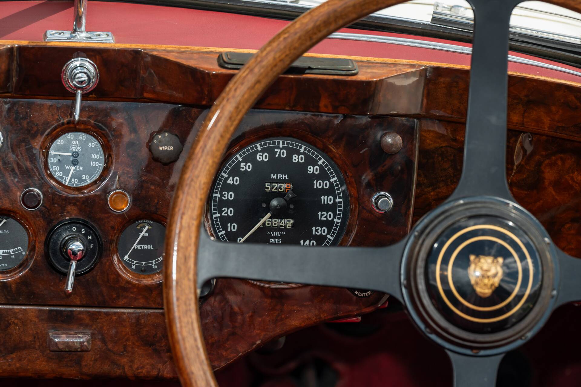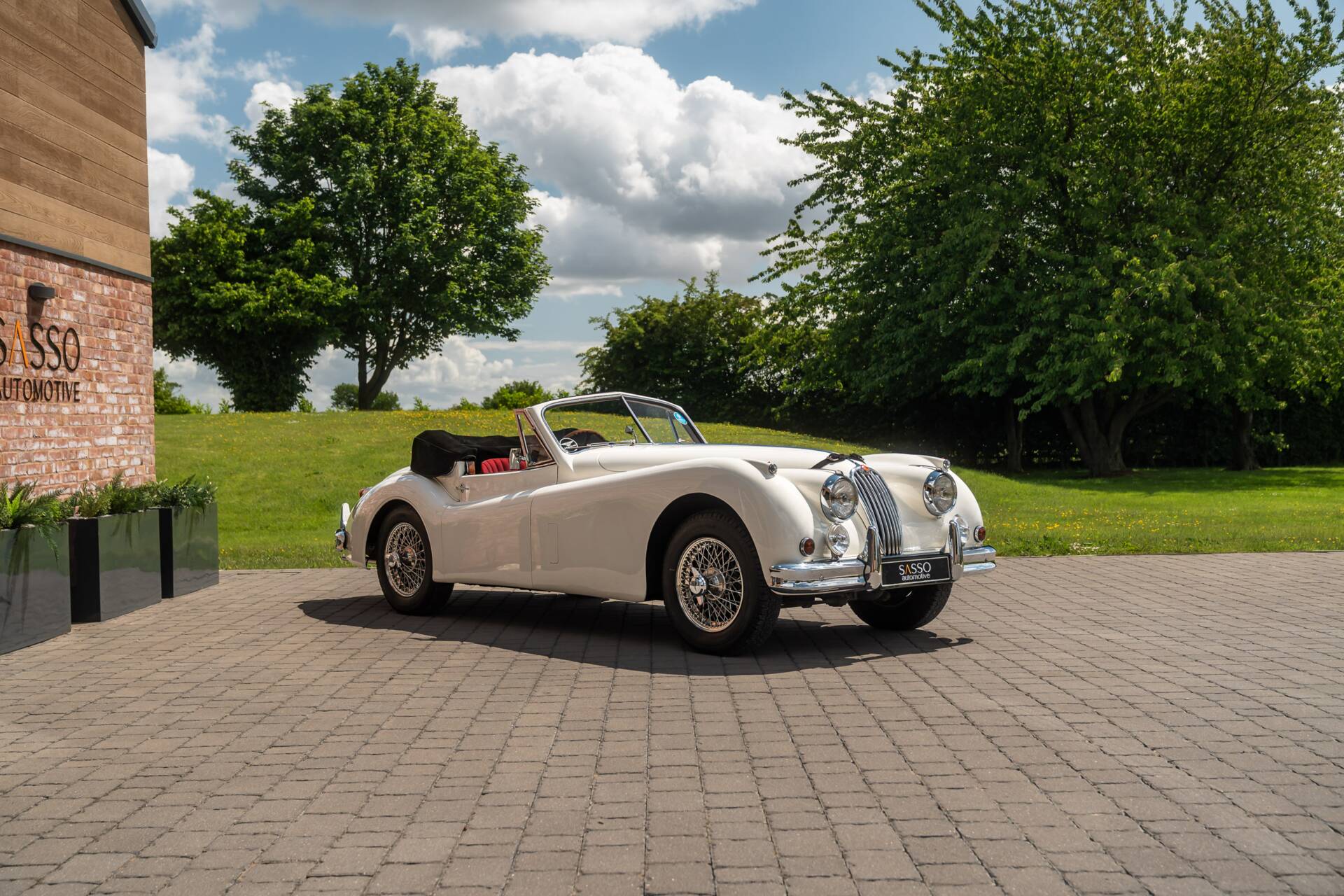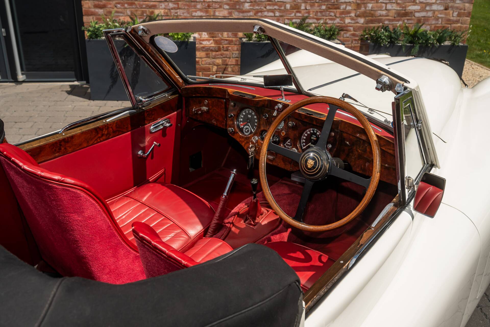 According to its accompanying Jaguar Daimler Heritage Trust Certificate, this particular example - chassis S817502 - was factory finished in Cream with Red leather upholstery and a Black hood. A Special Equipment model, its original specification also comprised a C-Type cylinder head, twin exhaust system, wire wheels with centre-lock fixing and twin fog lamps. Dispatched to Max Hoffman's famous New York dealership on 18th June 1955, the Jaguar is known to have belonged to Florence Caruso, Richard Reitter and Herbert Simms amongst others whilst Stateside. Repatriated as a stalled project during 1988, the K140 was first UK registered as 'TSK 491' on May 1st 1992 to Anthony Jackson of Henley-in-Arden by which time it had been extensively restored including a conversion from left- to right-hand drive. Briefly belonging to Stephen Murphy of Wolverton, the Drophead Coupe was acquired by its previous keeper William Brown of Colton on October 13th 1994 for £34,500.