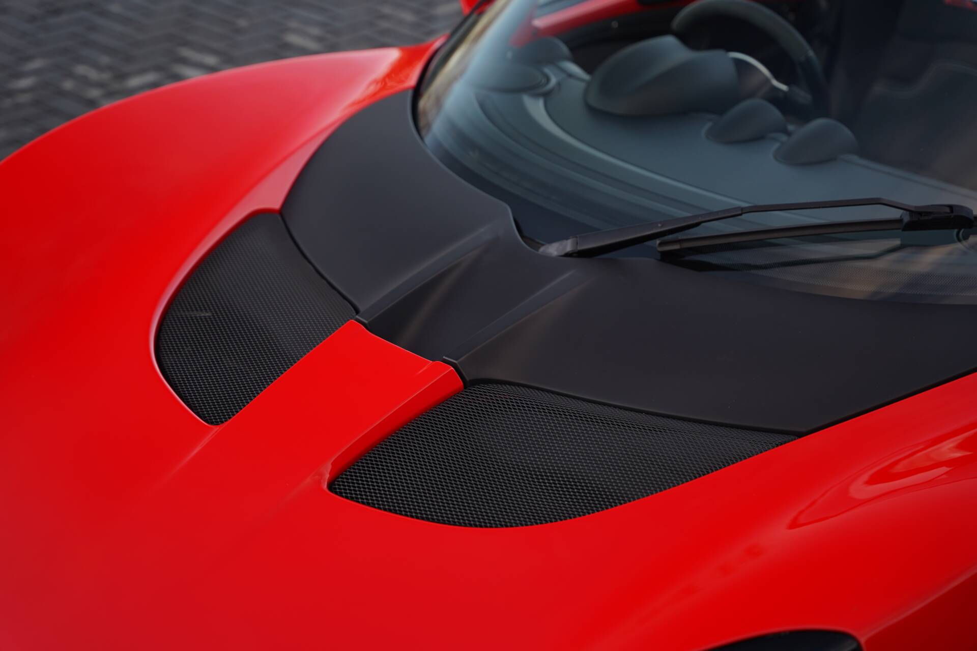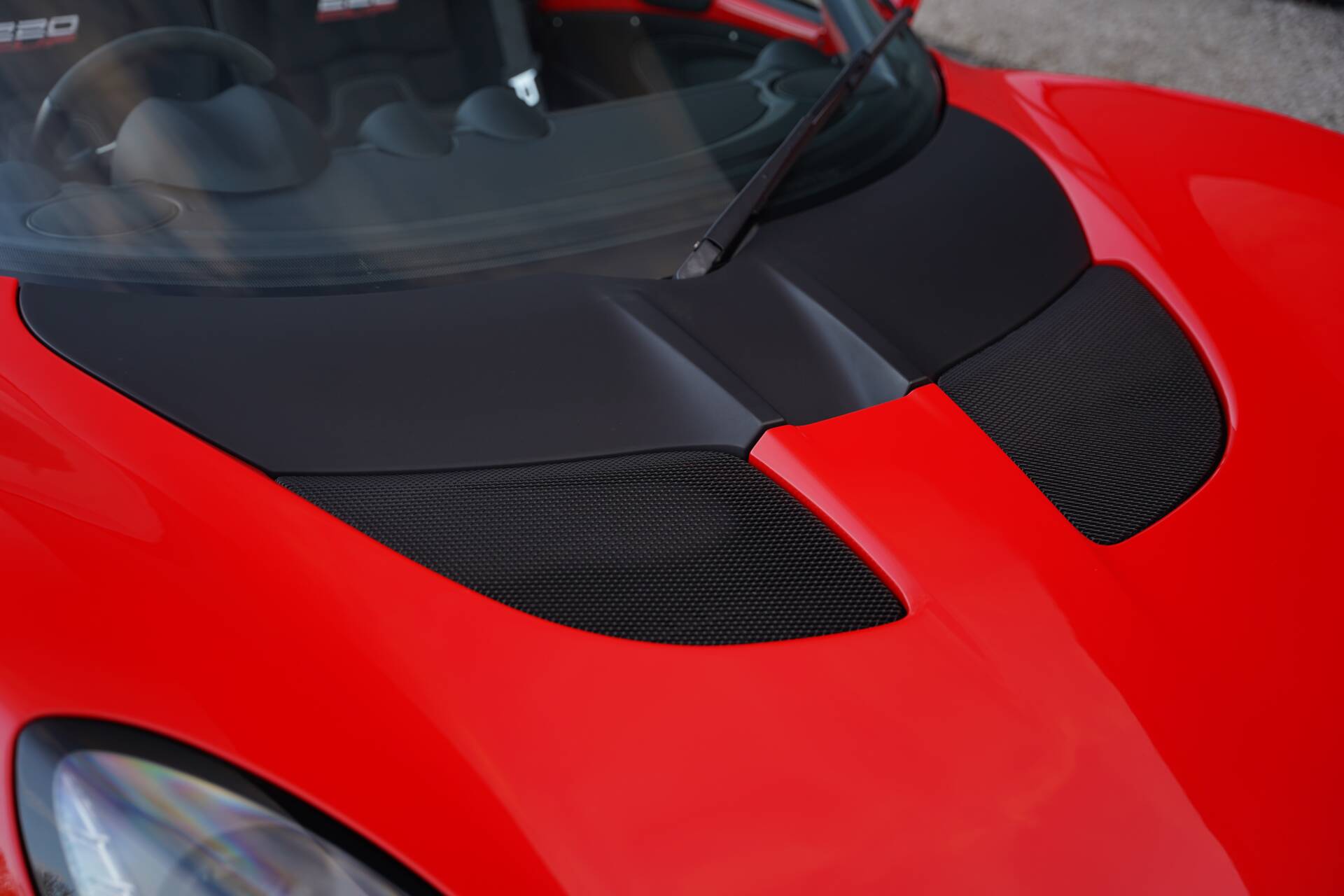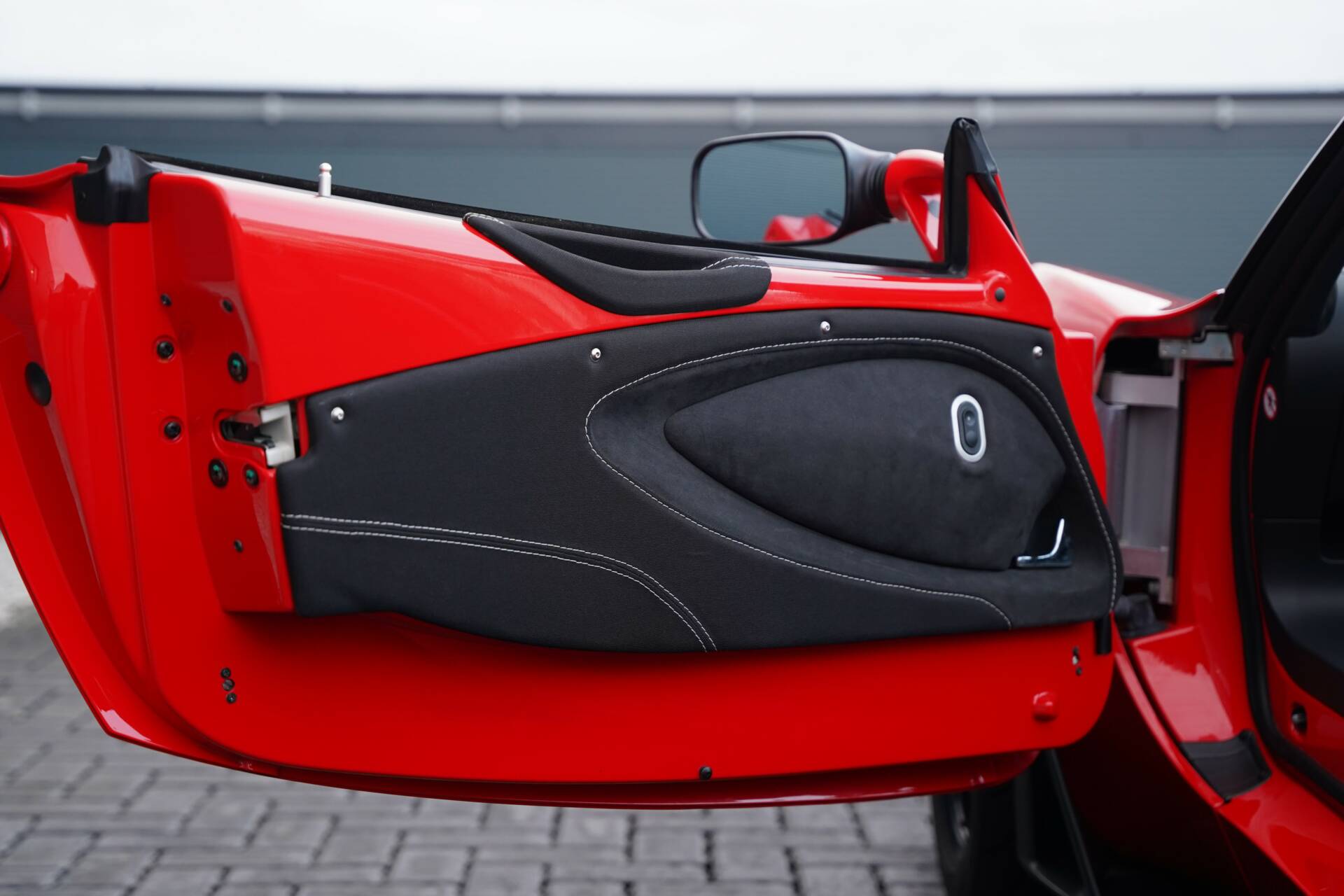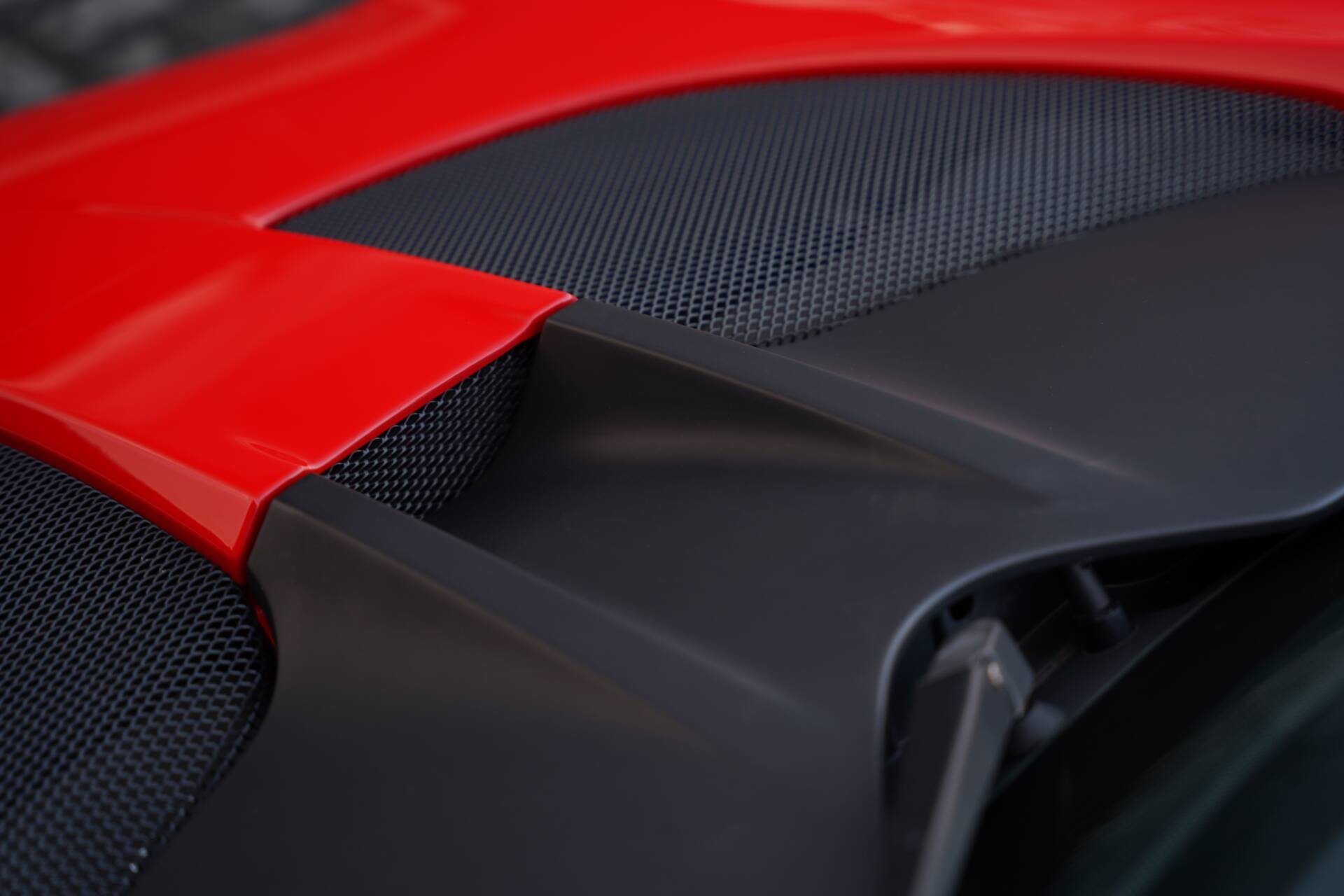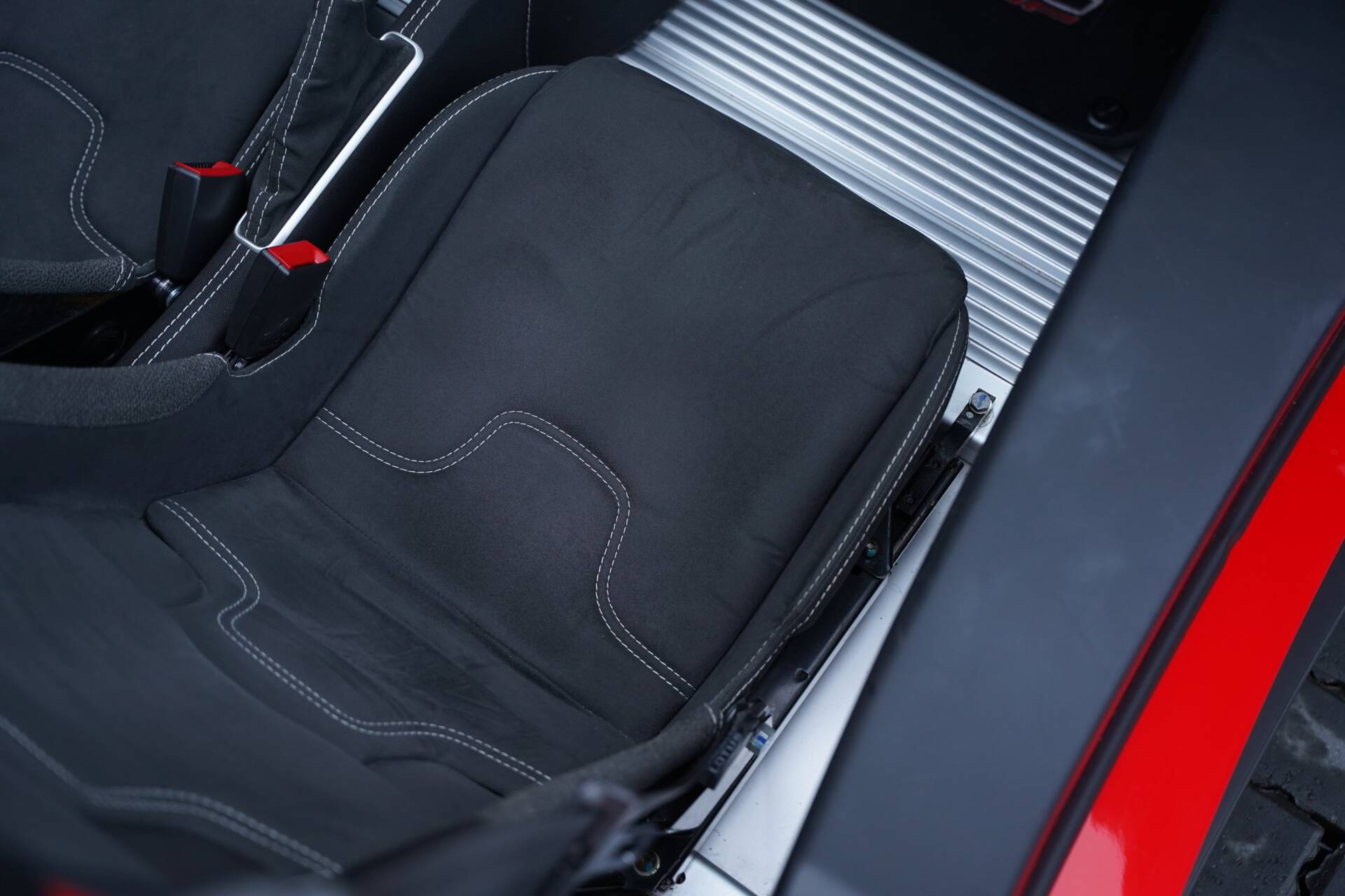 Finished in the very fitting C168 Formula Red, with a contrasting exterior Black Pack comprising of front inspection panel, hard-top roof, roll over hoop, engine cover, rear spoiler and the rear transom. The Black Pack also extends to the ‘Big Aero Kit’ with front splitter, barge boards, side skirts and prominent rear diffuser. The lightweight forged wheels are finished in Satin Black, and house the subtle black brake calipers. The spoiler features Union Jack decals to the end plates. The car is also supplied with a soft-top canvas roof for easy roof off motoring at a moment’s notice. Finally, a partial PPF covering is fitted to the front clam and headlights, as well as in front of the rear wheels on the lower sill panels, ensuring continued protection of the car for miles to come.
