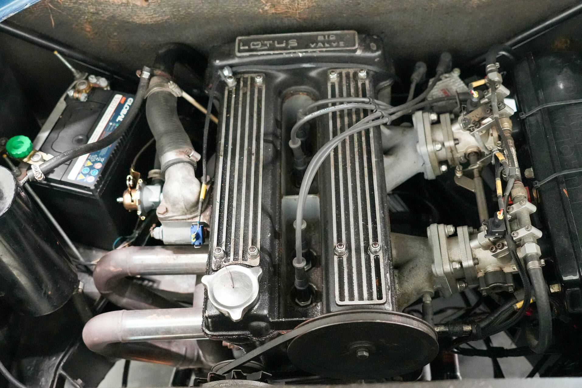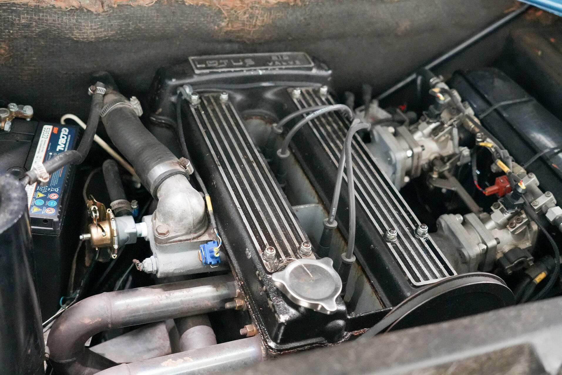 This Lotus presented here is a Twin Cam model, meaning it had dual overhead camshafts. This is the most powerful engine ever delivered in the Europa. It features a KMS injection system instead of the twin Dell Orto carburetors. This makes the engine run smoother and start better. We also see black rims and leather upholstery. A very nice and good Europa for the enthusiast.