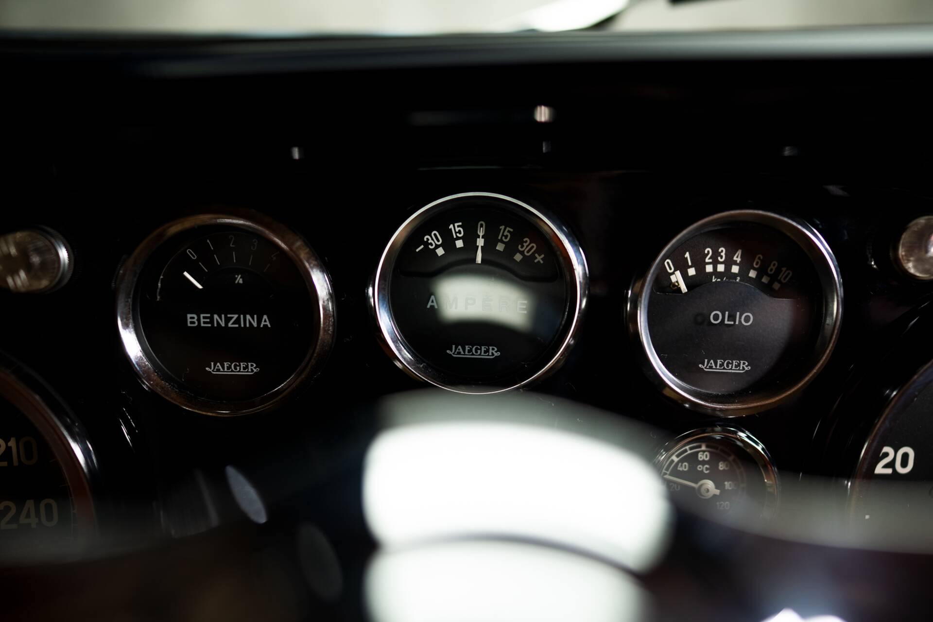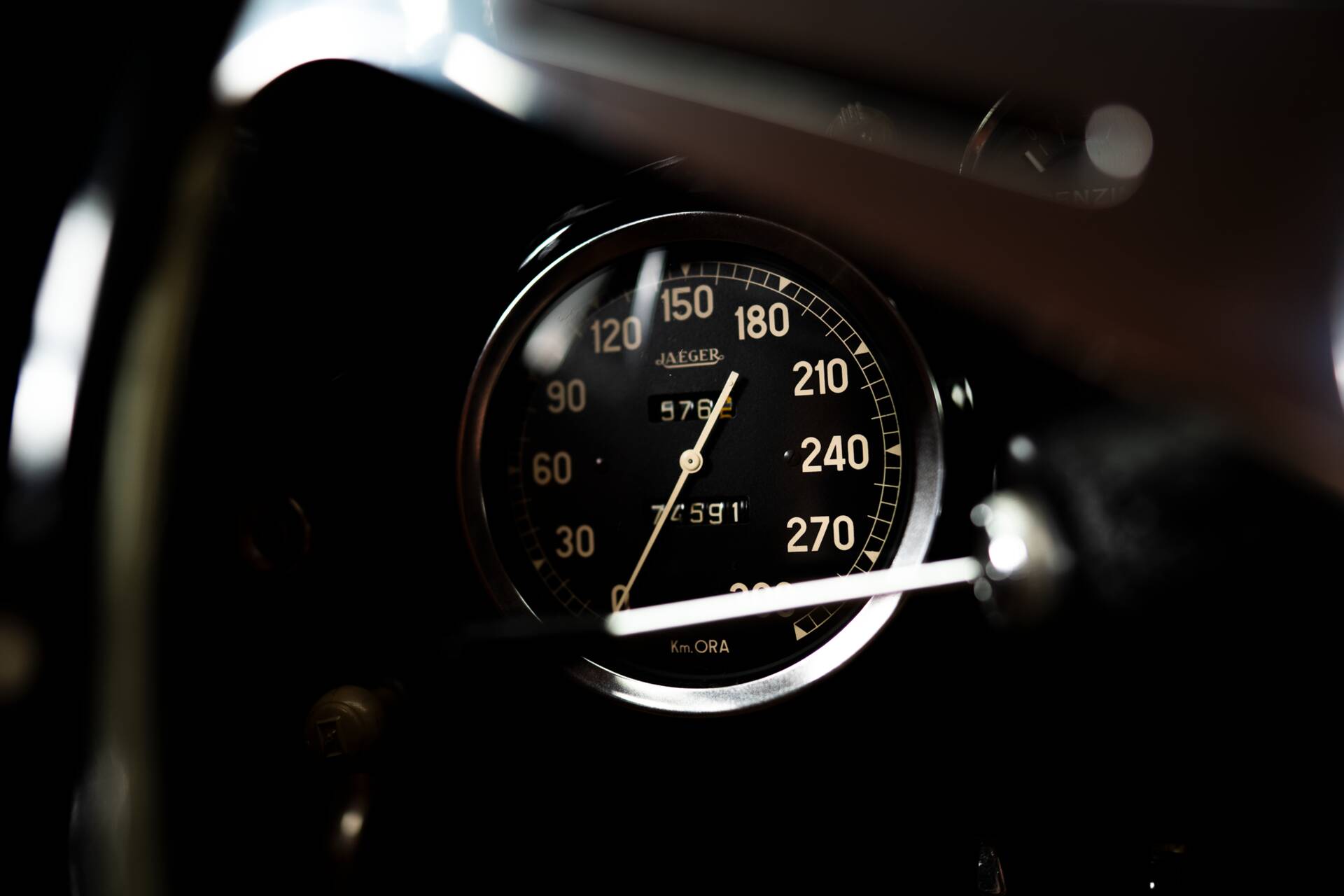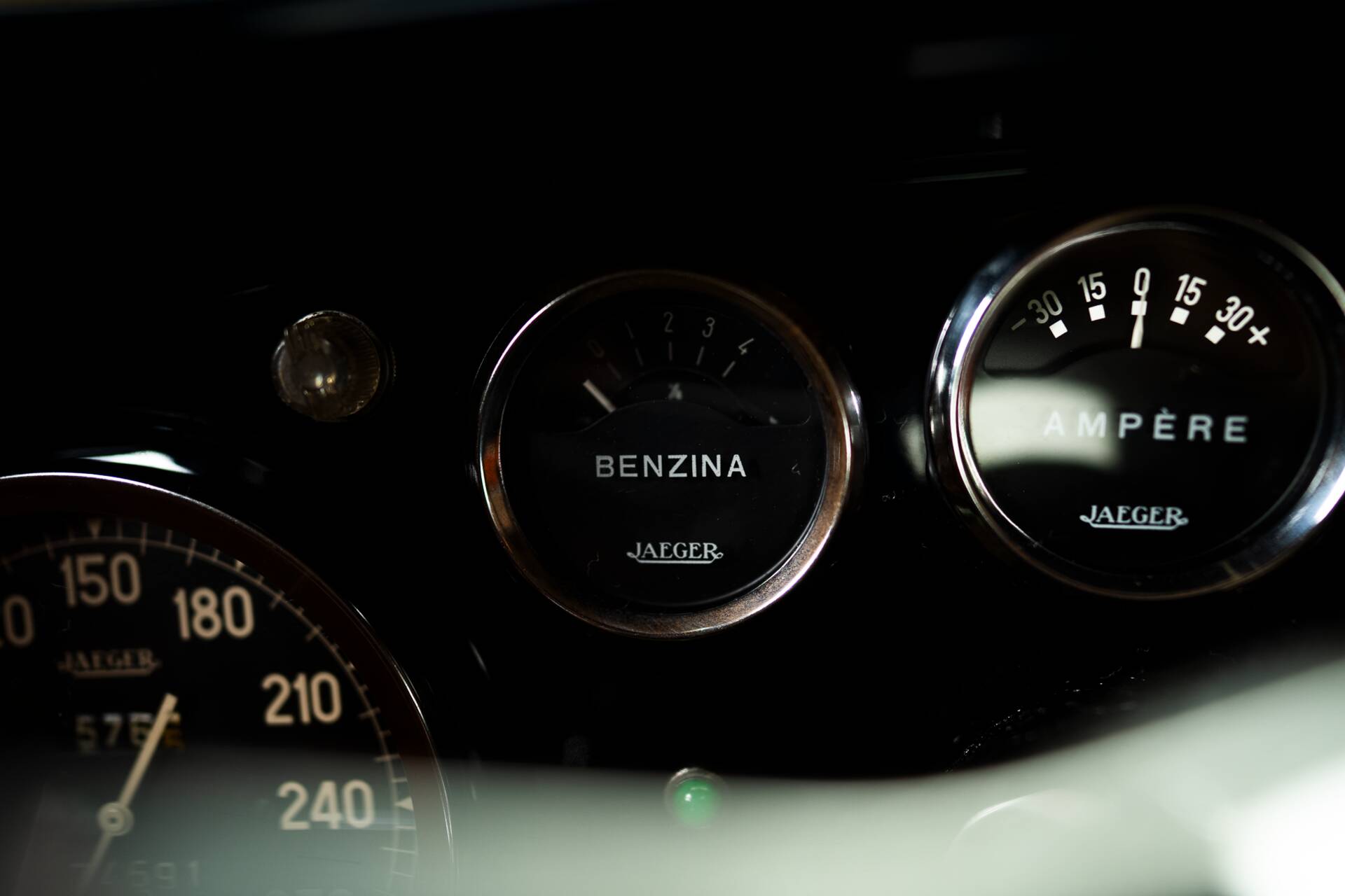 Being one of the very first 3500 GTs ever built, it has many features that indicate a prototype/early series hand-built model. For example, the body is approximately 2 cm narrower, the Borrani wheels (RW3421) are unique, resulting in a slightly narrower track, and it also has a slightly shorter wheelbase. The wonderful instruments are still from the Maserati A6, supplied by Jaeger in France. The dashboard features 7 instruments: speedometer, tachometer, fuel gauge, ammeter, oil pressure gauge, oil temperature gauge, and water temperature gauge. A contemporary Autovox radio (non-functional) completes the dashboard. The dashboard of this car is still painted in the body color; later models had a leather-covered upper dashboard. Beautiful chrome sun visors with tinted glass protect from glare. The roof lining is upholstered in beige wool. It also has the early chrome heater controls of the pre-production series. The matching-number engine is still made from or derived from components of the 350F racing engines, such as the cylinder head with water inlets and camshafts with steeper lobes and more aggressive timing. Compared to the later production engine, this engine has more power, revs higher, and has a sportier character. The chassis features wider sills and additional reinforcements. During the disassembly of the vehicle, it became clear how creatively the Italian engineers approached its construction, making changes and improvements as they progressed. The craftsmanship involved in building such a prototype at that time required absolute expertise and demonstrates the highest standards of workmanship, functionality, and design.