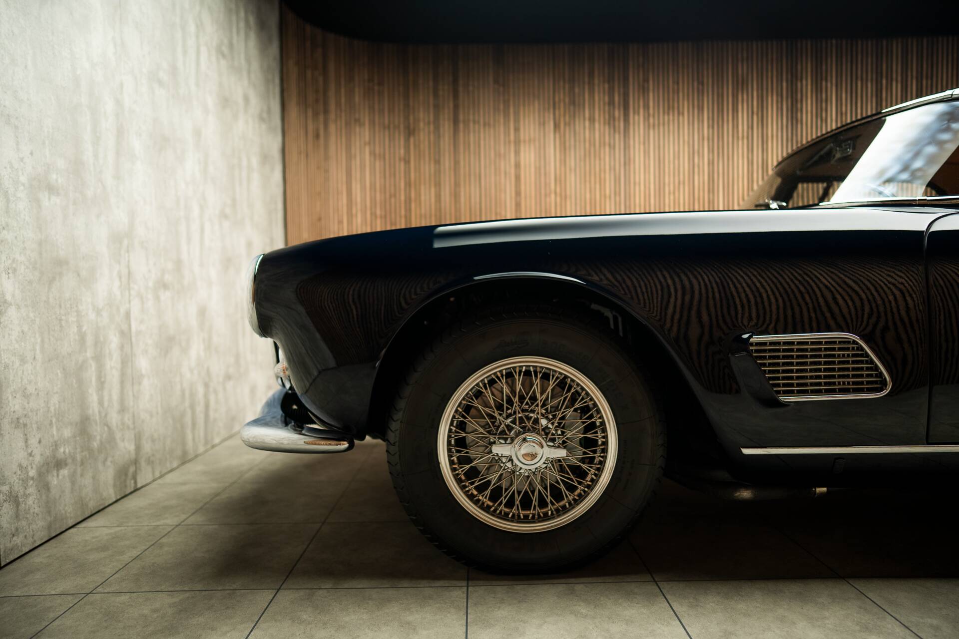 The engine, however, was still based on a racing engine. With this 3.5-liter six-cylinder engine, Stirling Moss competed in the Mille Miglia in 1956 and went on to win the Formula 1 championship in 1957. Two overhead camshafts and dual ignition were therefore considered standard features, as were three double-barrel carburetors. With reduced peak power and revs, and with a timing chain instead of gears, the lightweight aluminum engine still delivered a respectable 220 hp at 5500 rpm. In the competitive landscape of contemporary super sports cars, it positioned itself between the Mercedes-Benz 300 SL (215 hp) and the Ferrari 250 GT (240 hp). With a displacement of 3,485 cubic centimeters, the six-cylinder engine was also the largest production engine of its time in Italy. While the engine was developed by chief engineer Giulio Alfieri, the remaining technical components were sourced from external suppliers. The four-speed gearbox (a five-speed gearbox was introduced in 1961) and the rack-and-pinion steering came from ZF, the drum brakes from Gerling, and the differential from Salisbury. This ensured that all components would function reliably even at top speeds of up to 230 km/h, and saved valuable time that would otherwise have been spent on developing these components in-house. The entire technical package was integrated into a tubular space frame with two robust longitudinal beams and exceptionally strong side sills. Unlike a monocoque design, this made the 3500 GT ideally suited for the construction of custom bodywork.