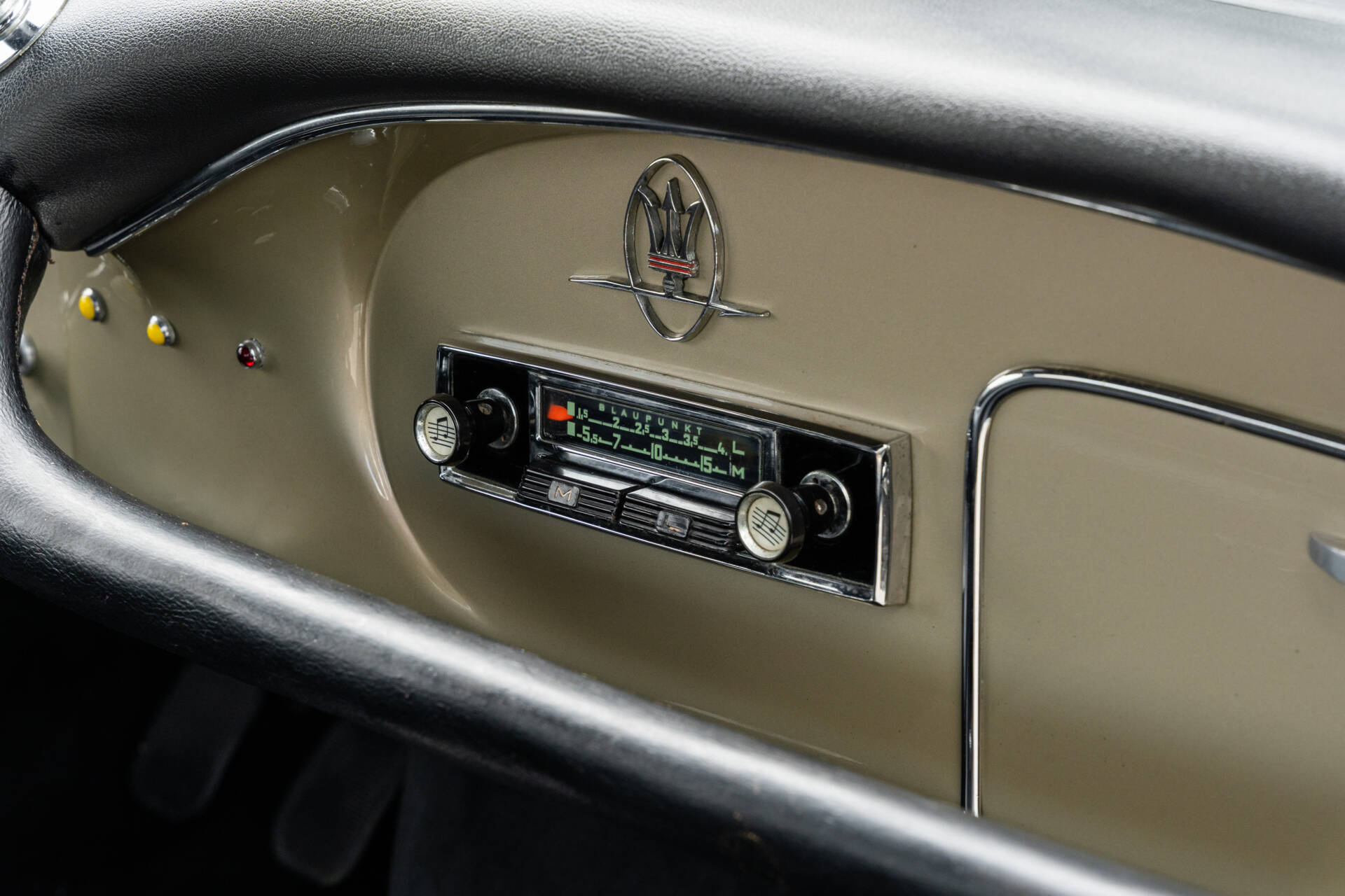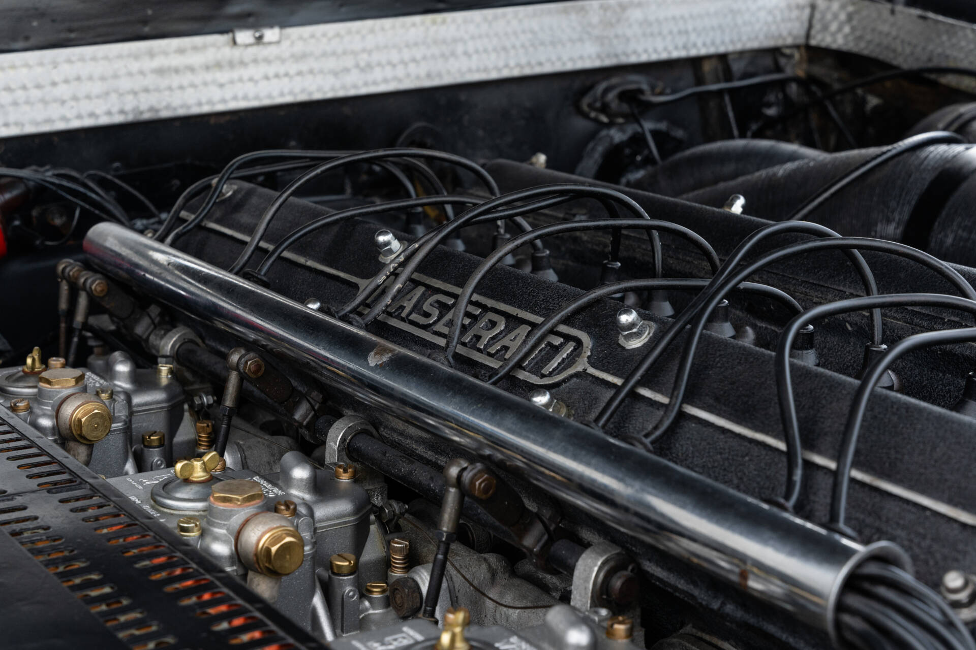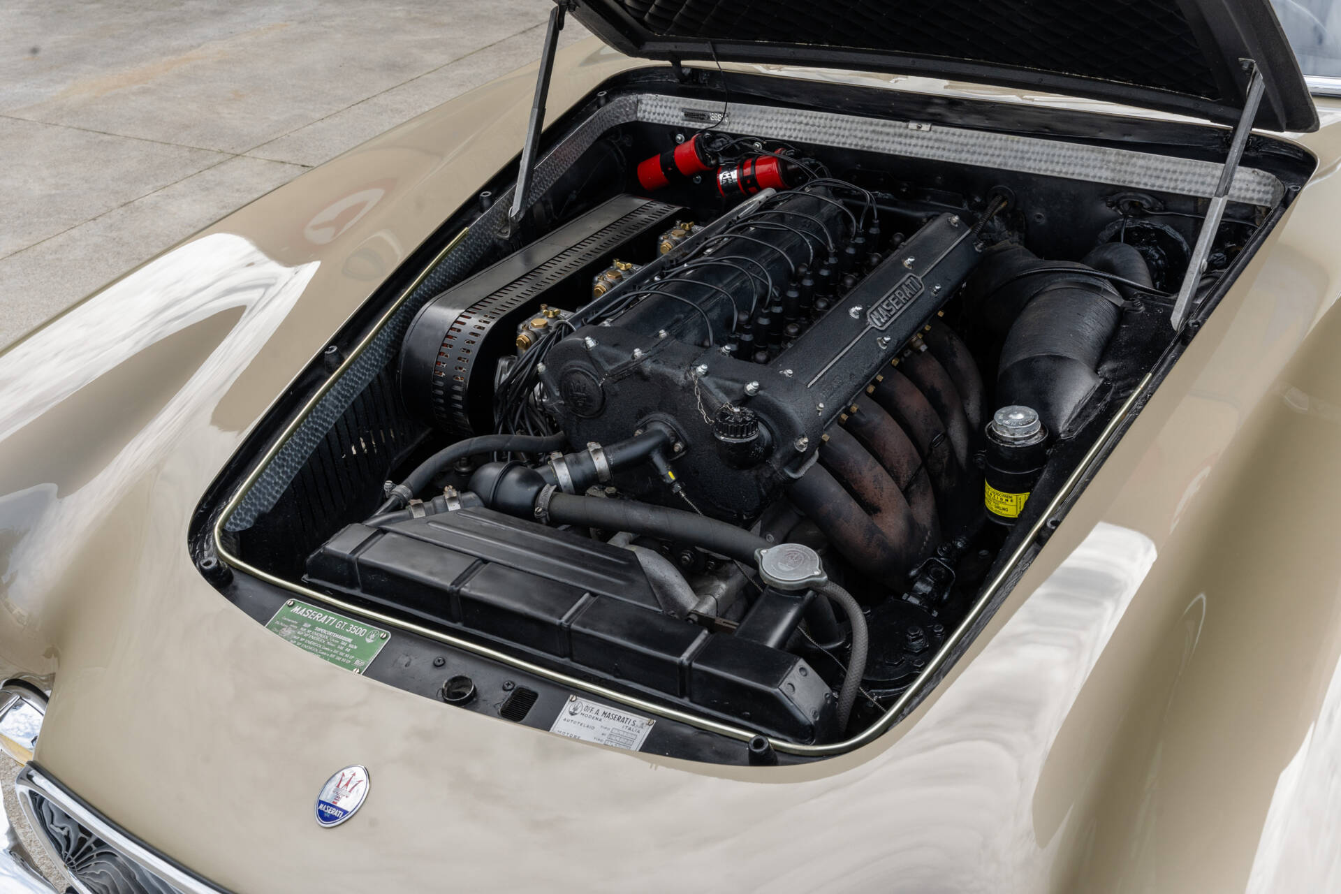 Meccanicamente, questo modello del 1960 presenta i ricercati freni a disco anteriori e un cambio manuale a 4 marce, abbinati al sonoro sei cilindri in linea da 3,5 litri (3.484 cc), che respira attraverso due carburatori Weber 42 DCOE. Avanzato per l'epoca, il motore vantava un blocco in alluminio e una testata con manicotti in ghisa, erogando un'impressionante potenza di 220 cavalli. Per bilanciare prestazioni e comfort, Maserati progettò una sofisticata sospensione anteriore a quadrilatero, mentre la parte posteriore utilizzava un assale rigido Salisbury di fabbricazione britannica, supportato da freni Girling e componenti delle sospensioni Alford & Alder. Il motore e il cambio sono stati restaurati secondo gli stessi rigorosi standard, assicurando che l'auto funzioni magnificamente come il suo aspetto.