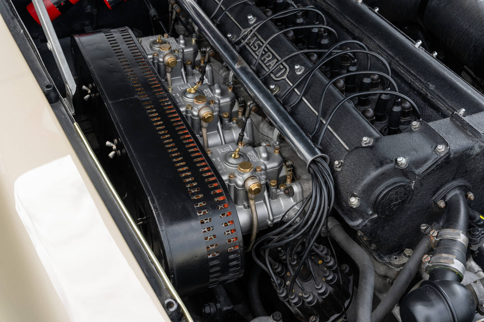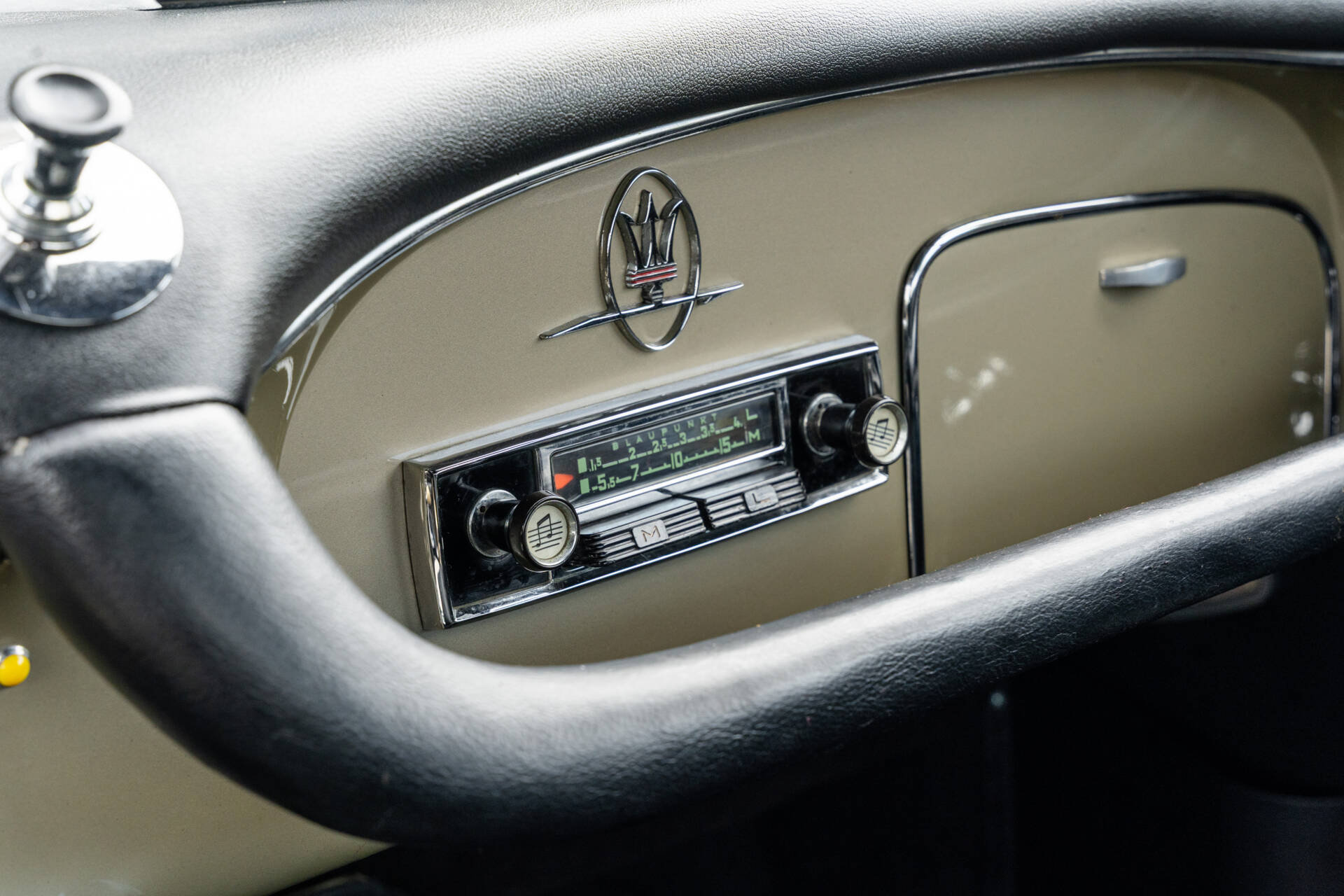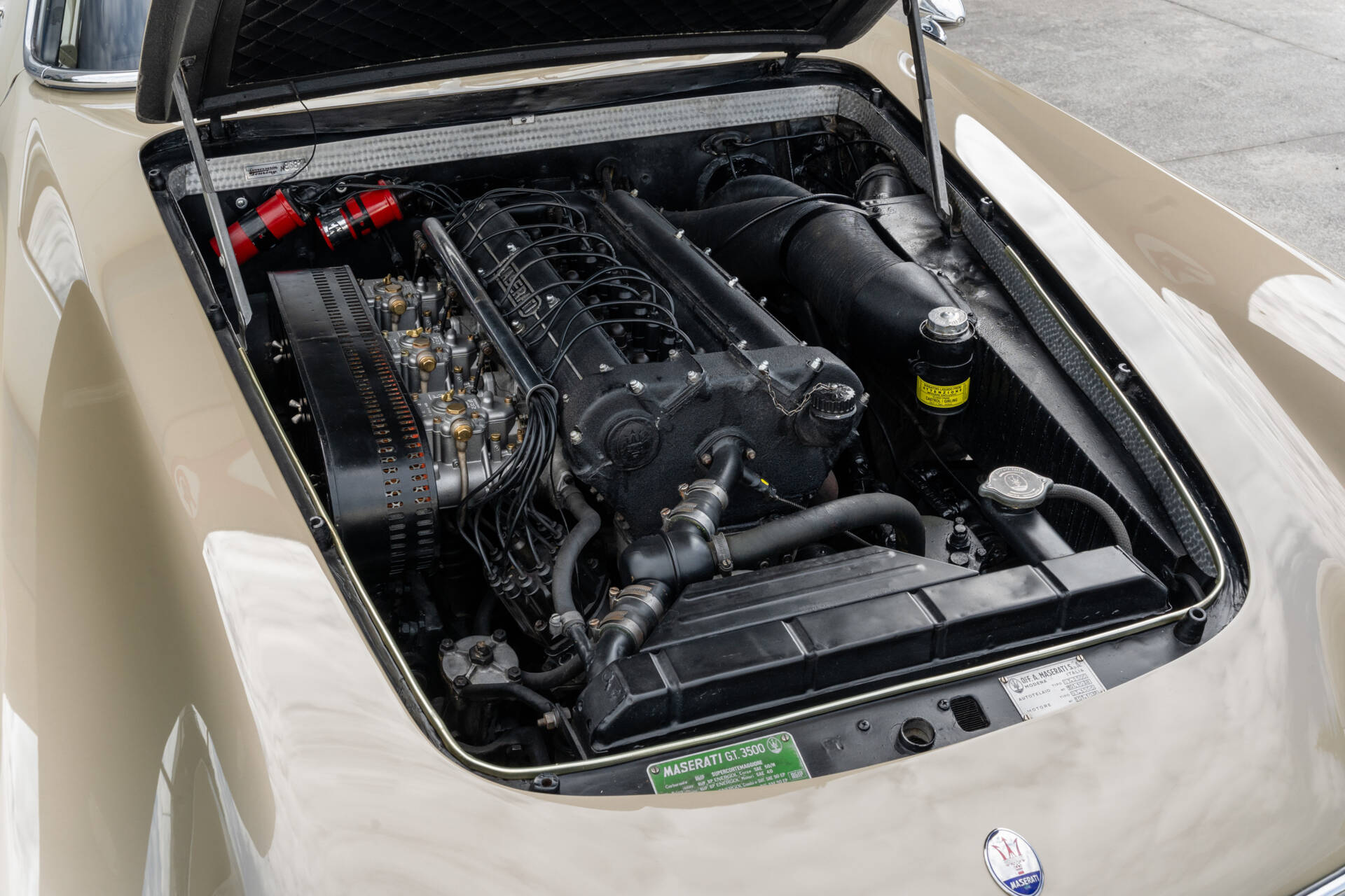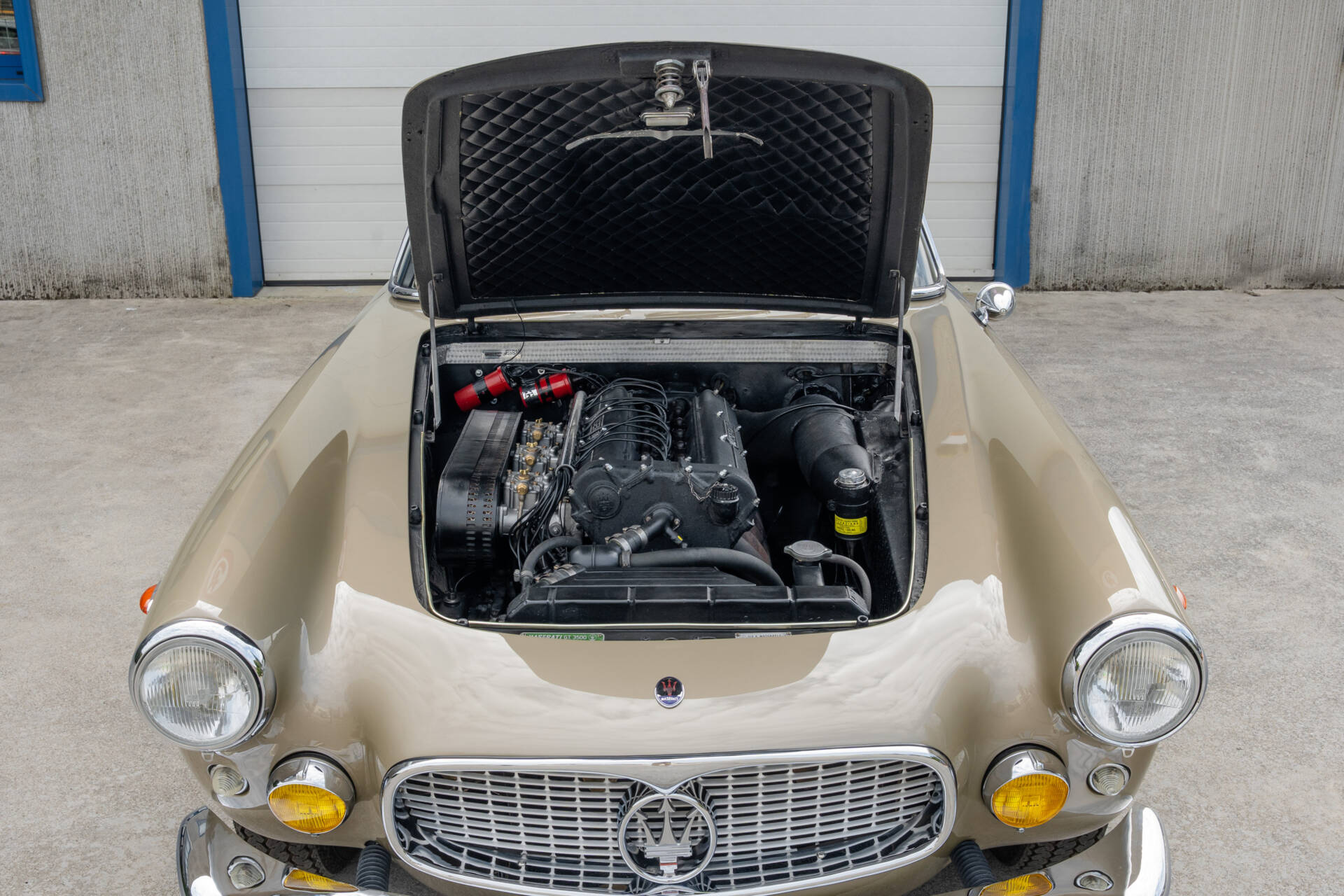 Meccanicamente, questo modello del 1960 presenta i ricercati freni a disco anteriori e un cambio manuale a 4 marce, abbinati al sonoro sei cilindri in linea da 3,5 litri (3.484 cc), che respira attraverso due carburatori Weber 42 DCOE. Avanzato per l'epoca, il motore vantava un blocco in alluminio e una testata con manicotti in ghisa, erogando un'impressionante potenza di 220 cavalli. Per bilanciare prestazioni e comfort, Maserati progettò una sofisticata sospensione anteriore a quadrilatero, mentre la parte posteriore utilizzava un assale rigido Salisbury di fabbricazione britannica, supportato da freni Girling e componenti delle sospensioni Alford & Alder. Il motore e il cambio sono stati restaurati secondo gli stessi rigorosi standard, assicurando che l'auto funzioni magnificamente come il suo aspetto.