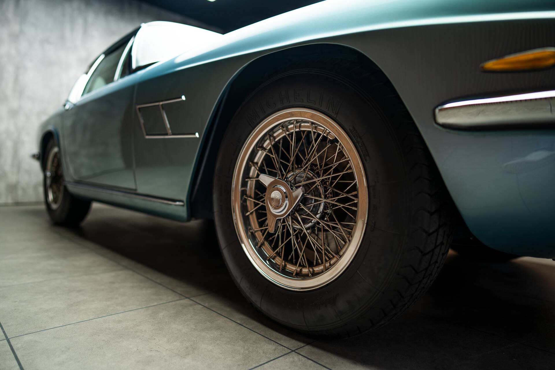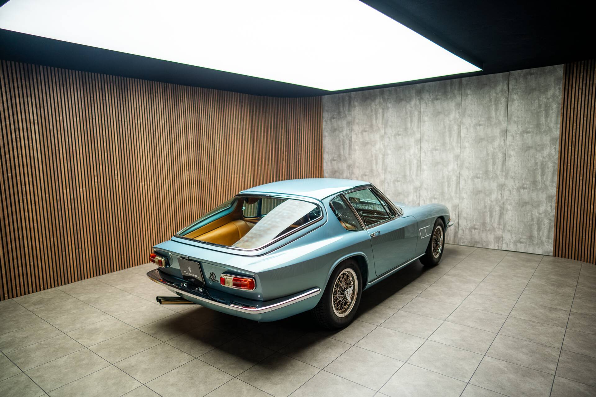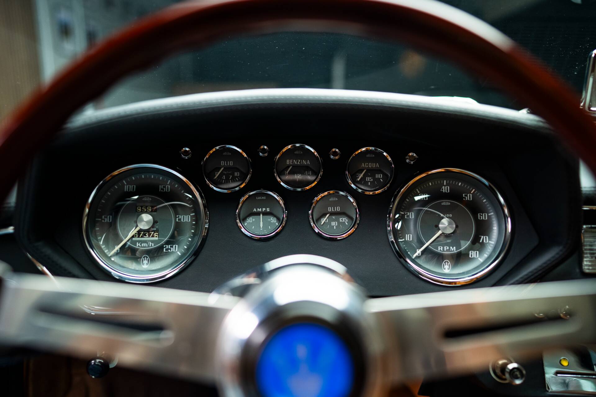The work on the bodywork and painting took over 600 hours. All panel gaps are uniform, all surfaces are perfectly flat, and the paint finish is of high quality, smooth, and glossy. After that, a complete restoration of the mechanical components and interior began, taking over two years. The entire mechanical system and bodywork were restored by the best Maserati specialists in Europe; every bolt, seal, bearing, connection, and all technical parts were replaced. Engine, gearbox, braking system, instruments, interior – everything was disassembled and overhauled. Known weak points of the Mistral were addressed, improving durability and reliability. Even a custom-made rear axle brace, which enhances handling and road stability, was designed, manufactured, and installed. The chrome wire wheels by Borrani, size 16x6L RW3872 RECORD, were restored and fitted with genuine Michelin tires of the original size 6.00 x 16 Michelin X (Radial). All chrome parts were meticulously refinished, either re-chromed or polished. All glass panels were polished, the windshield was replaced, and all rubber seals were renewed. The seats were reupholstered, with a flatter seat cushion for the driver's seat to accommodate taller drivers. The leather used was sourced in England and meets the original specifications. It is vegetable tanned and has the authentic color and grain; the smell of the leather is wonderful. The carpet is also from Wilton and is a high-pile wool carpet – nothing like modern carpets! The carpet edging is made of leather and stitched with a double, hidden seam. A custom-designed, discreetly mounted air conditioning system ensures that even long summer journeys are comfortable. Over €300,000 was invested in this "Mistral 3700 GTI 2-seater". This car is better than when it left the factory in March 1965. It has been restored using modern technologies and tools, and features a corrosion-resistant dip-coating primer. The mechanics have been meticulously restored with expert knowledge and experience, using modern materials, and known weak points have been addressed, improving reliability. This includes, among other things, modern pistons and an improved cylinder head gasket. The fuel injection system, often considered temperamental, has been expertly overhauled and now operates reliably and precisely, allowing the vehicle to perform smoothly and confidently, both in city traffic and at high speeds on the highway. The custom-made stainless steel exhaust system, built to original specifications, gives the engine a truly captivating sound! This car is a rare collector's item and not comparable to an average Mistral on the market. This Mistral is part of the fantastic "Tridente Colonia - Collezione Perfetta del Curbs Club" collection of Maserati vehicles, all in comparable condition.