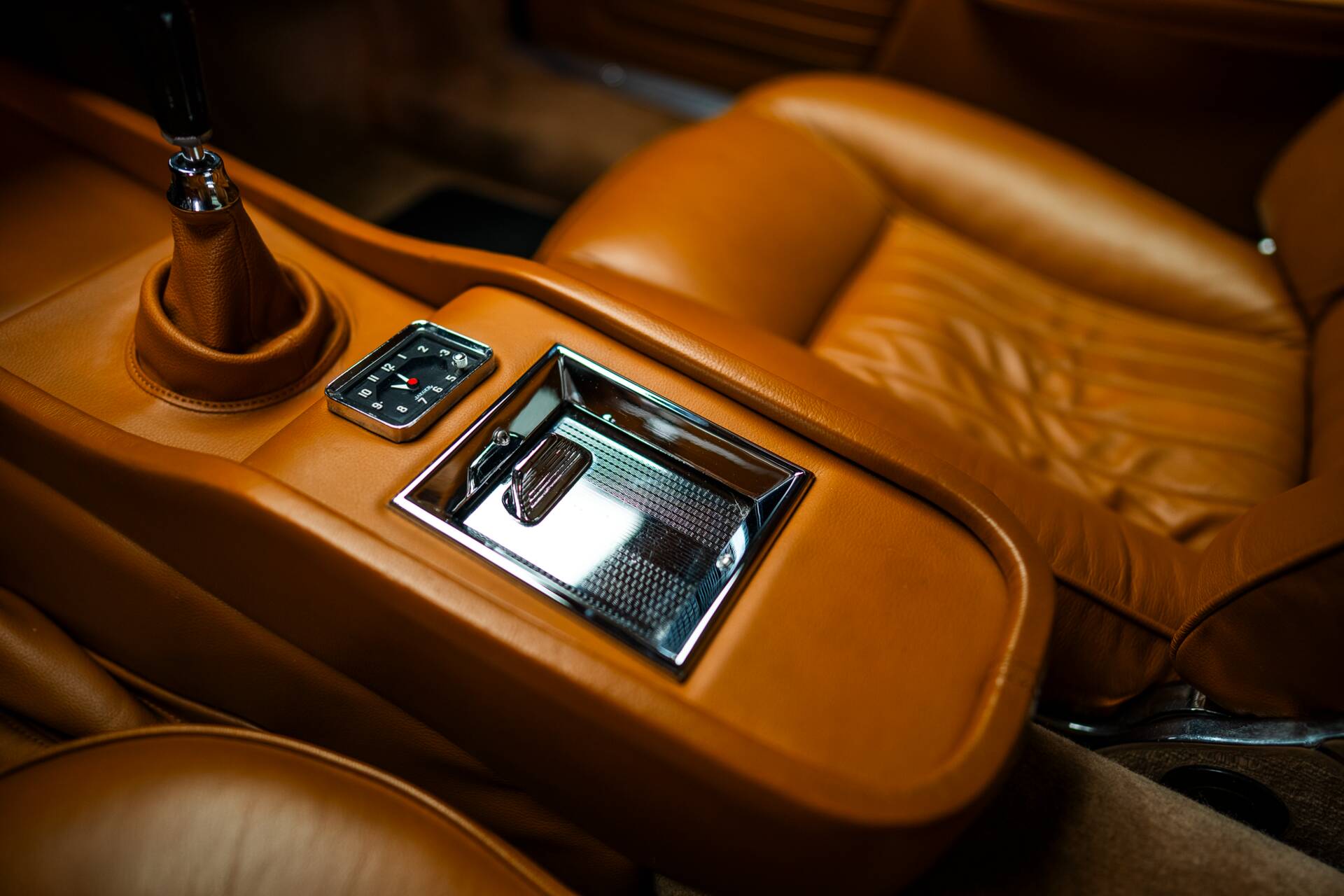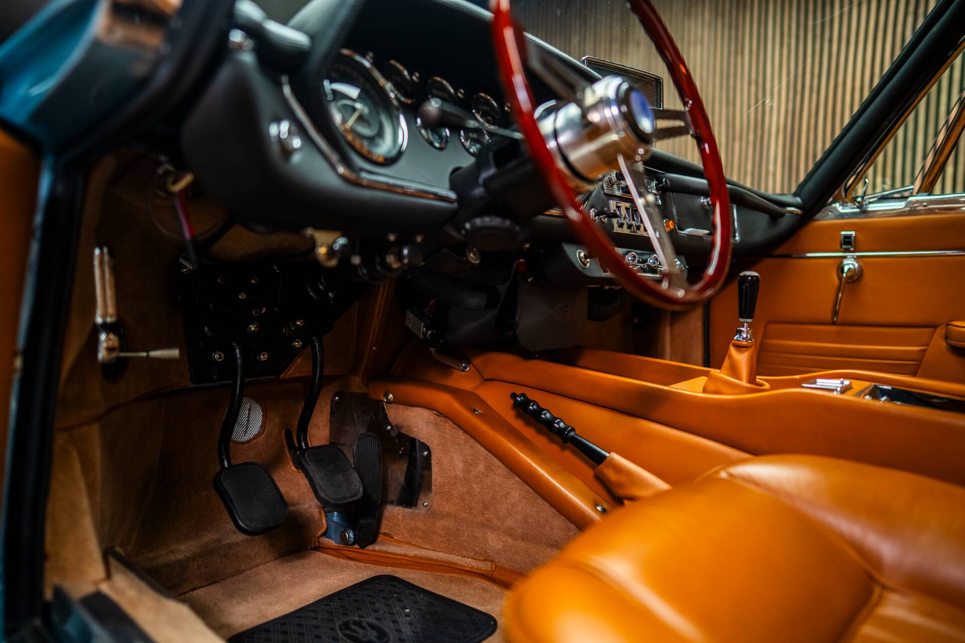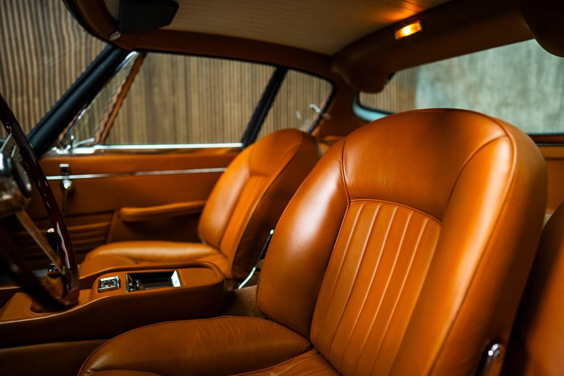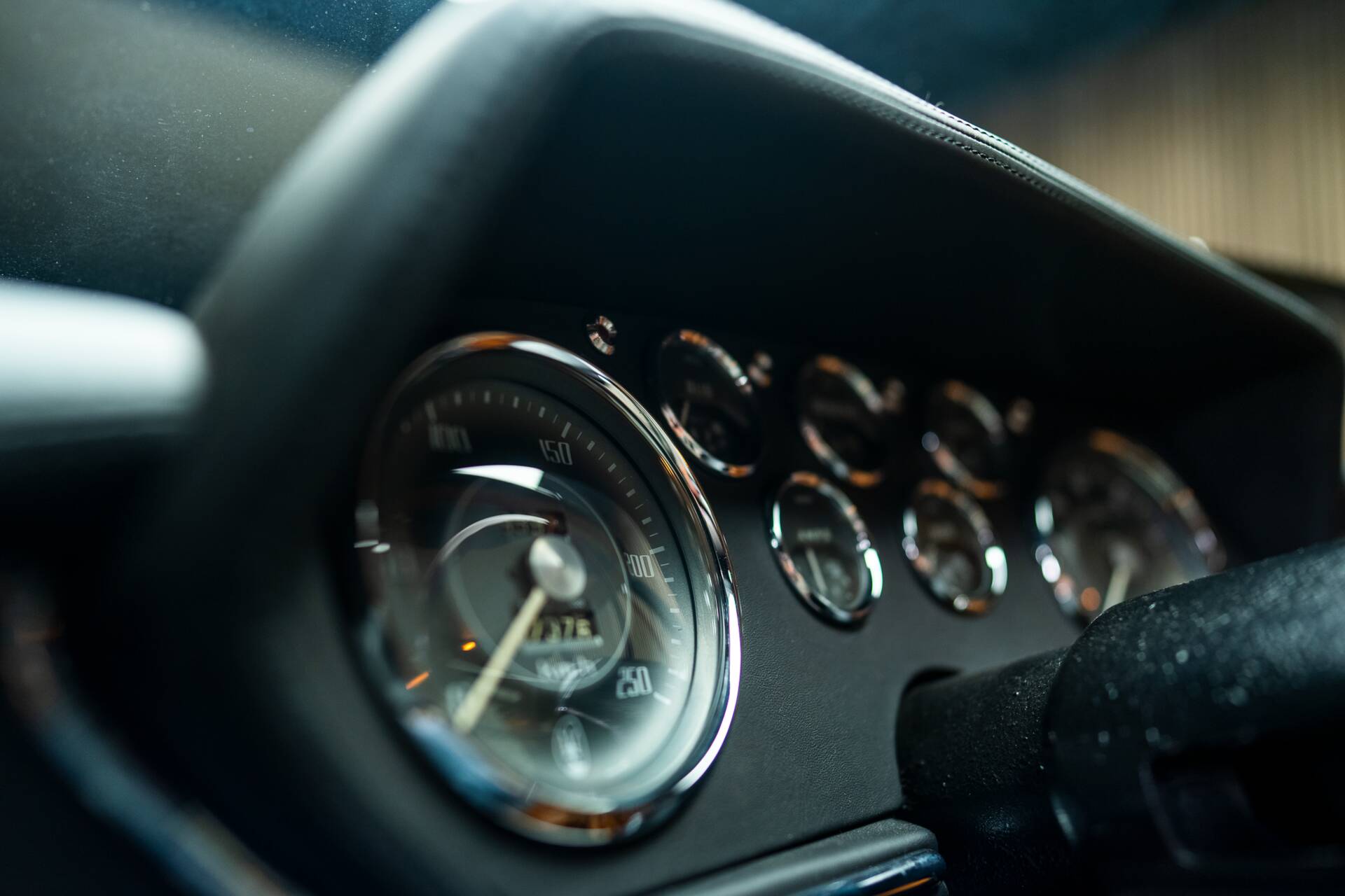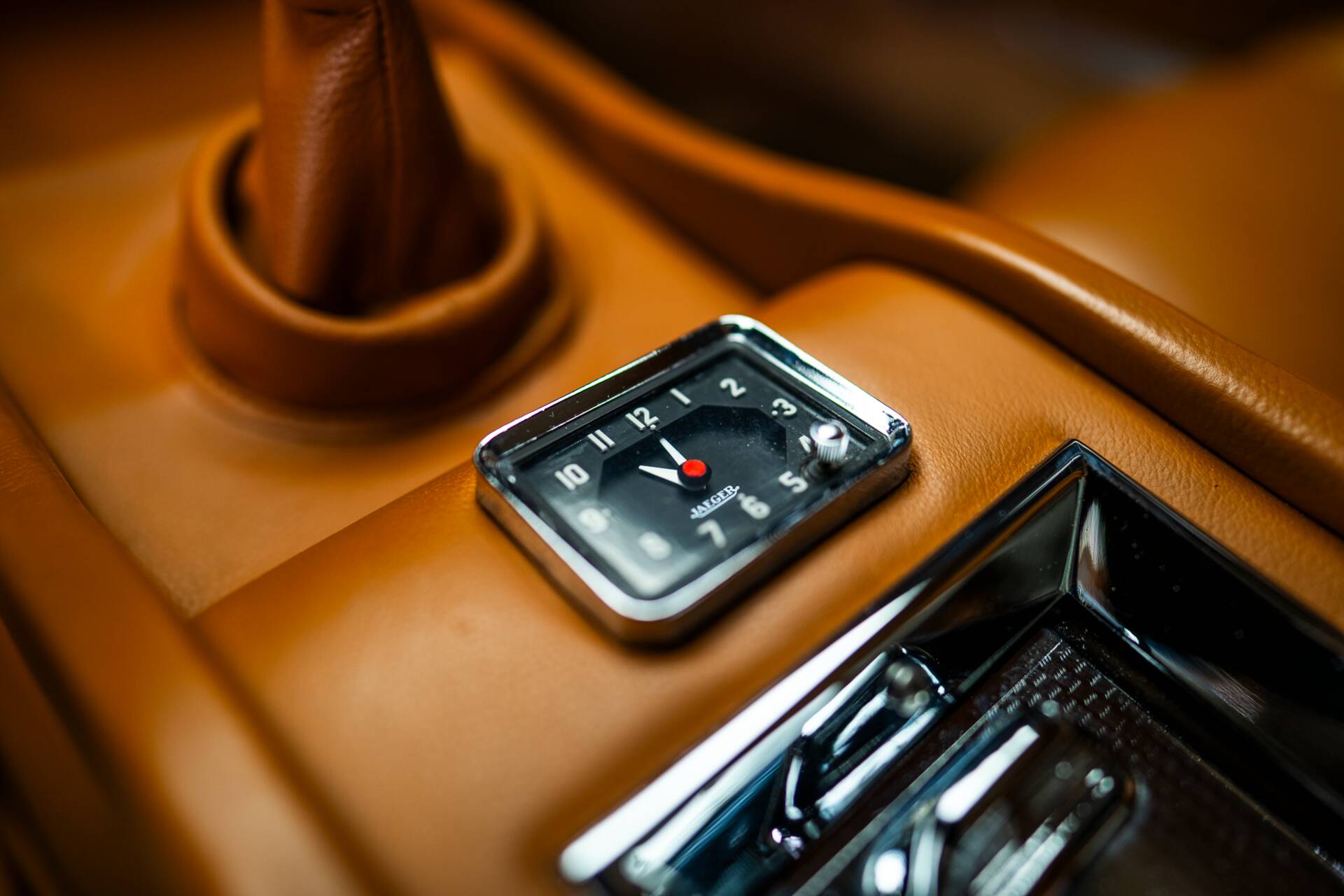 The interior is driver-focused and features a classic, sporty cockpit with high-quality materials such as Connolly leather, glass, chrome, and Wilton wool carpeting. A classic-design 3-spoke mahogany steering wheel by EFFPI completes the cockpit. The beautifully designed instruments consist of a large Jaeger speedometer and tachometer, and five smaller Lucas gauges for oil pressure and temperature, fuel level, coolant temperature, and an ammeter. The center console houses a Jaeger mechanical clock and an ashtray that is a work of art in itself. The entire dashboard is covered in black leather, and together with the elegant switches and chrome trim, it offers the driver a functional, sporty, and very high-quality dashboard.