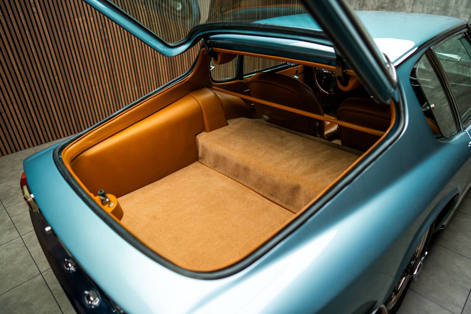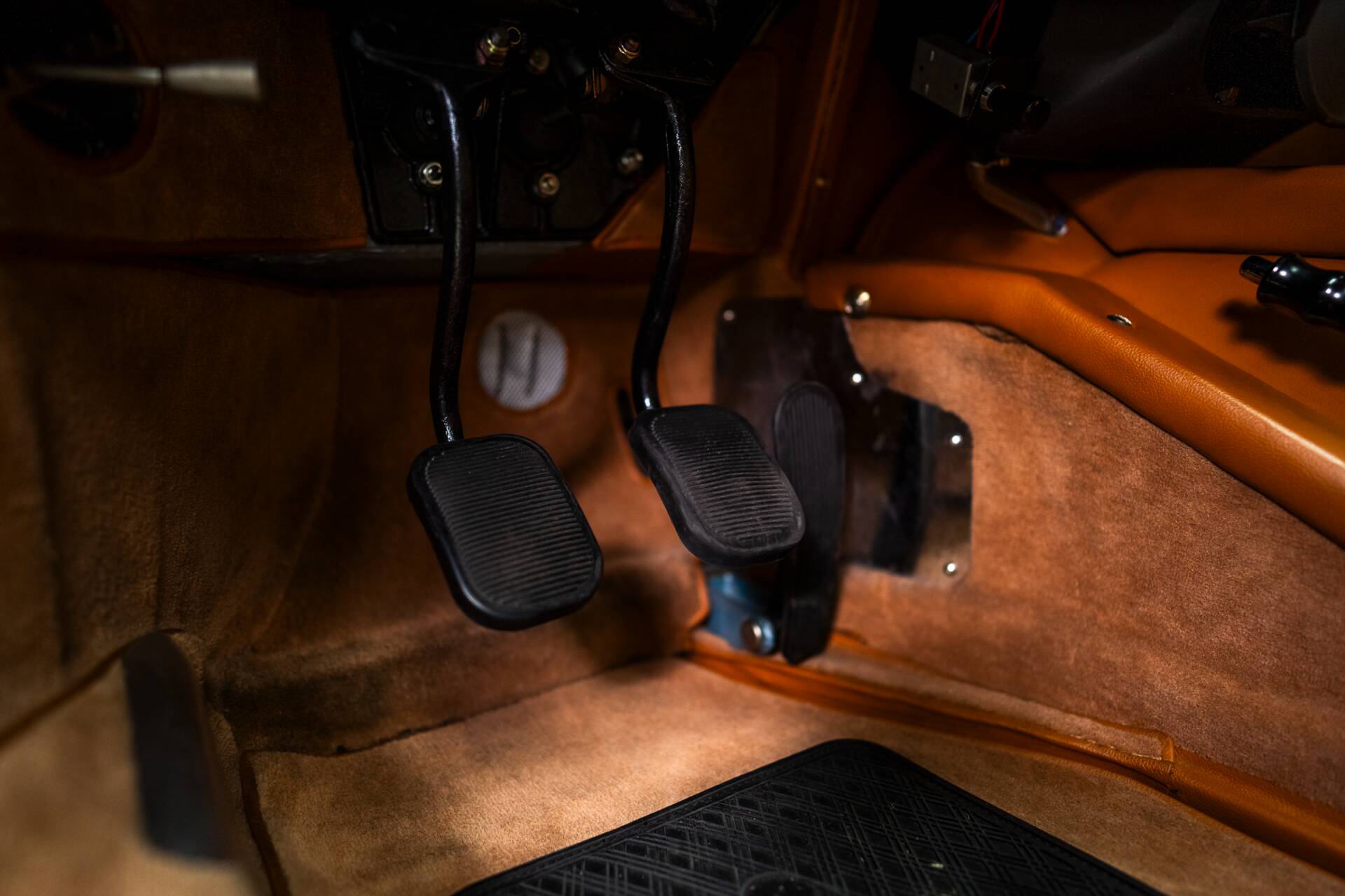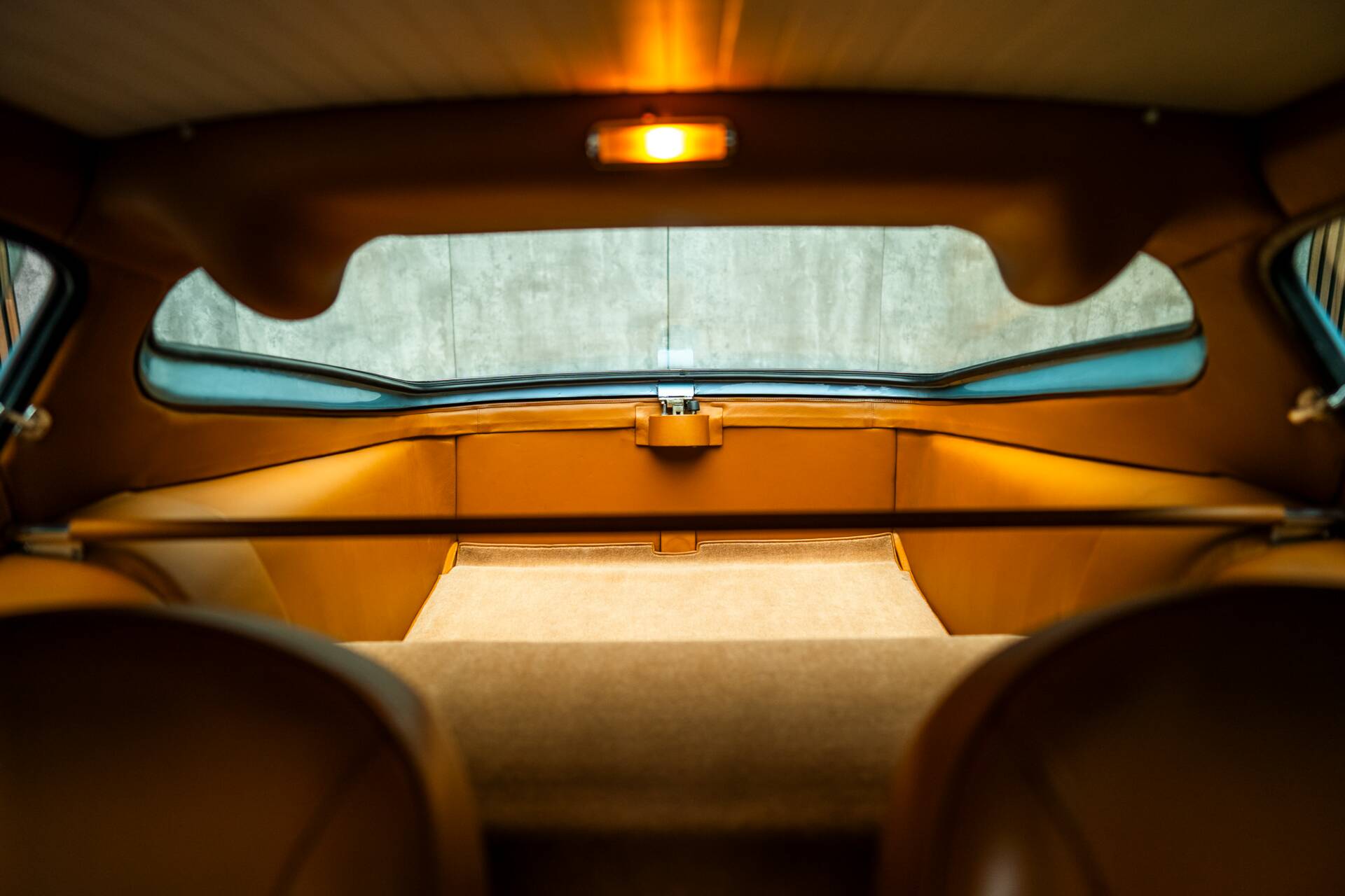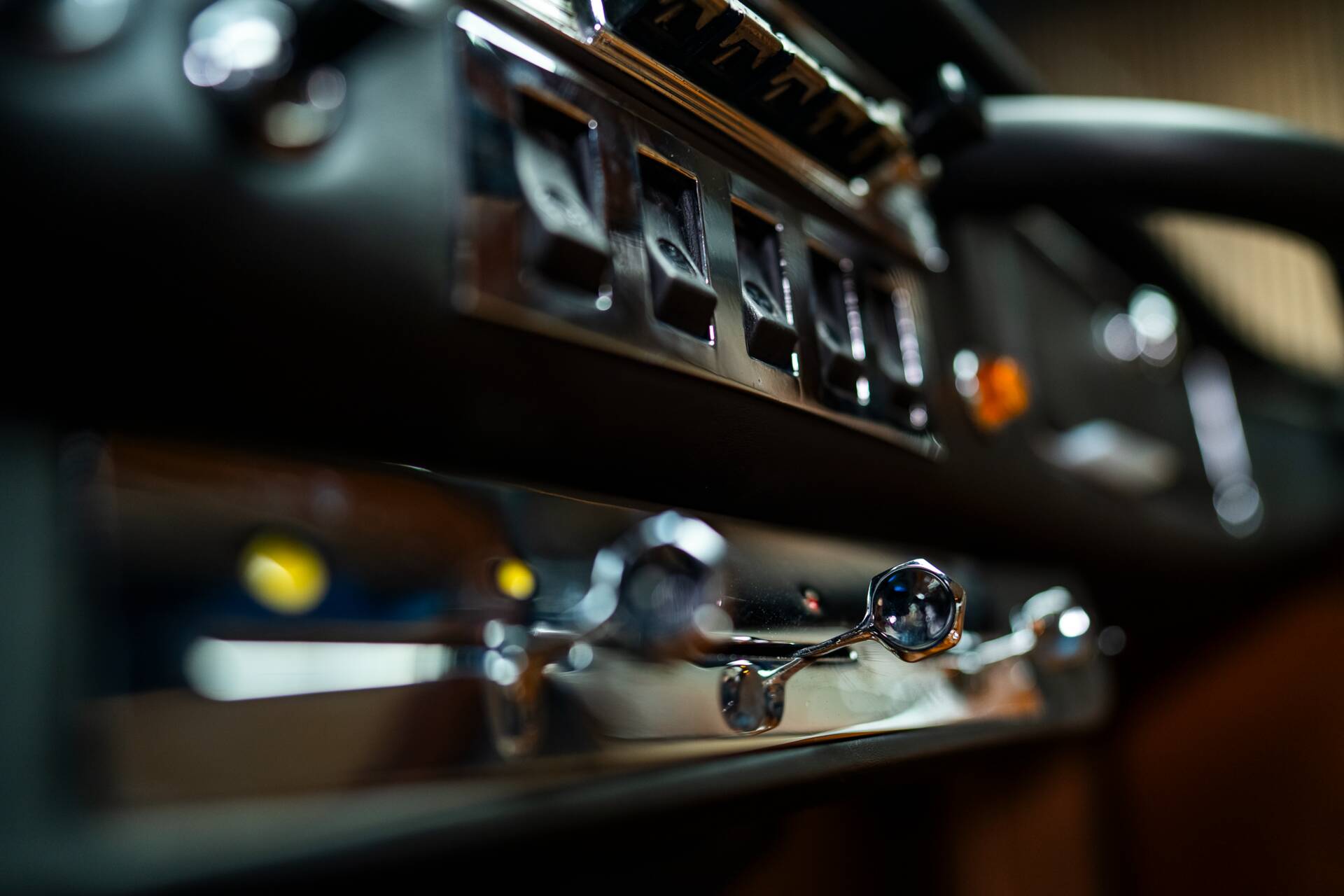 The interior is driver-focused and features a classic, sporty cockpit with high-quality materials such as Connolly leather, glass, chrome, and Wilton wool carpeting. A classic-design 3-spoke mahogany steering wheel by EFFPI completes the cockpit. The beautifully designed instruments consist of a large Jaeger speedometer and tachometer, and five smaller Lucas gauges for oil pressure and temperature, fuel level, coolant temperature, and an ammeter. The center console houses a Jaeger mechanical clock and an ashtray that is a work of art in itself. The entire dashboard is covered in black leather, and together with the elegant switches and chrome trim, it offers the driver a functional, sporty, and very high-quality dashboard.