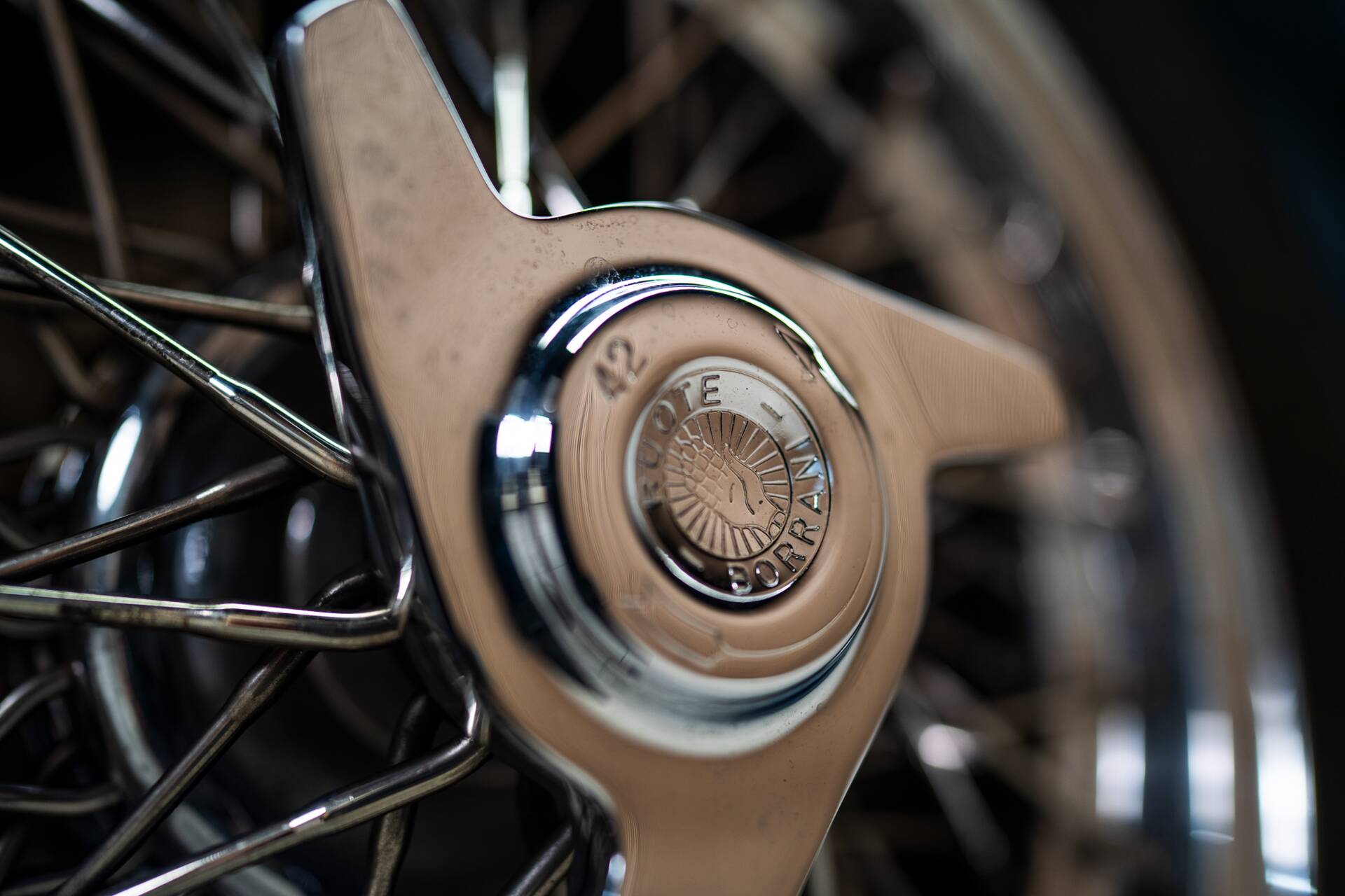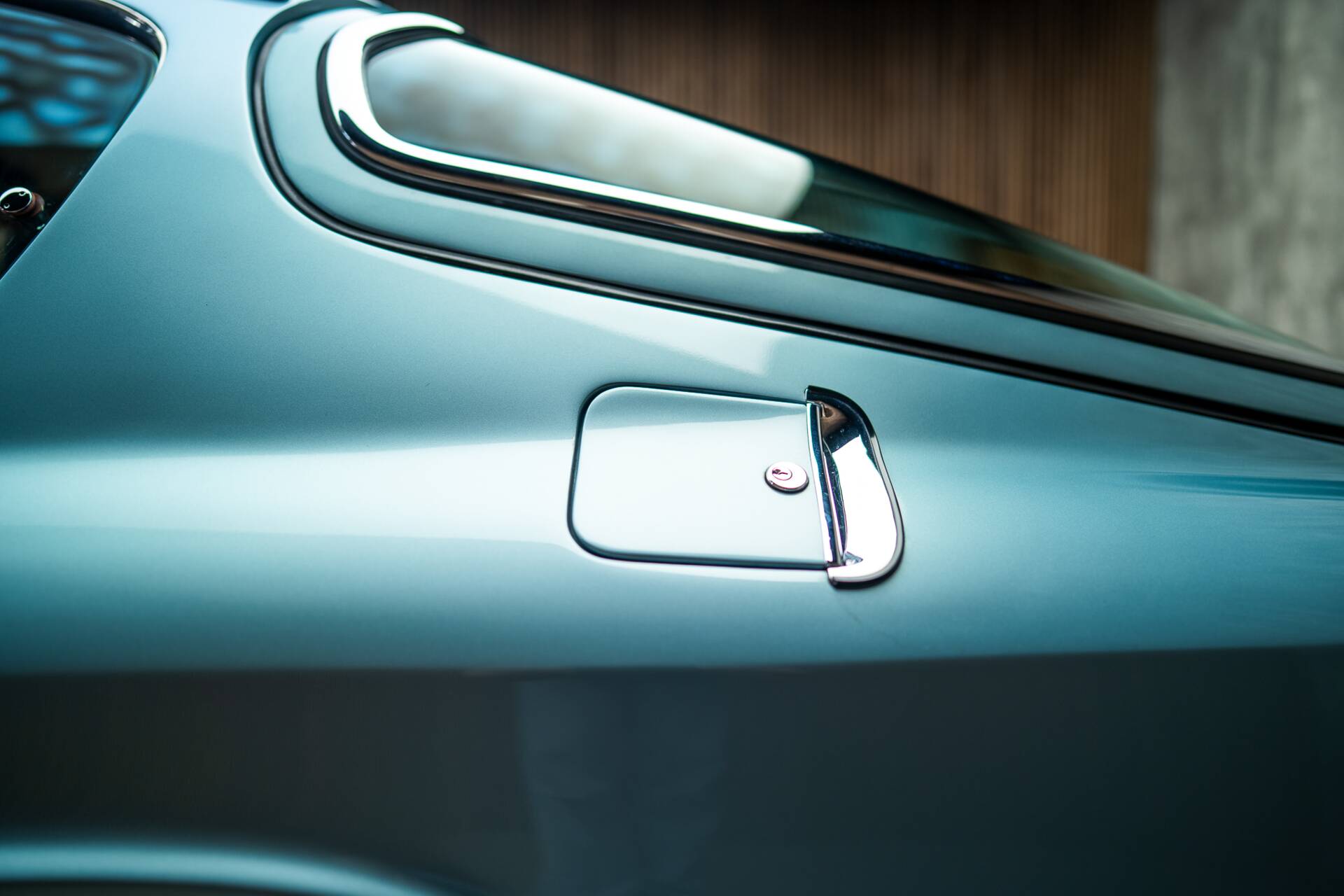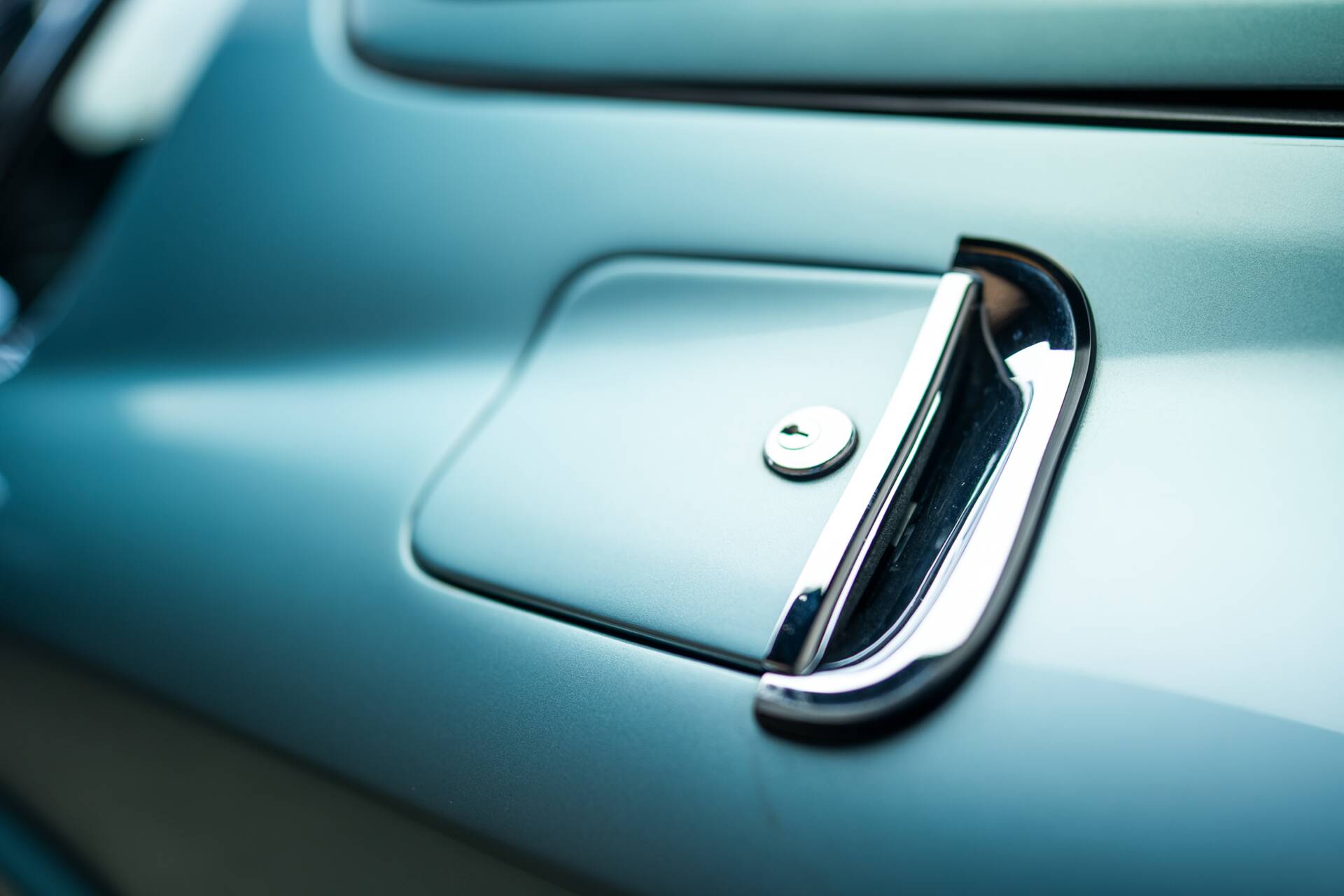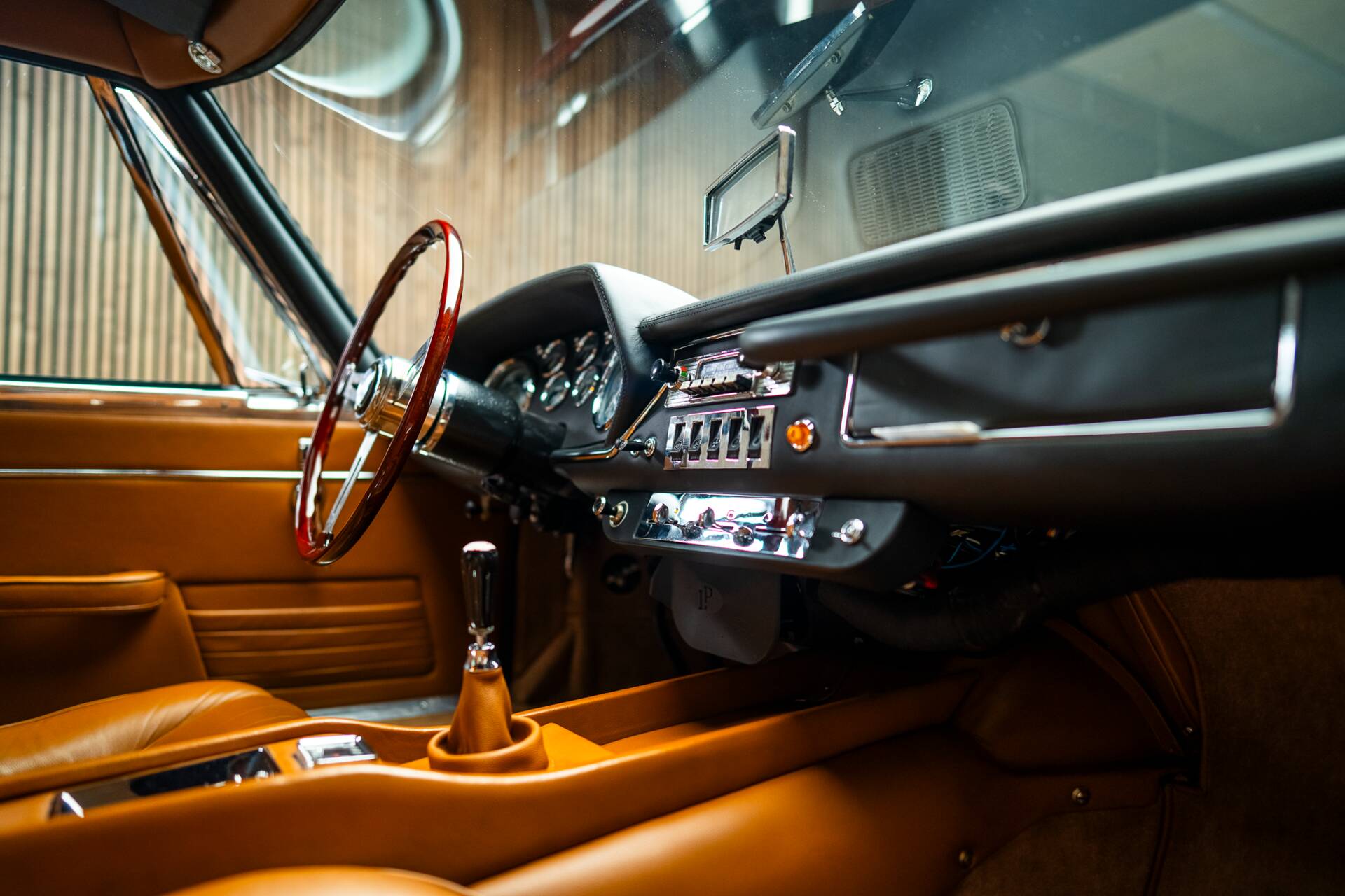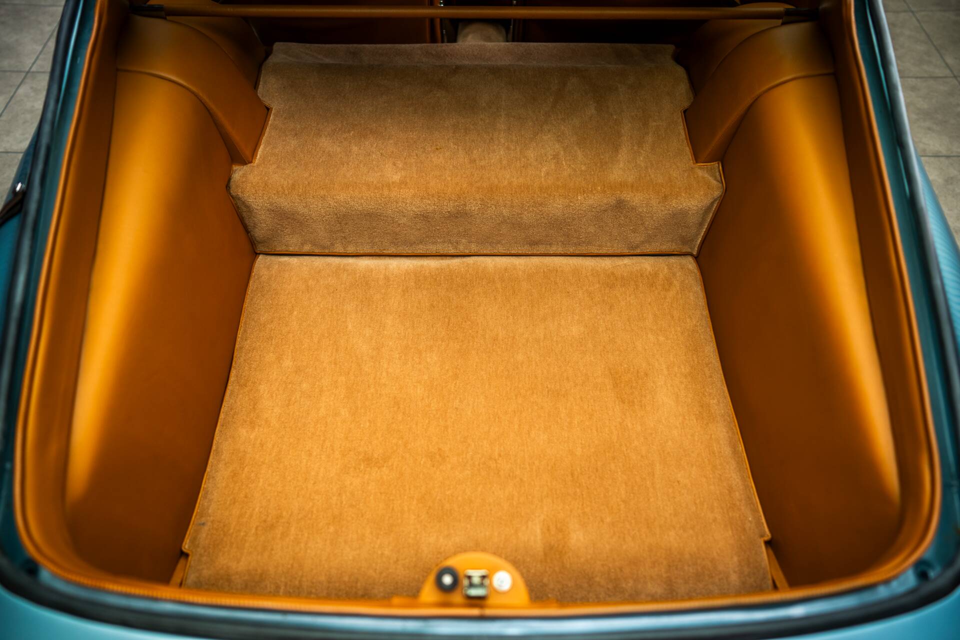 The interior is driver-focused and features a classic, sporty cockpit with high-quality materials such as Connolly leather, glass, chrome, and Wilton wool carpeting. A classic-design 3-spoke mahogany steering wheel by EFFPI completes the cockpit. The beautifully designed instruments consist of a large Jaeger speedometer and tachometer, and five smaller Lucas gauges for oil pressure and temperature, fuel level, coolant temperature, and an ammeter. The center console houses a Jaeger mechanical clock and an ashtray that is a work of art in itself. The entire dashboard is covered in black leather, and together with the elegant switches and chrome trim, it offers the driver a functional, sporty, and very high-quality dashboard.