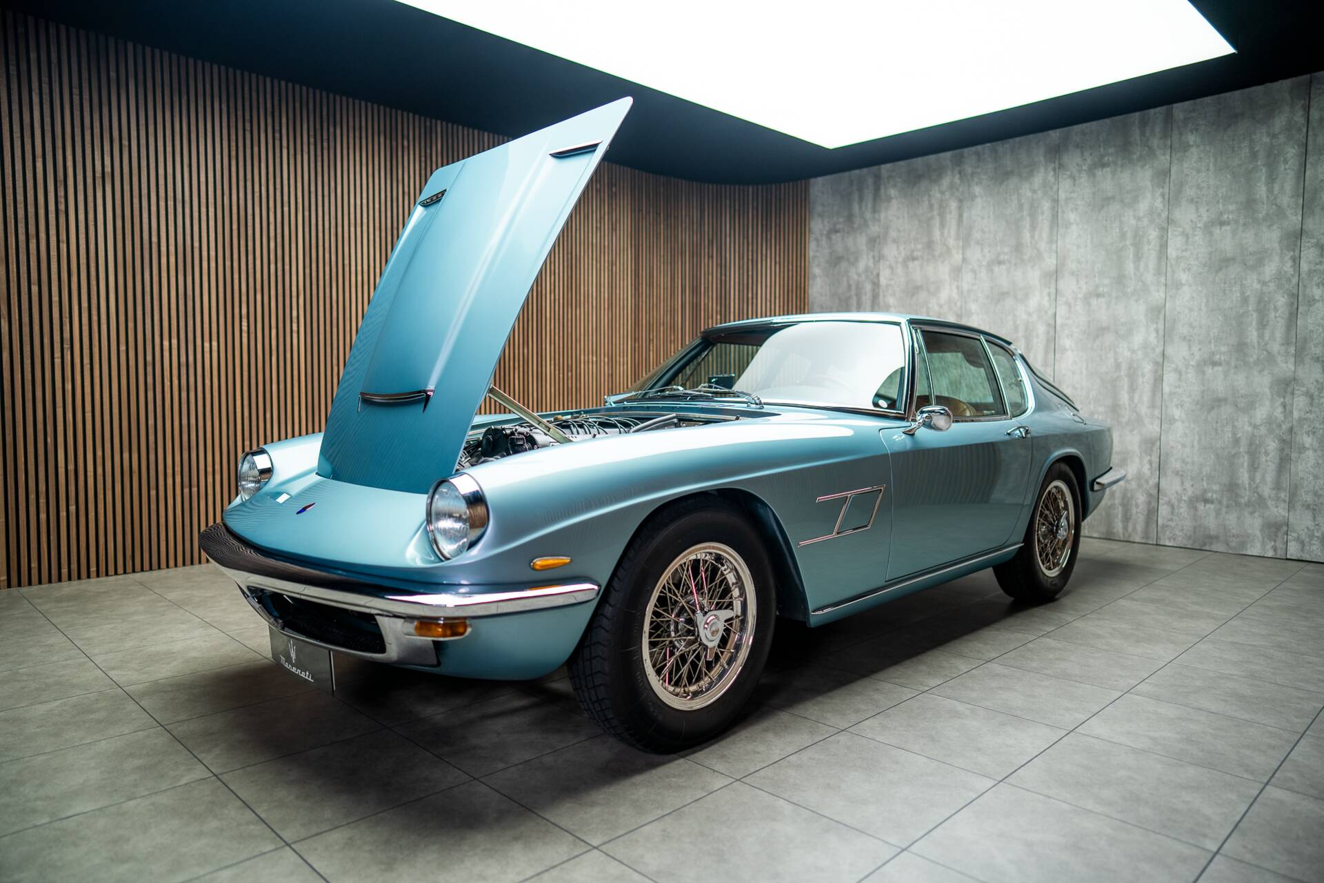 This Mistral was built in March 1965 and left the factory in "Azzurro Chiaro Metallizzato" (light metallic blue), paint code Salchi 106A20. The interior trim is "Pelle Senape" (mustard leather), Connolly code PAC.1775. Both were restored to original specifications. The car has a 3.7-liter engine and a 5-speed ZF transmission. In my opinion, this is the best engine for this car, better than the larger 4.0-liter version. The 3.7-liter engine has thicker cylinder liners and is therefore less prone to overheating. The lighter crankshaft also makes it more responsive. It still has the beautiful original dashboard. This Maserati was originally delivered to the USA. In 2011, the car returned to Europe. The next owner, the Joop Stolze Collection, sold the coupe to its current owner in 2011. He decided to have the car undergo a concours-level restoration. The car was restored to the finest detail, without any expense spared, in 2,500 hours of work. I am convinced that this is one of the best Mistrals in the world, restored by one of the best European Maserati specialists. The car was completely disassembled, the aluminum body separated from the frame, and then expertly repaired by the most talented bodywork specialists. During this process, the bodywork was disassembled, and the paint and rust were removed using a chemical dip tank. Subsequently, it was repaired on a Celette chassis straightening frame and reassembled with the restored aluminum panels.