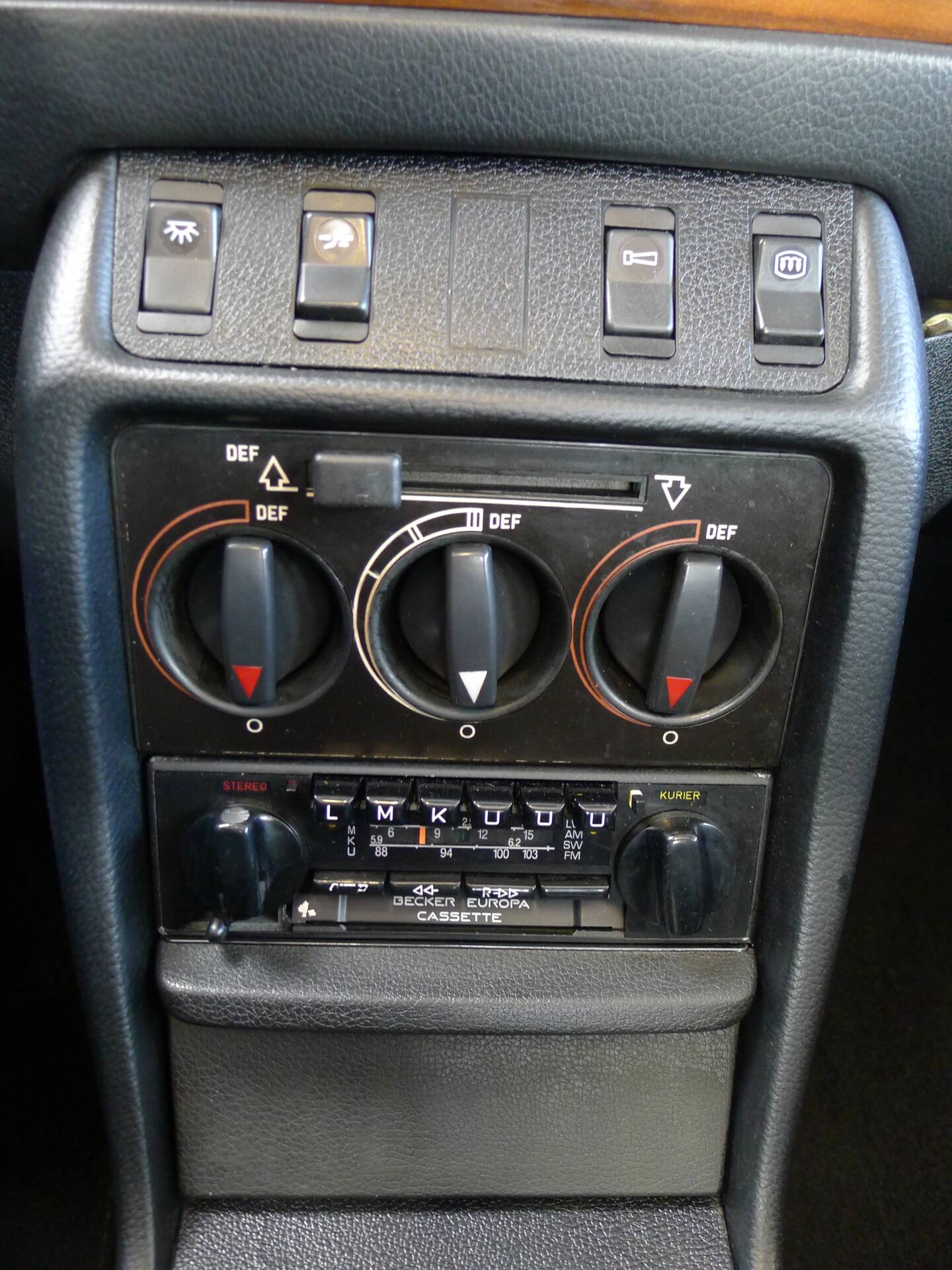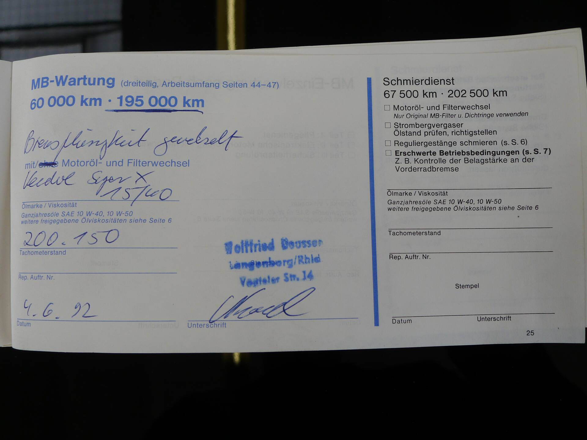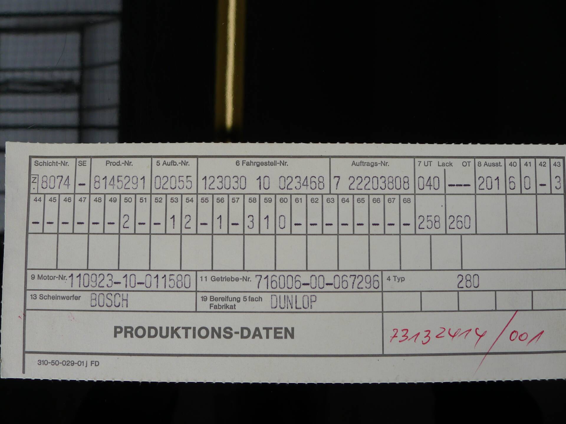 Es ist ein 4-Gang Schalter in der seltenen Farbkombination 040 schwarz mit schwarzem Leder, als weitere Ausstattung wurden u.a. ein elektrisches Schiebedach und elektrische Fensterheber vorne geordert.