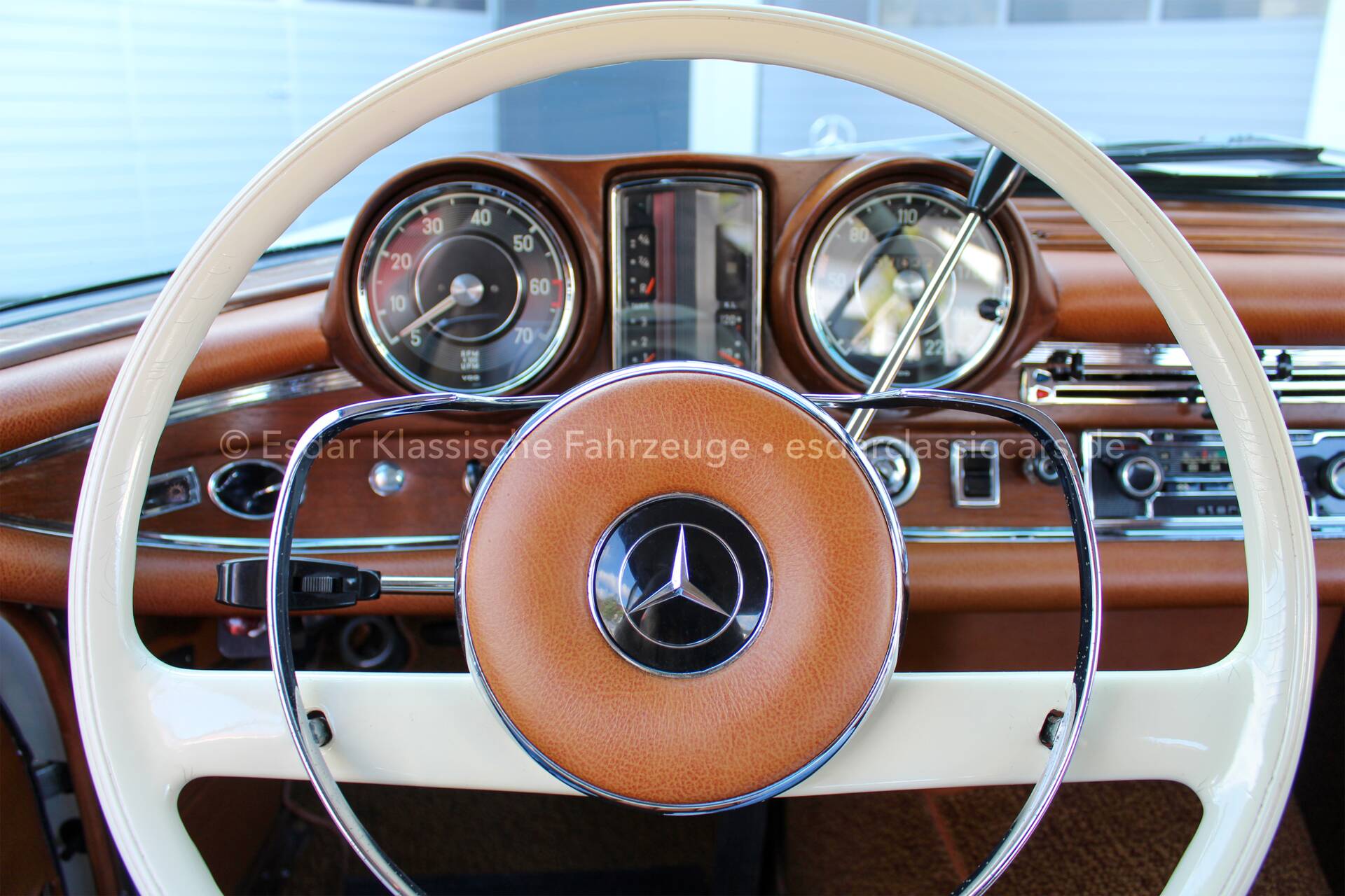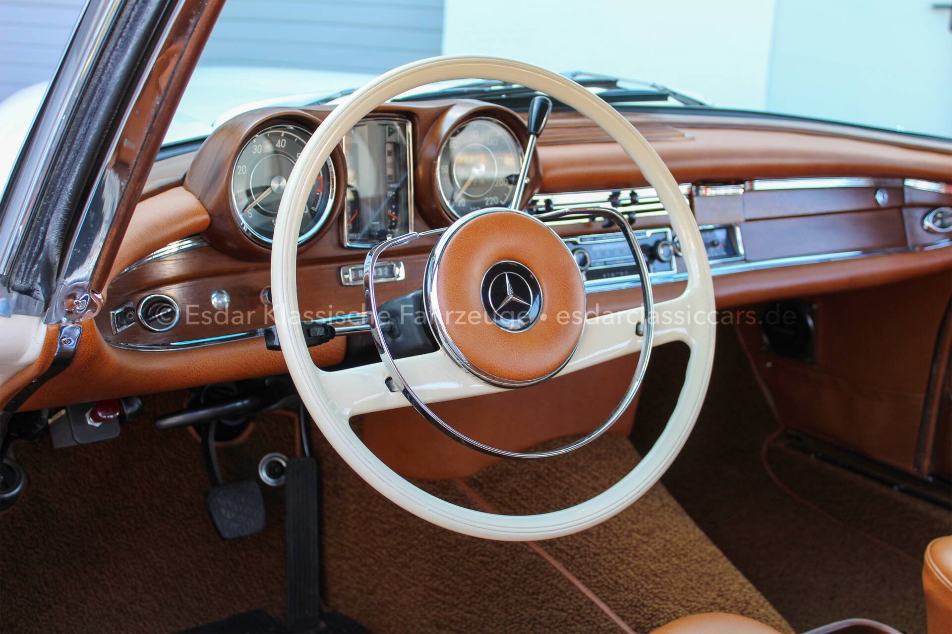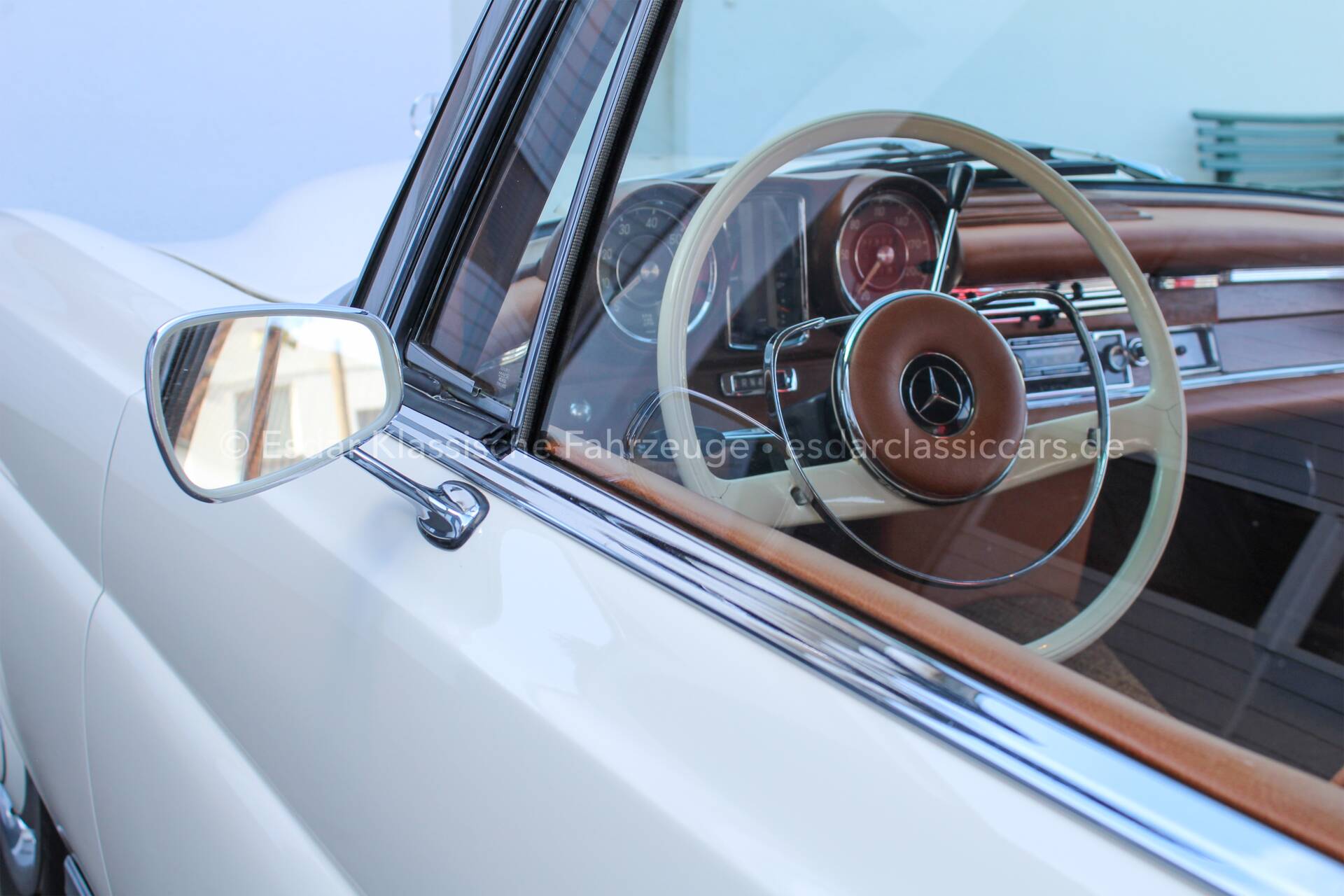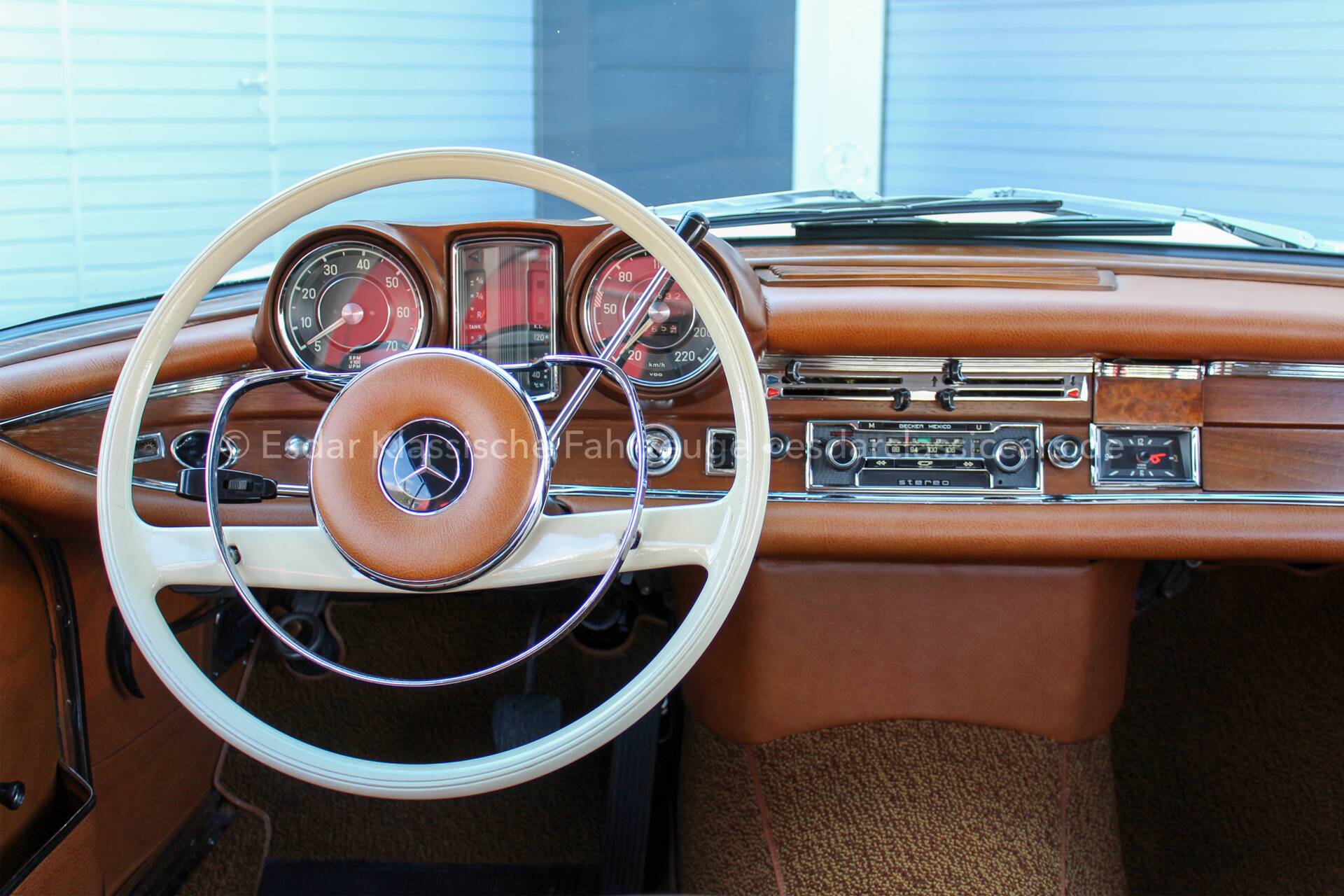 Im Innenraum des 250 SE Coupé erwartet den Fahrer eine luxuriöse Atmosphäre aus edlen Materialien und handwerklicher Perfektion. Echtholzfurniere, hochwertiges Leder und großzügige Chromdetails schaffen ein klassisches Ambiente, das an eine andere Zeit erinnert. Die großzügige Verglasung sorgt für hervorragende Rundumsicht, während die harmonische Linienführung des Armaturenbretts die Eleganz des Exterieurs fortsetzt.