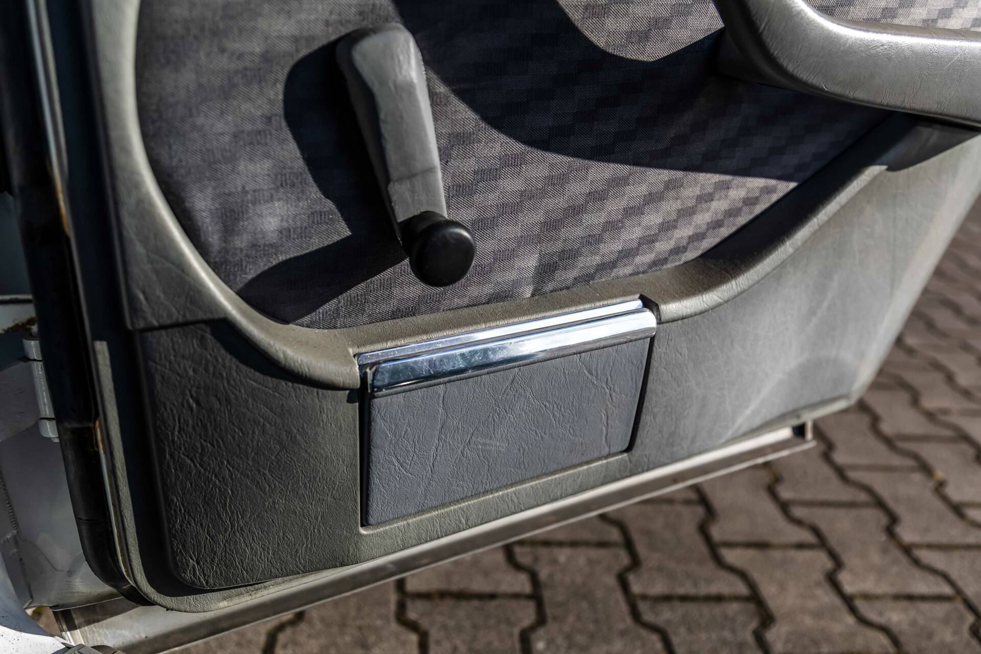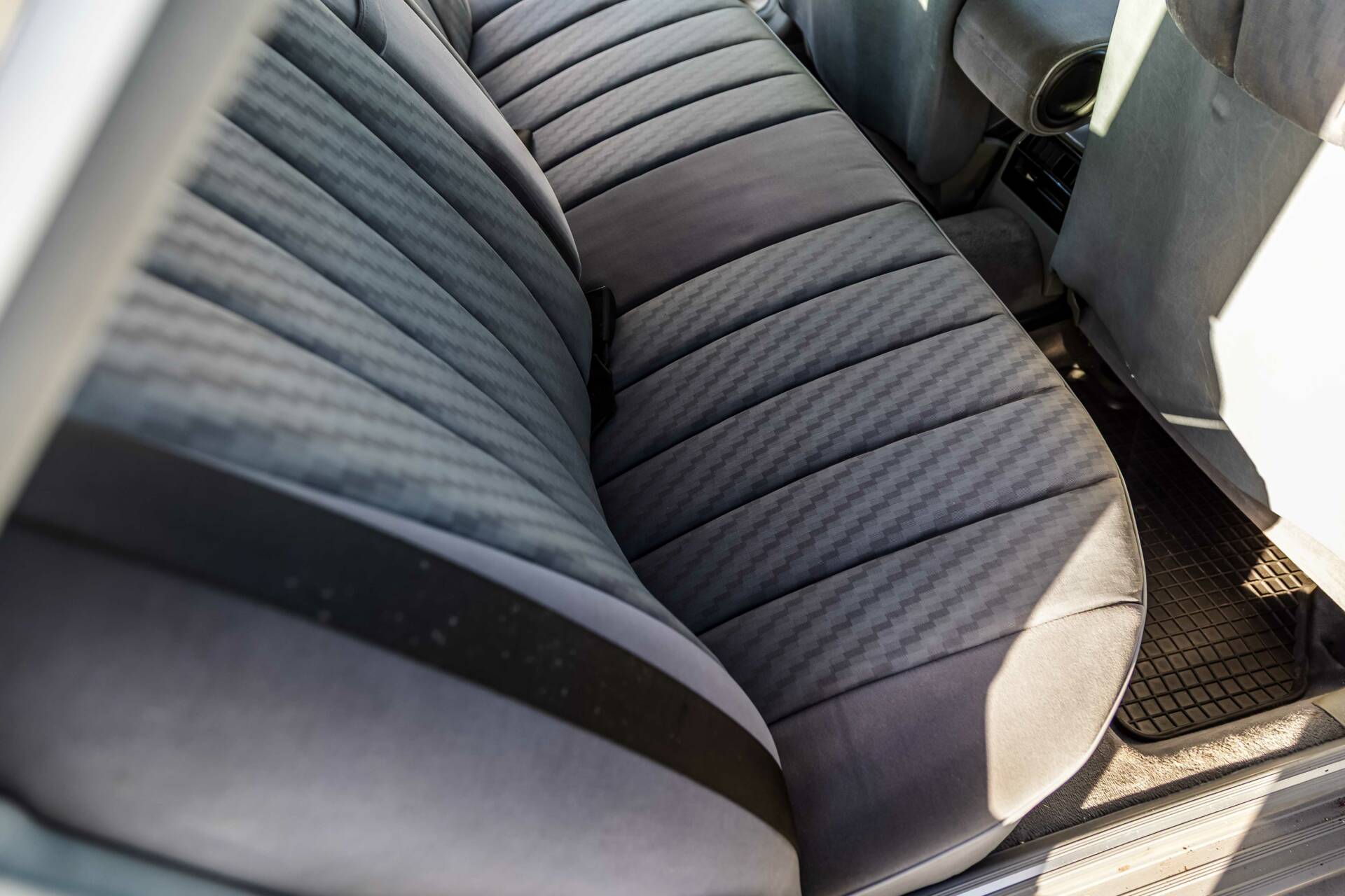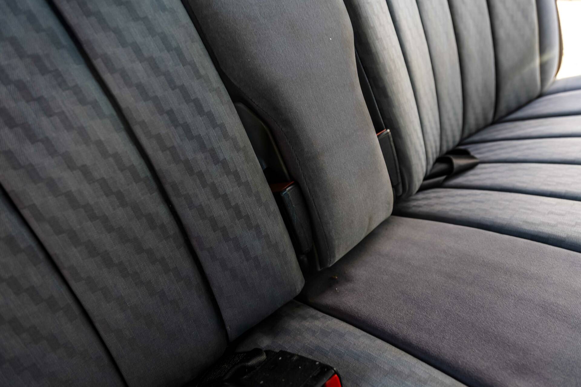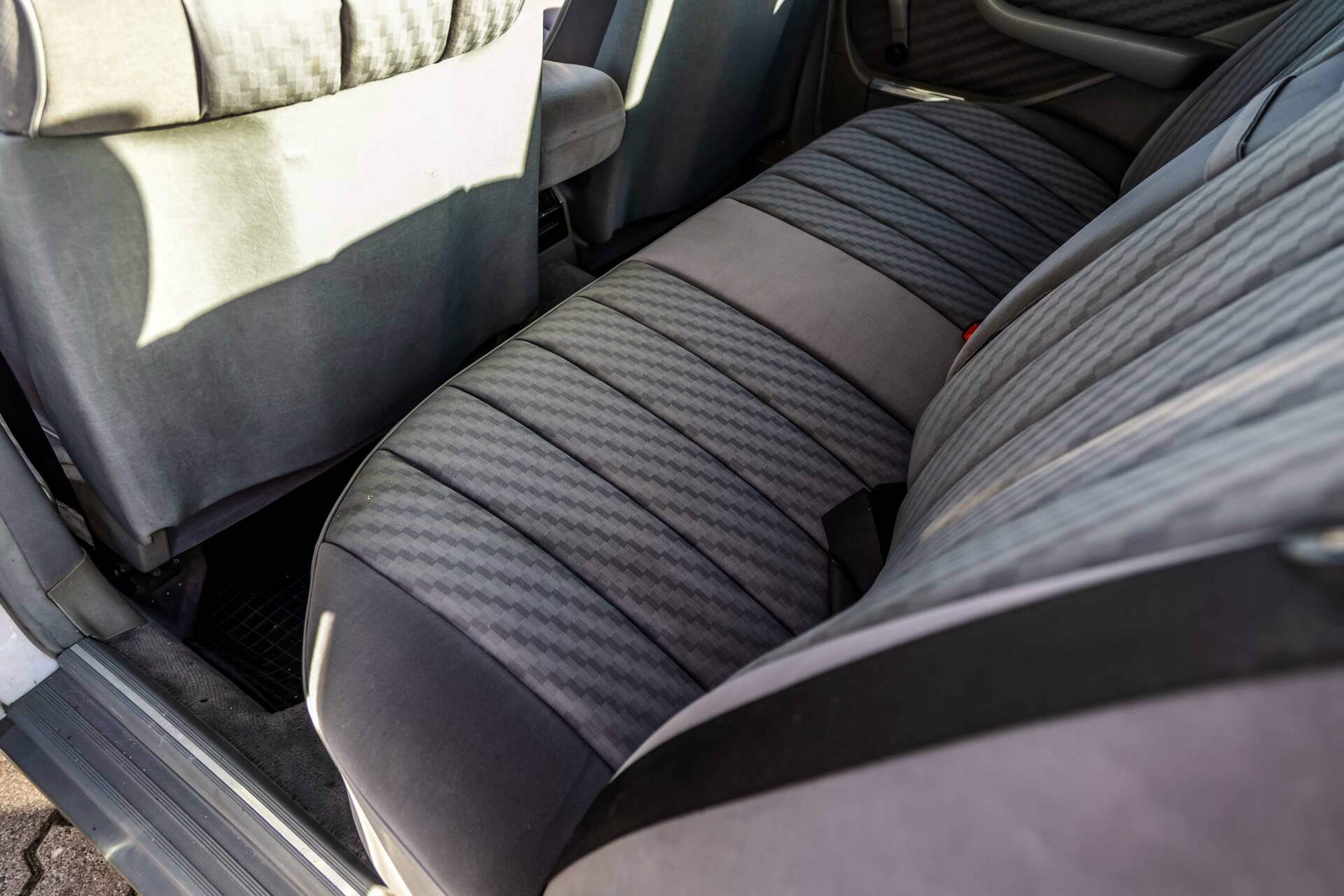 Keine vergilbten Ledersitze oder wilde Umbauten. Stattdessen ein sachlicher, aber gepflegter Innenraum in grauem Stoff. Hier fühlt man sich eher wie in einem gut klimatisierten Vorstandsbüro als in einem Auto.